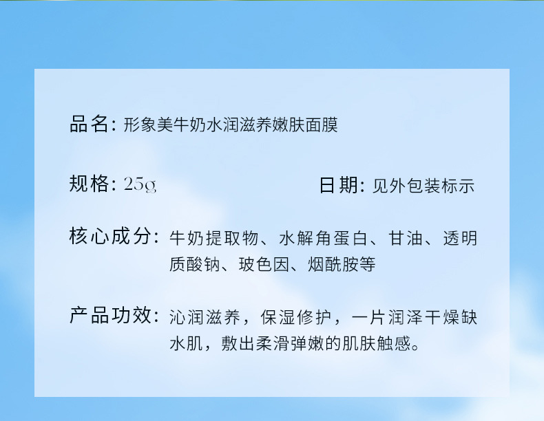 形象美牛奶水润滋养嫩肤面膜 补水保湿收缩毛孔提靓肤色面膜 中文
