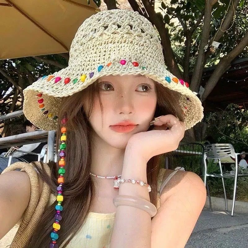 草帽海边帽子ins系带草编帽女出游防晒沙滩太阳帽蕾丝遮阳帽