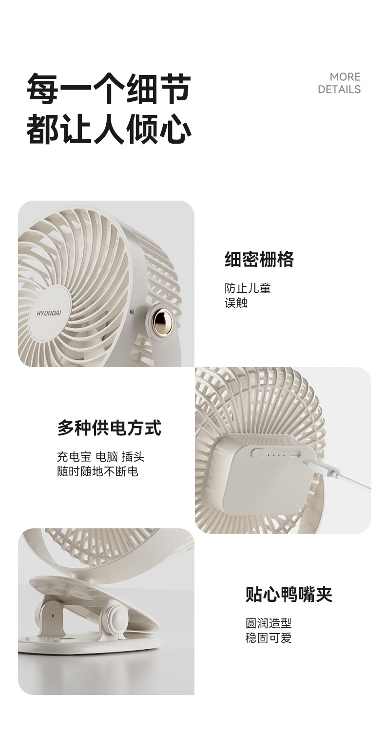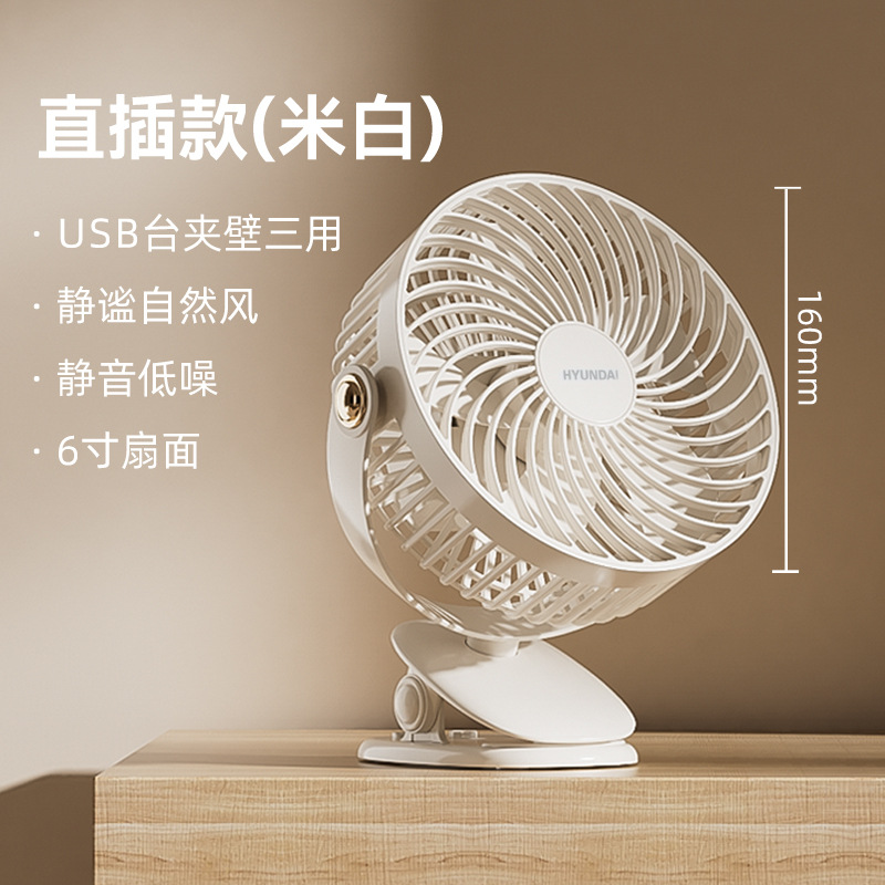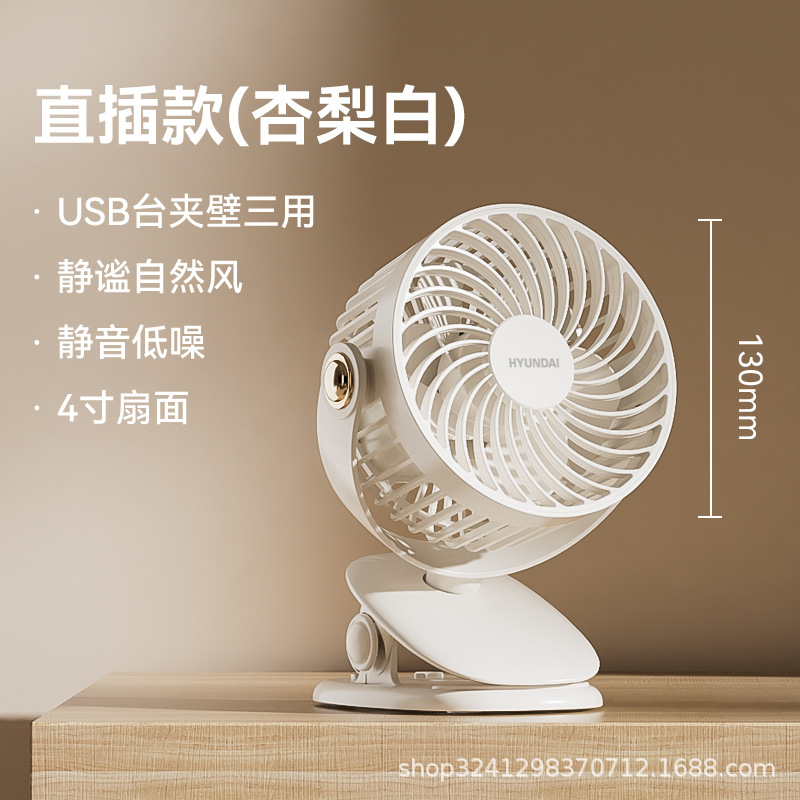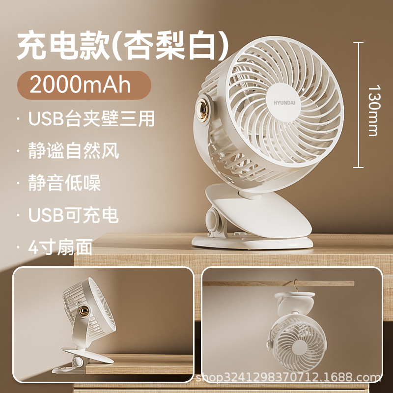HYUNDAI迷你风扇 办公桌面学生宿舍3档轻音便携式充电USB夹子风扇