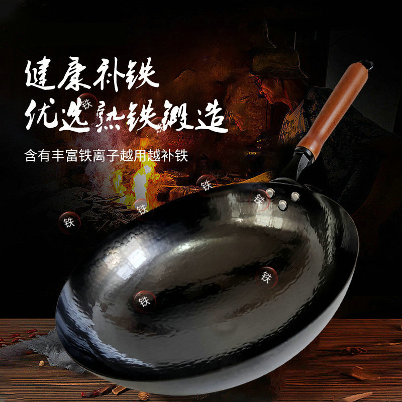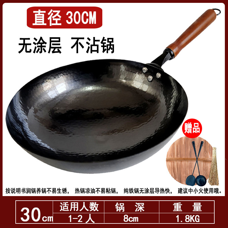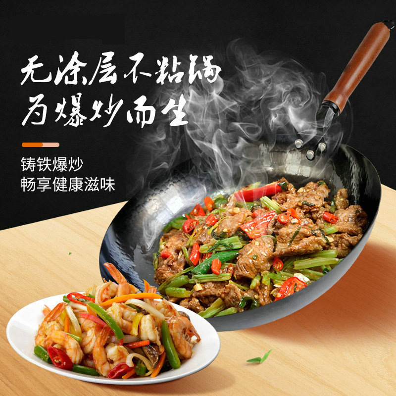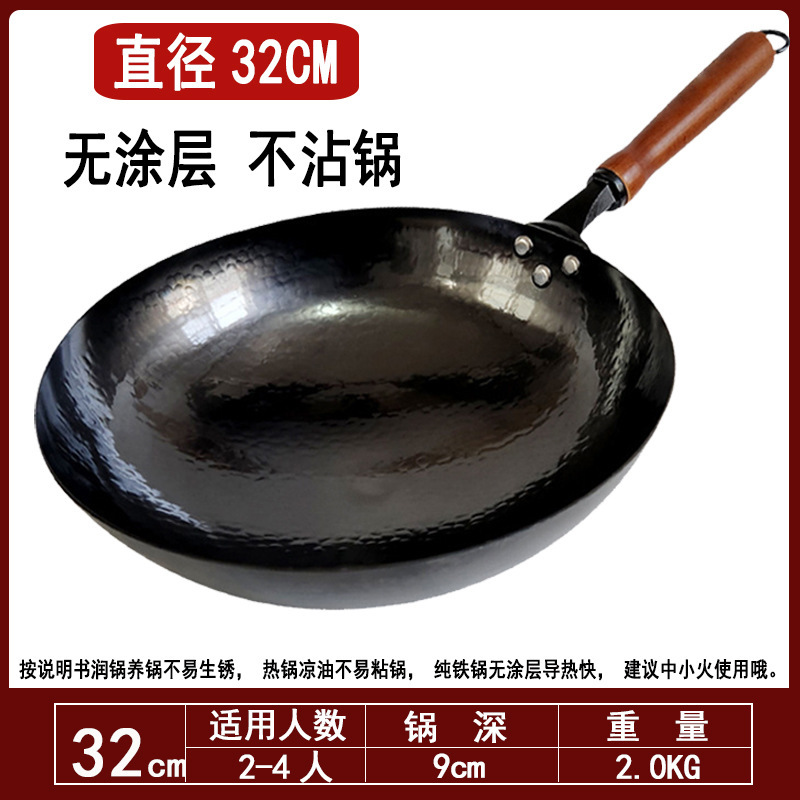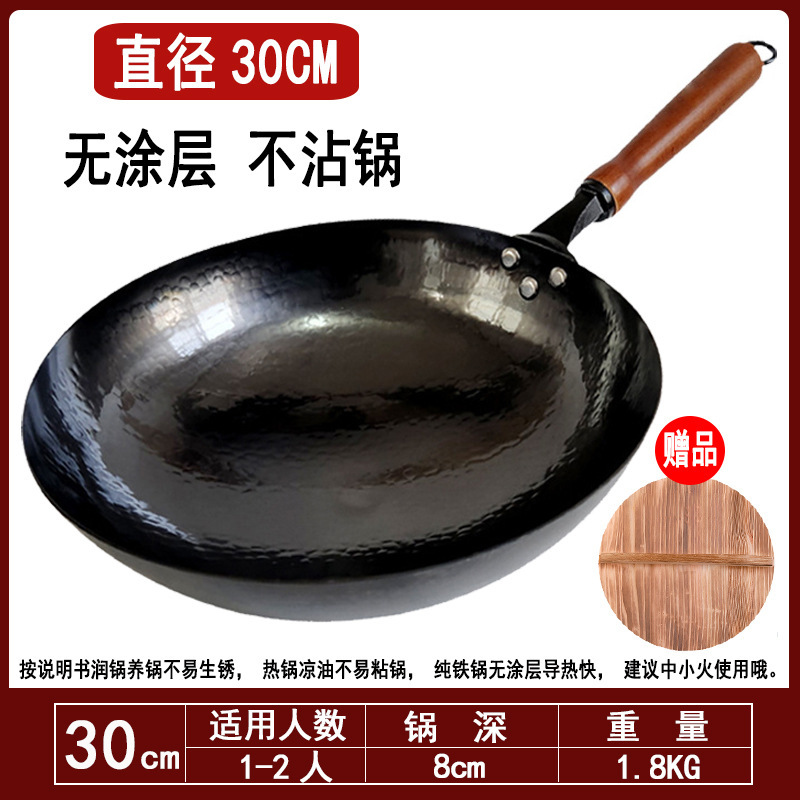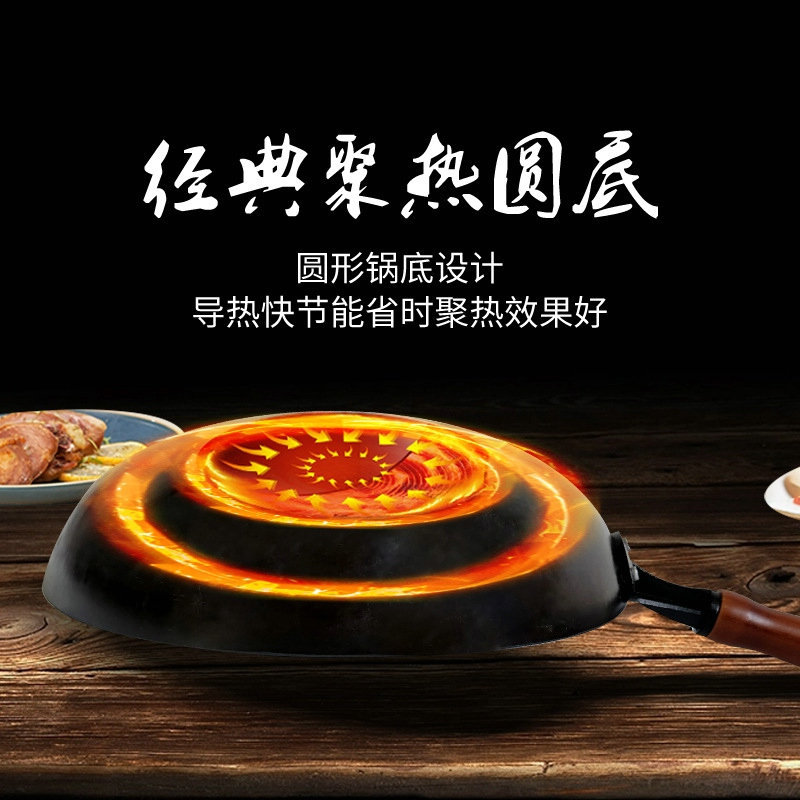 章丘手工铁锅炒锅家用无涂层不粘锅炒菜锅 老式燃气灶木把手铁锅