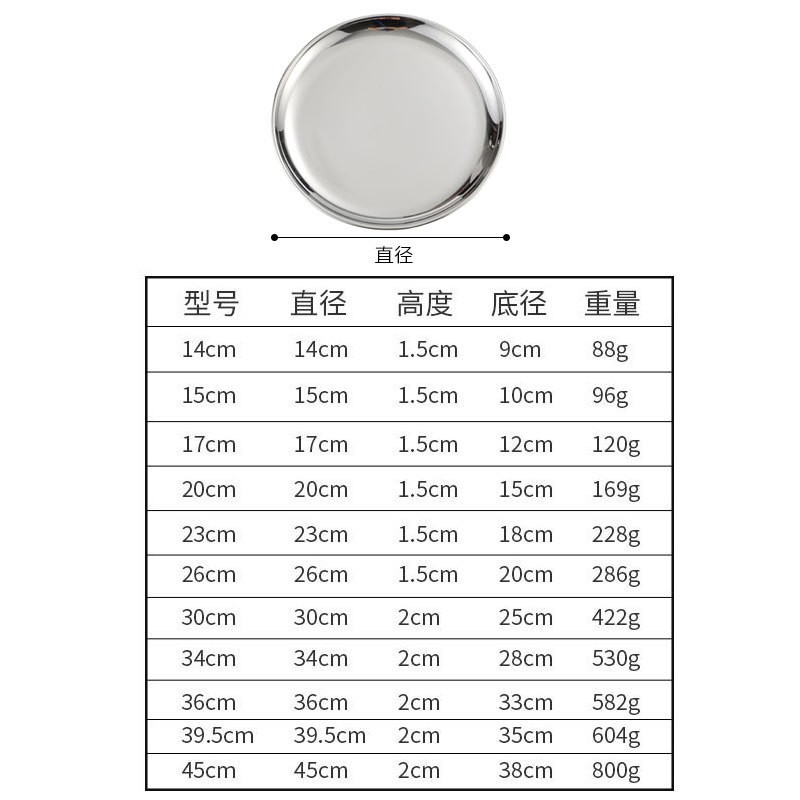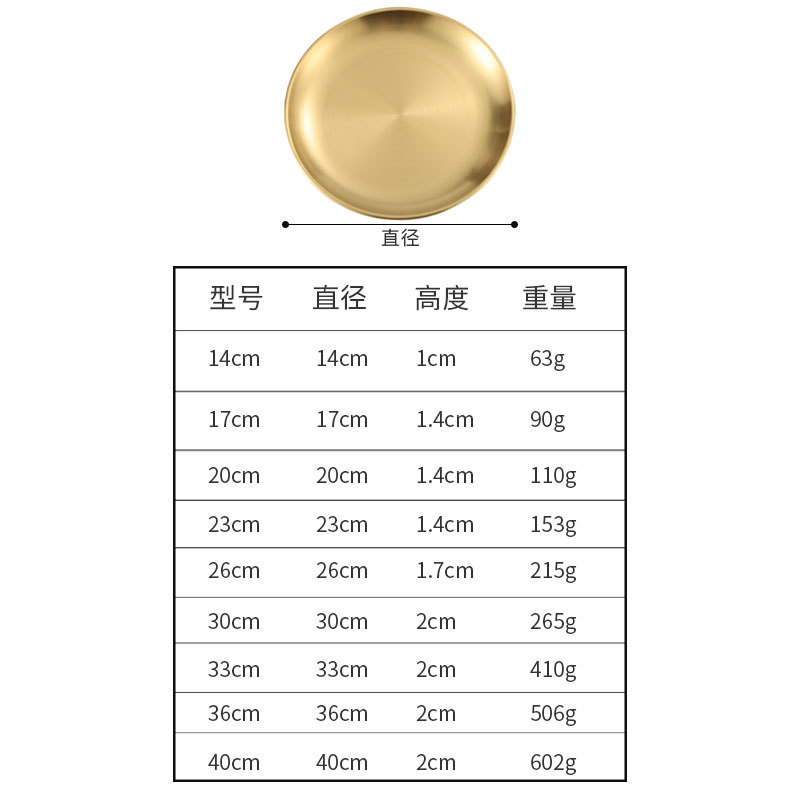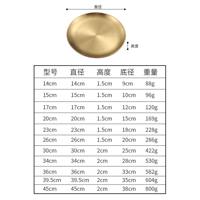 韩式304不锈钢圆盘商用金色烤肉盘托盘蛋糕盘骨碟浅盘子定制logo