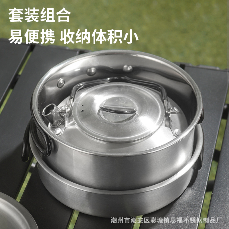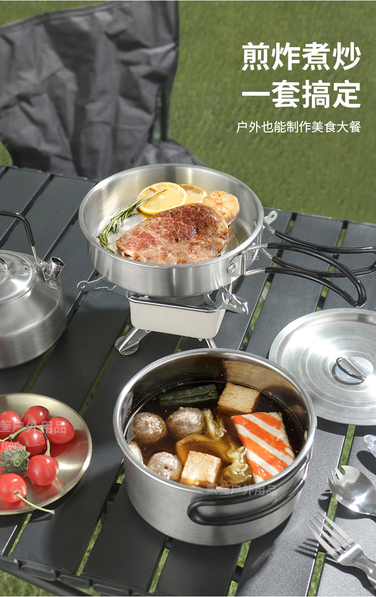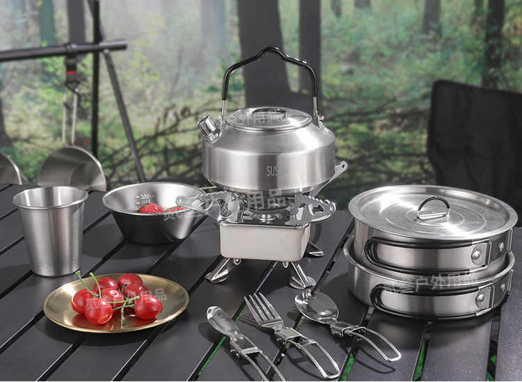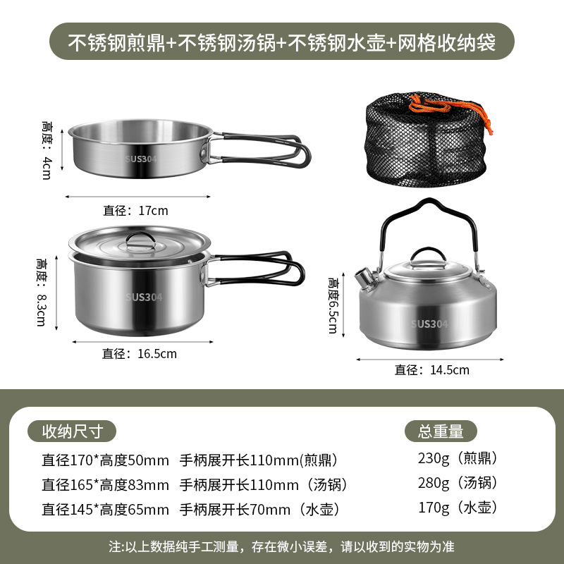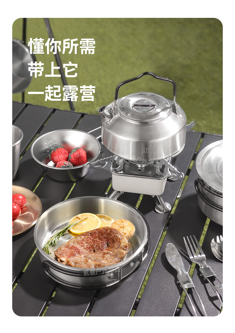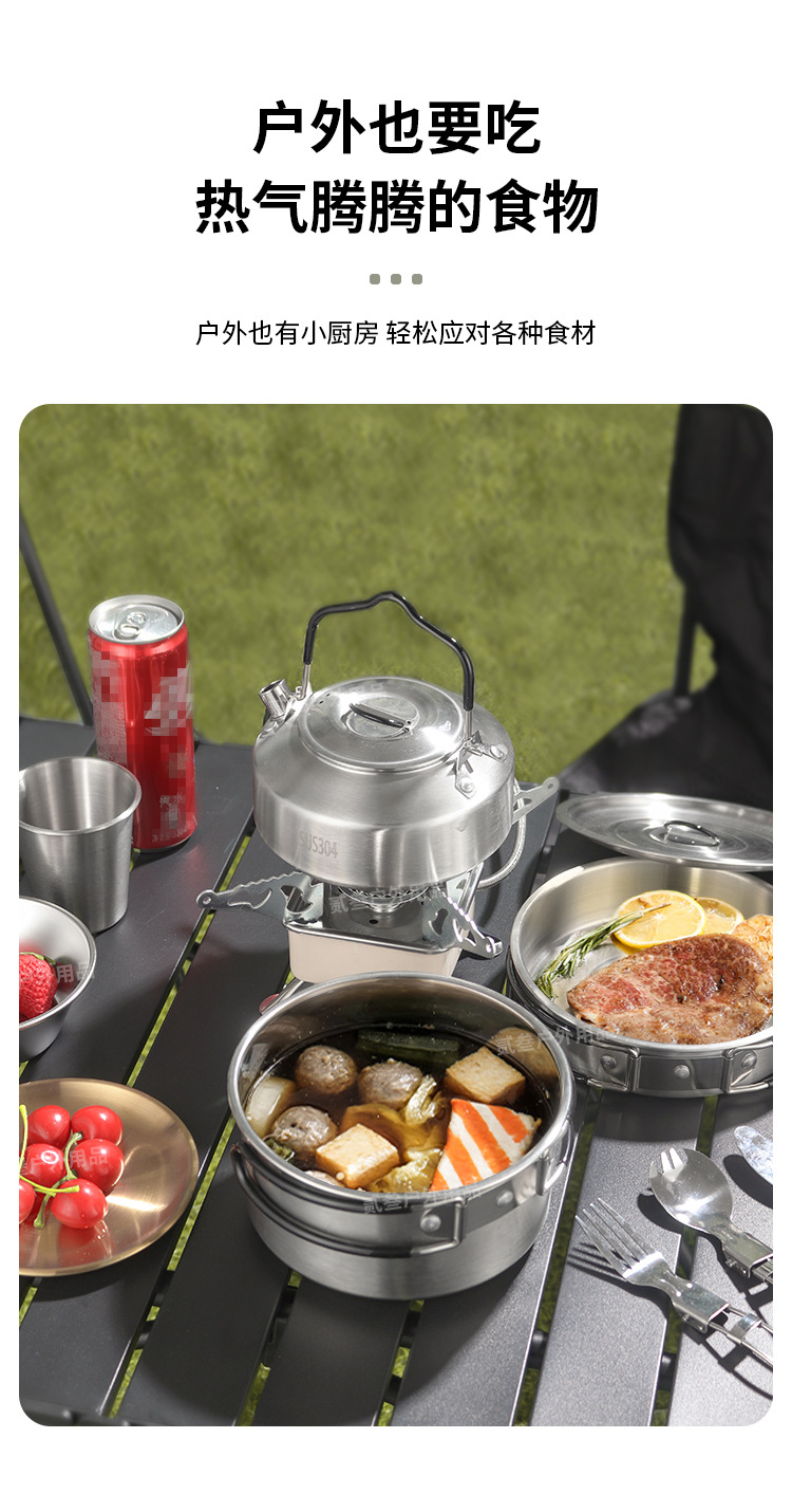 304不锈钢便携式露营炊具野营套锅套装用品户外折叠式烧水壶锅具