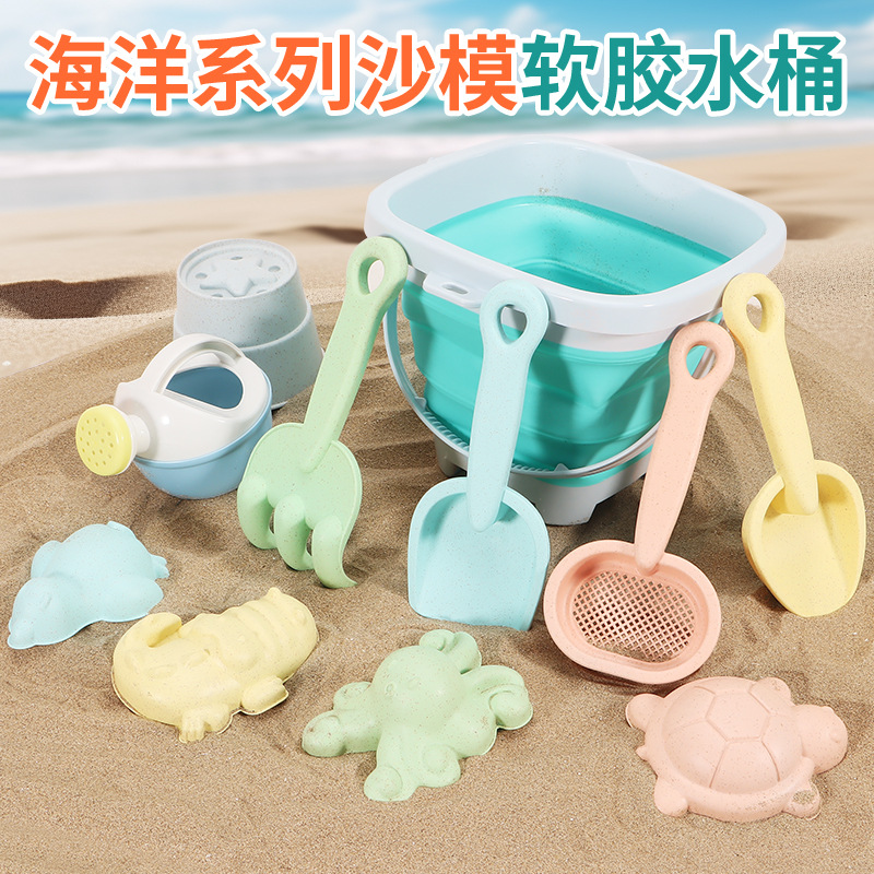 跨境亚马逊儿童沙滩折叠桶11件套挖沙铲子海边玩沙工具套装批发