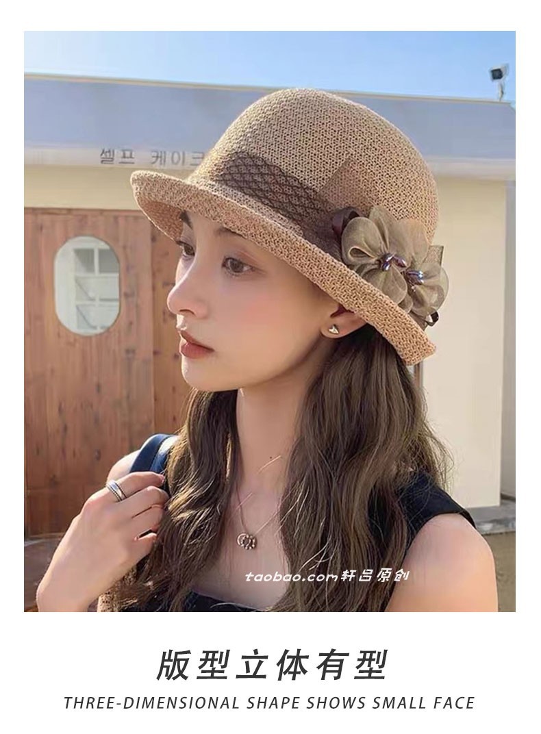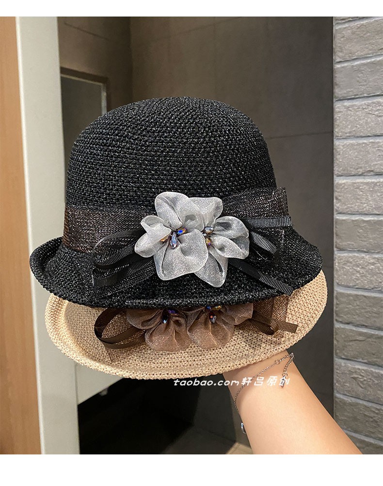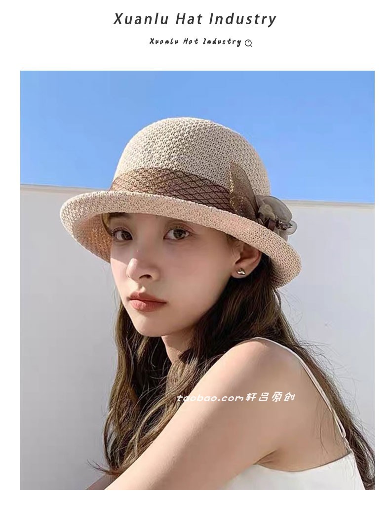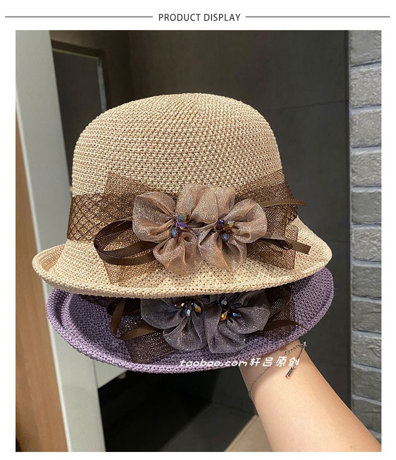 时尚英伦花朵礼帽女夏季遮阳防晒帽子法式卷边太阳帽户外网纱盆帽