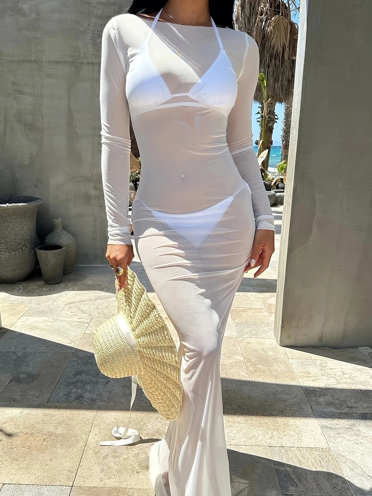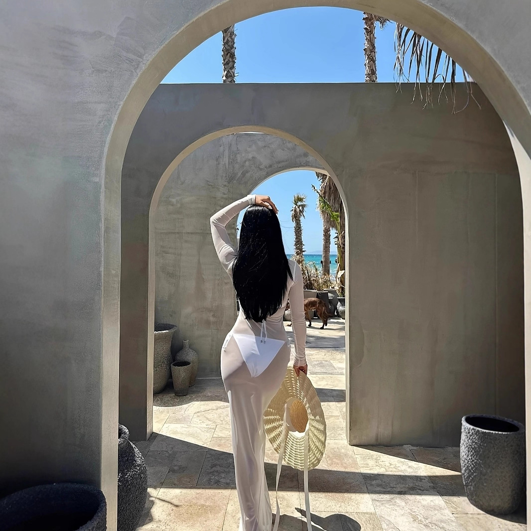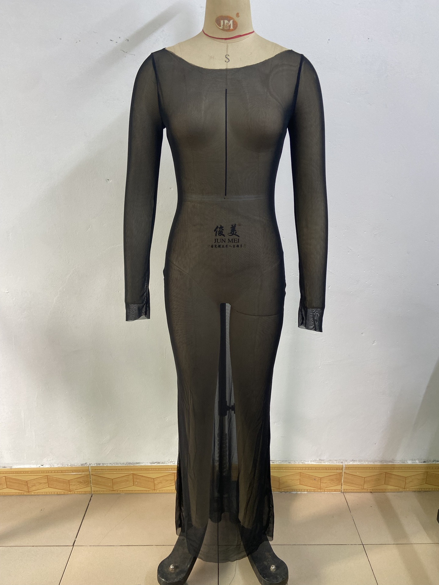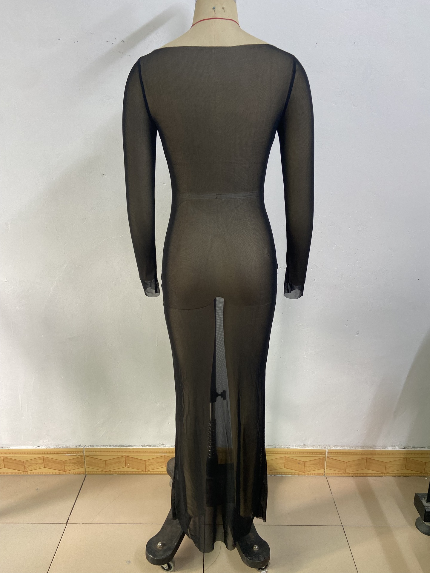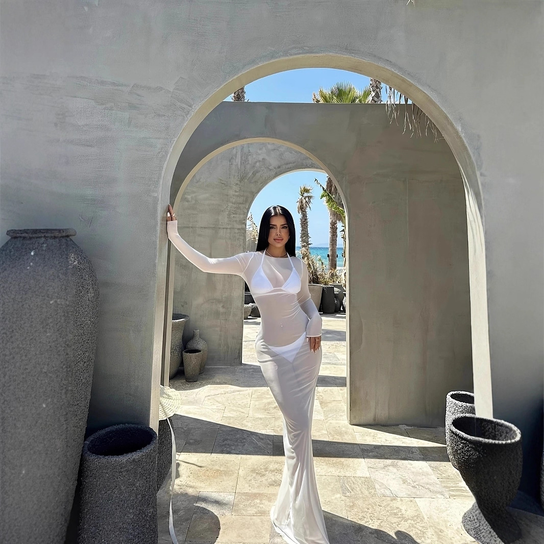 G25D089-2025夏季修身性感网纱透视长袖连衣裙长裙