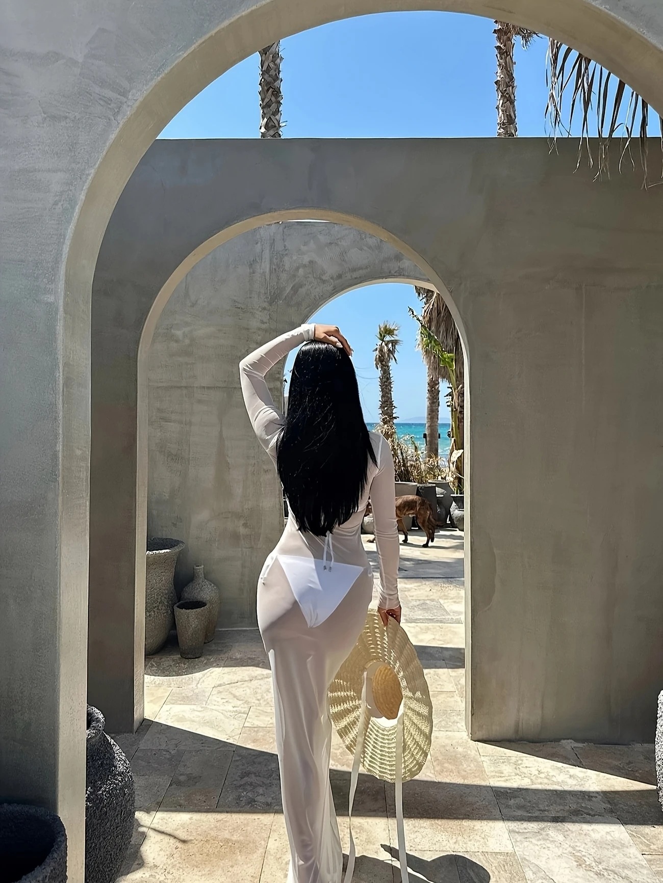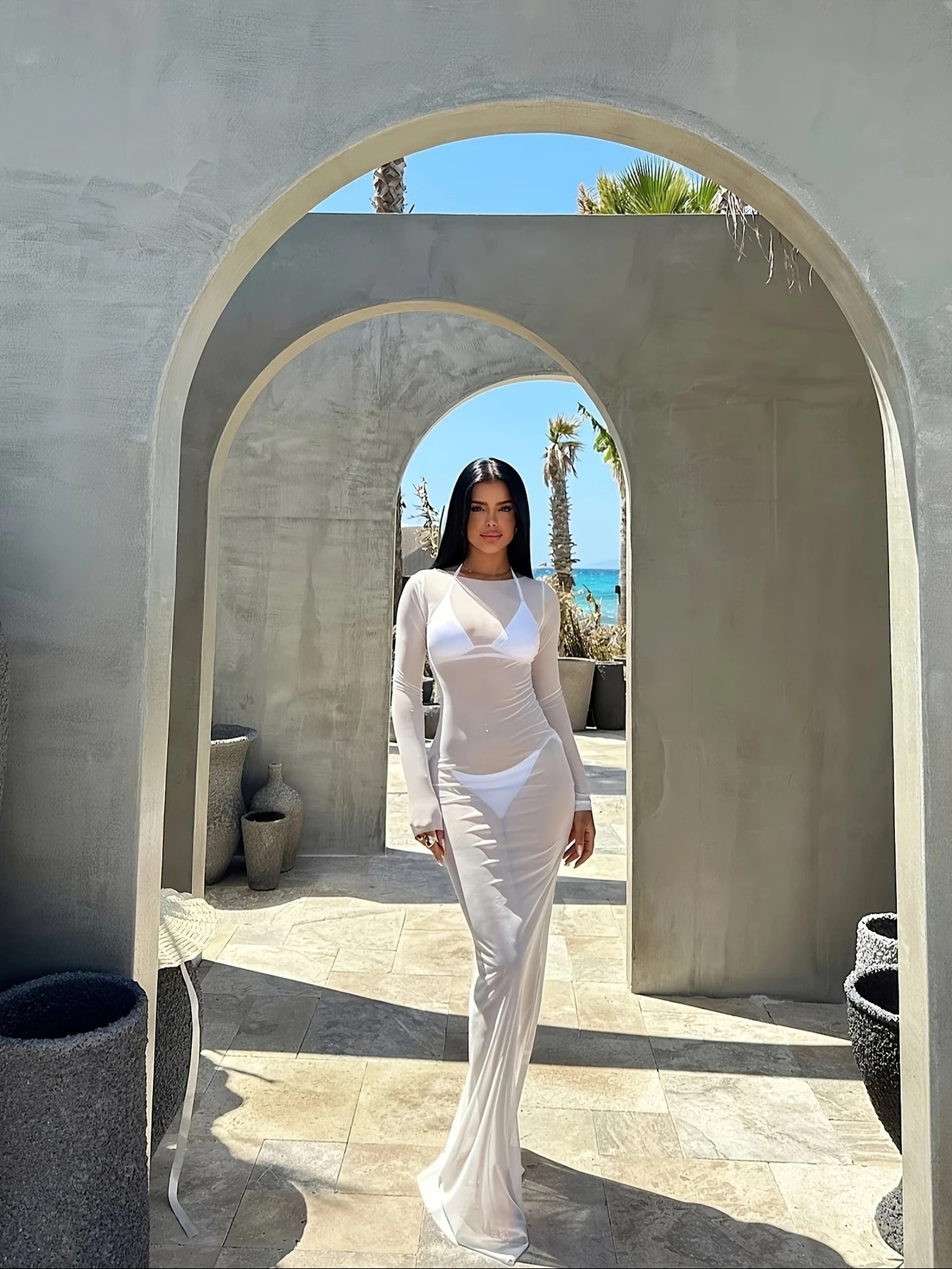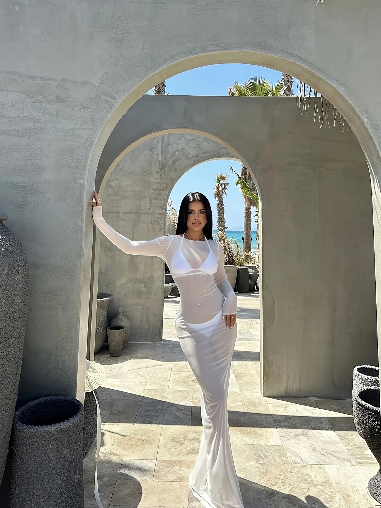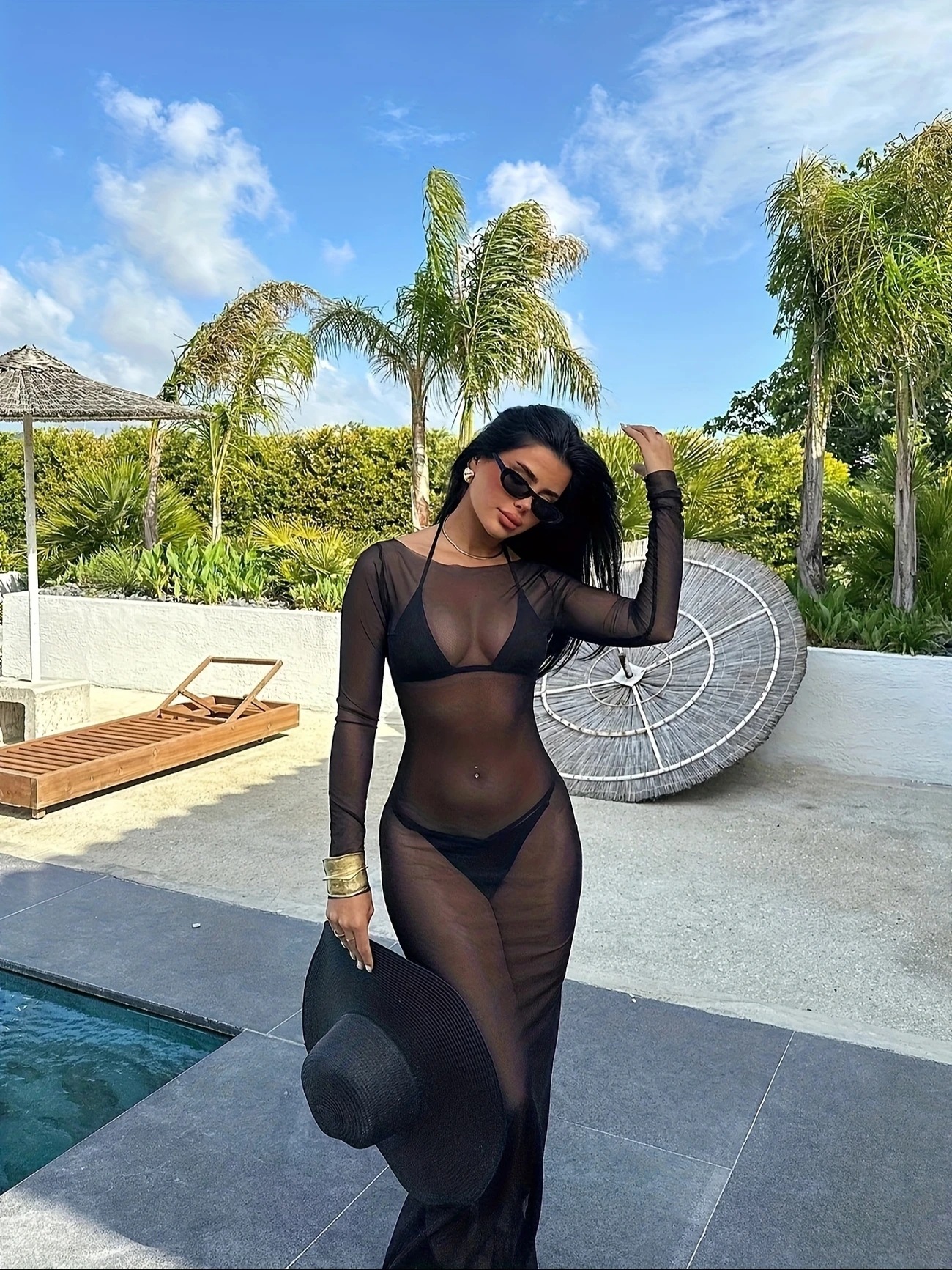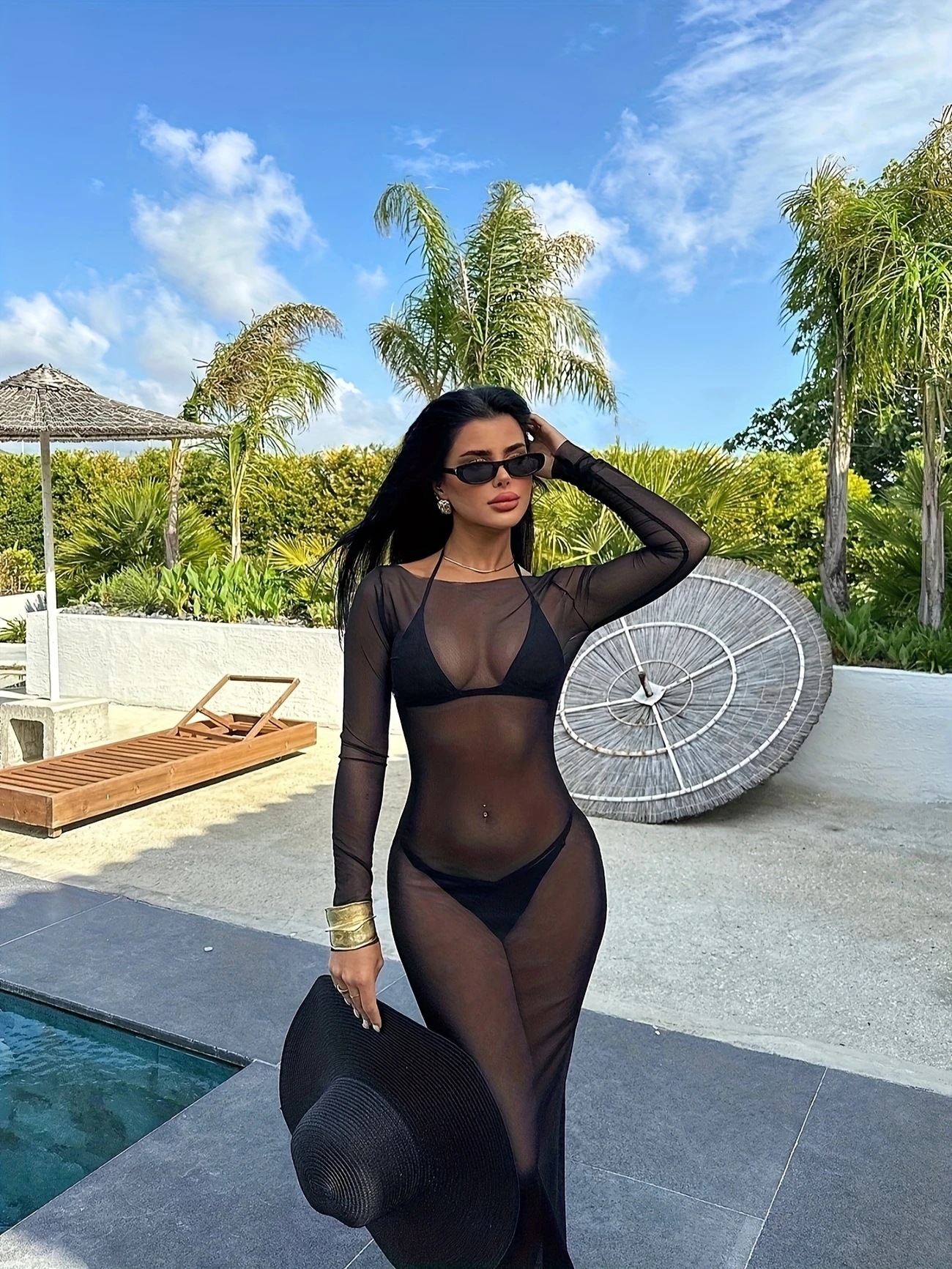 G25D089-2025夏季修身性感网纱透视长袖连衣裙长裙