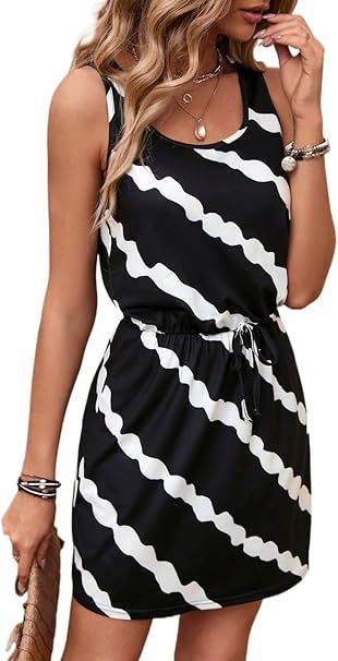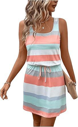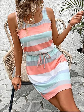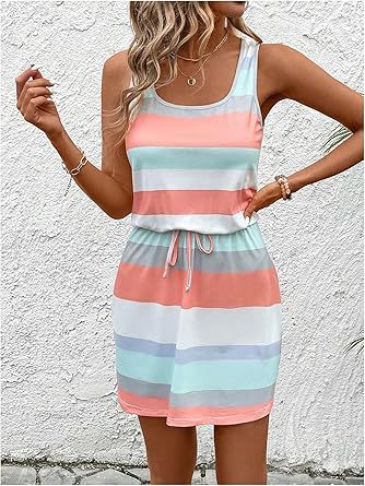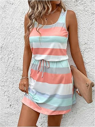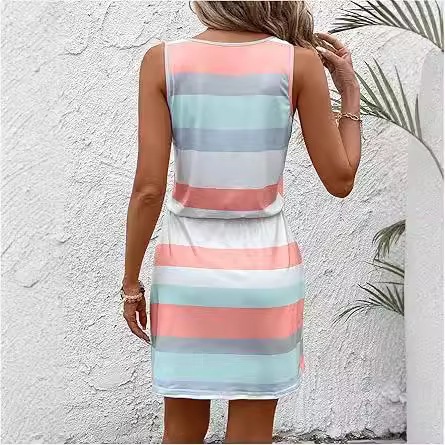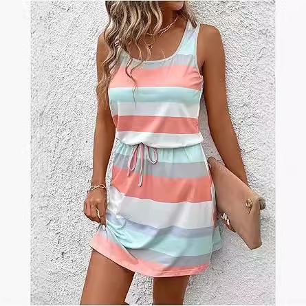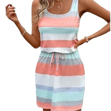 亚马逊欧美夏季圆领无袖条纹彩条纹海滩背心裙腰部抽绳欧美风度假