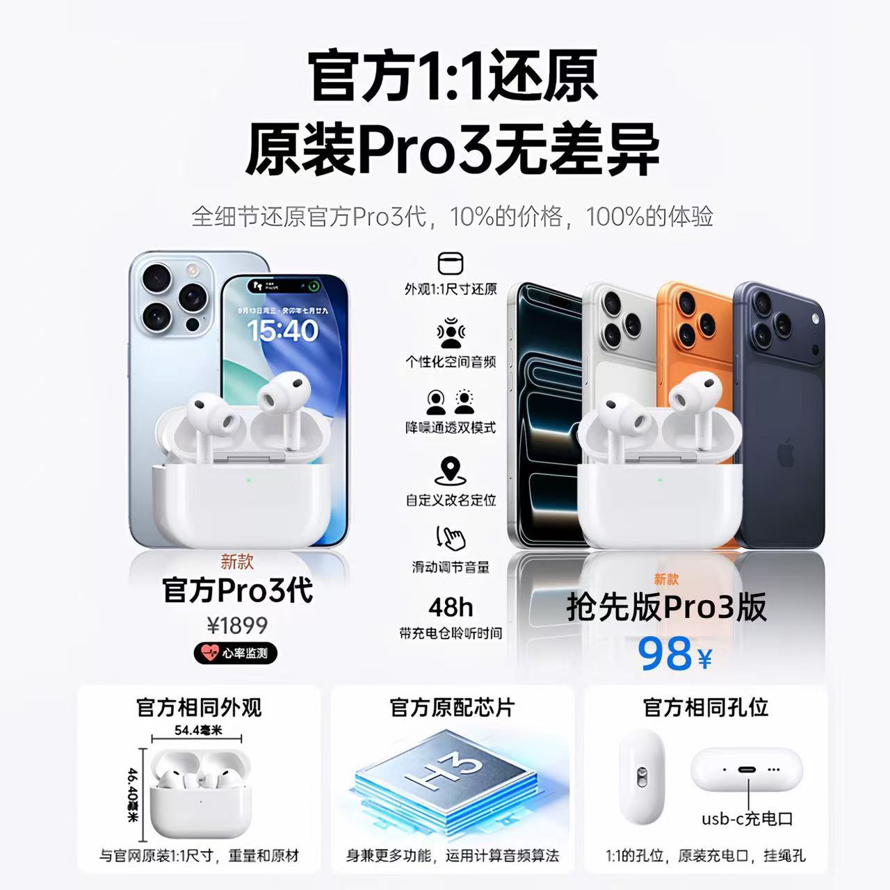 2025新款蓝牙耳机 华强北Pro3适用苹果原装主动降噪耳机蓝牙耳机