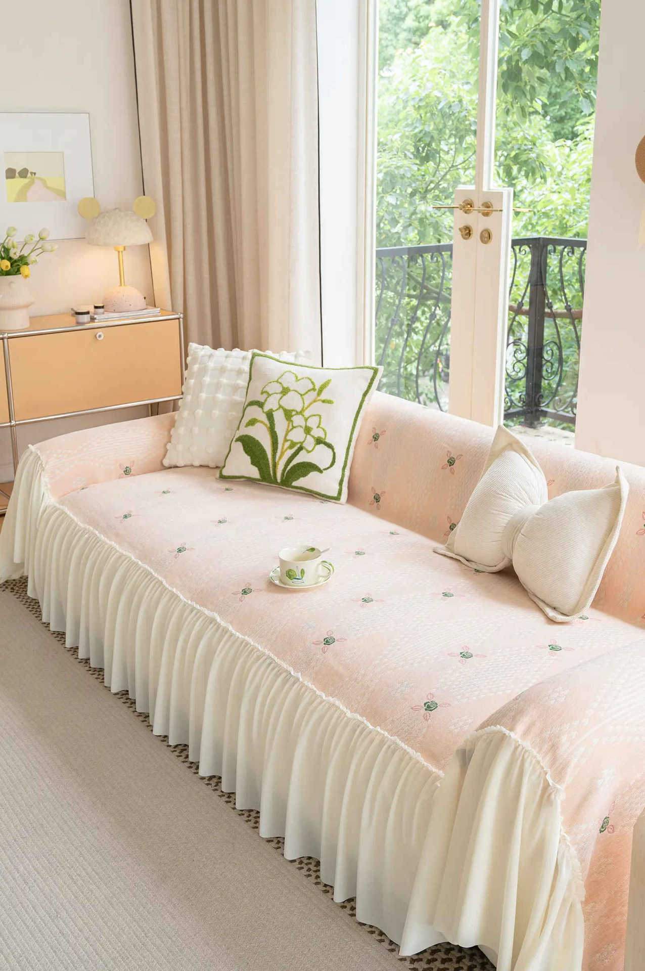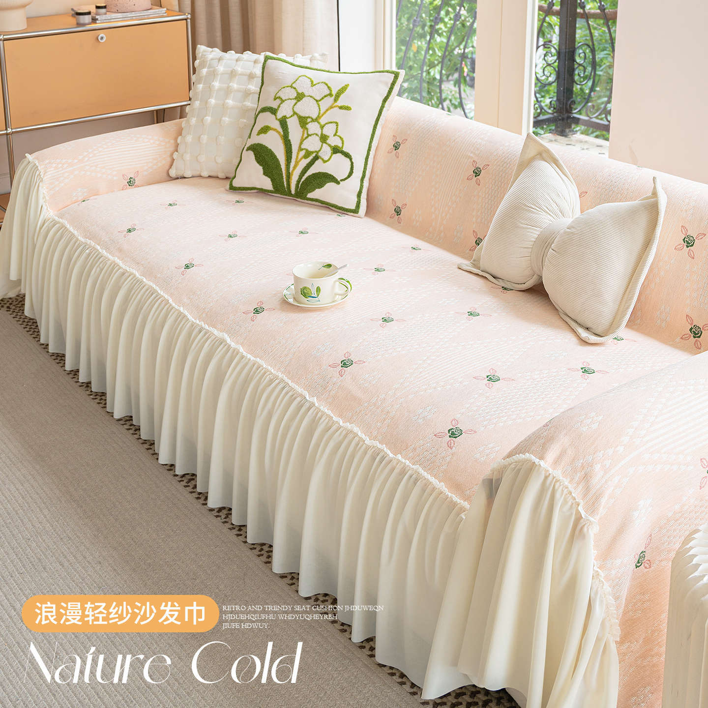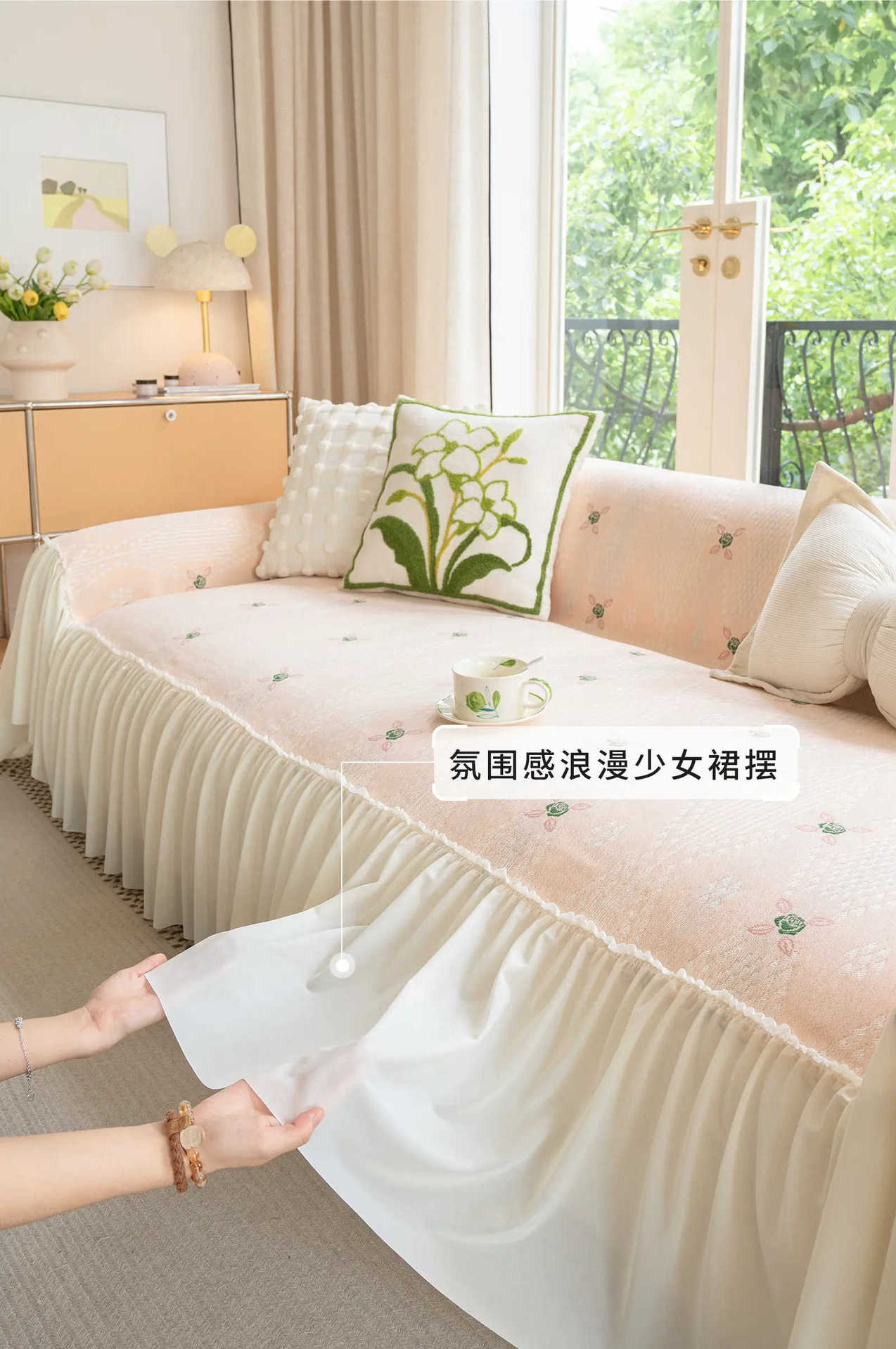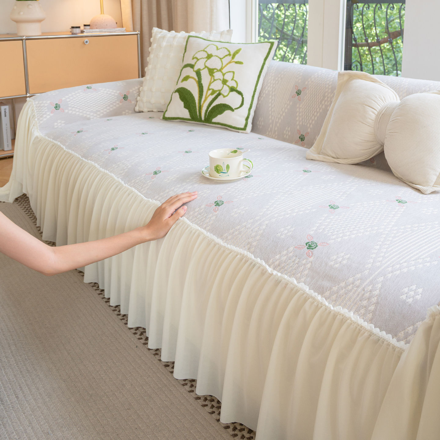 雪尼尔奶油风沙发巾蕾丝裙边2025新款防滑盖布懒人一片式沙发套罩