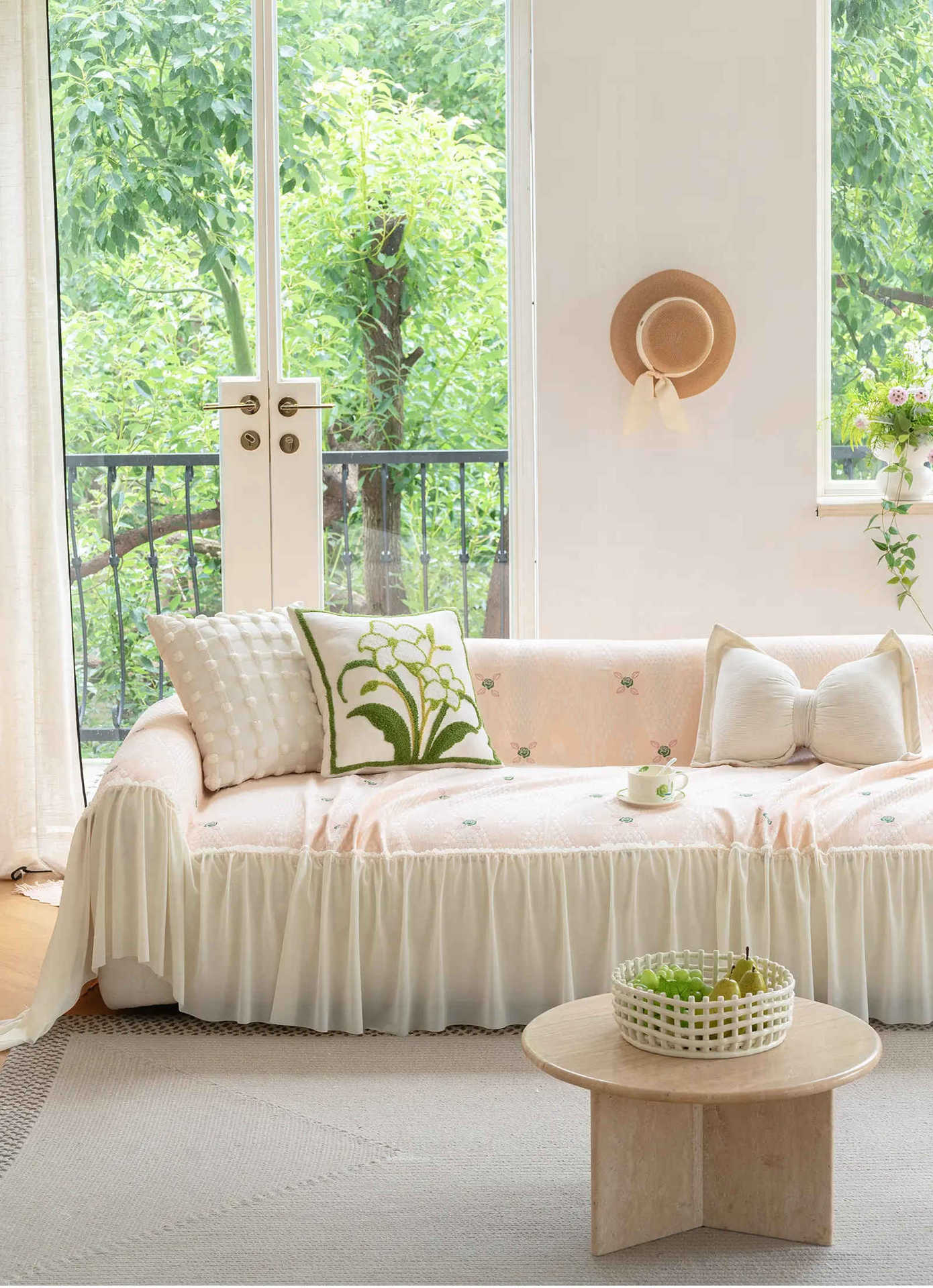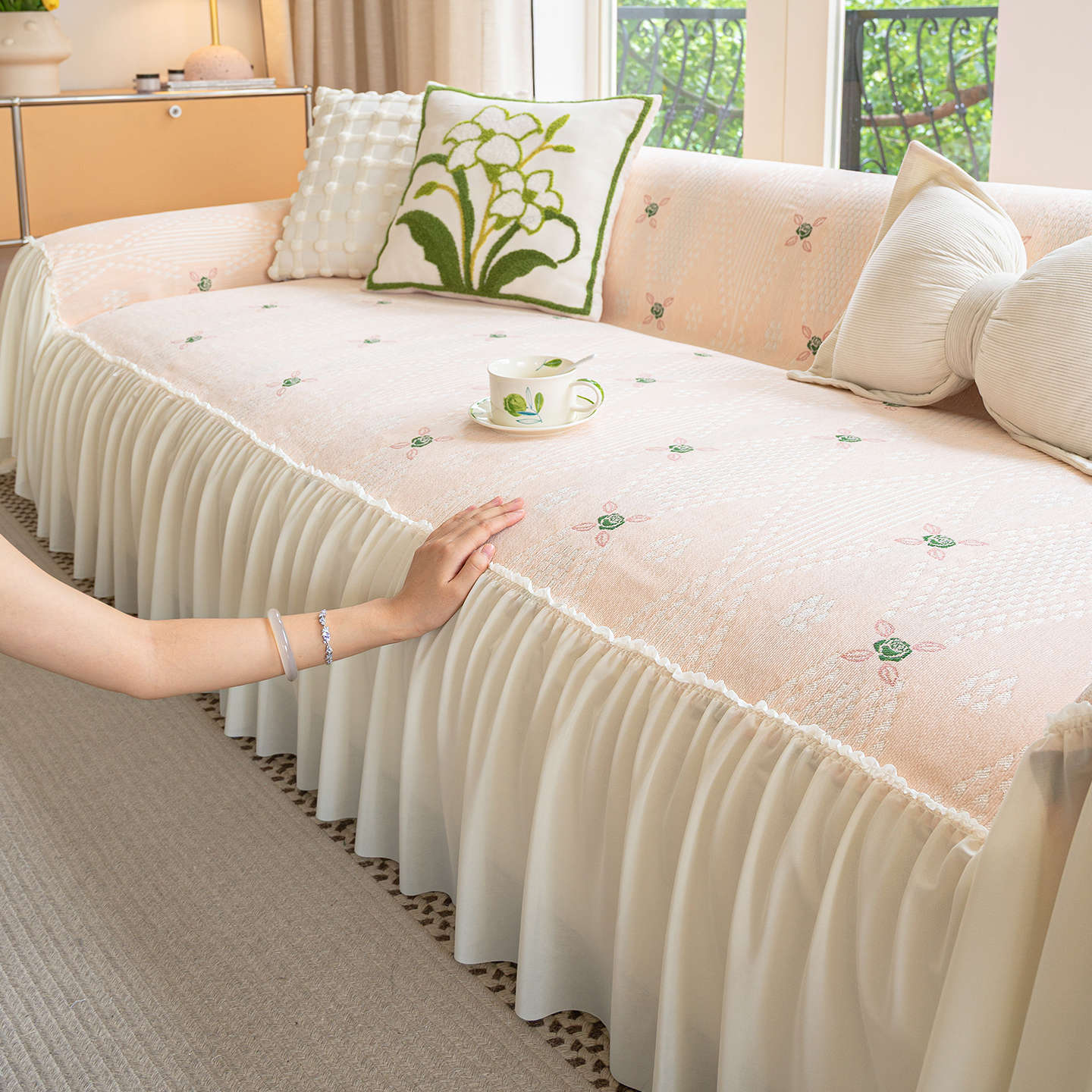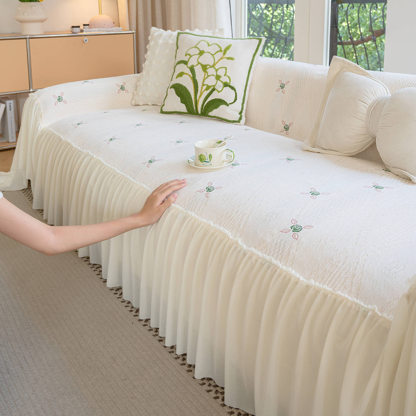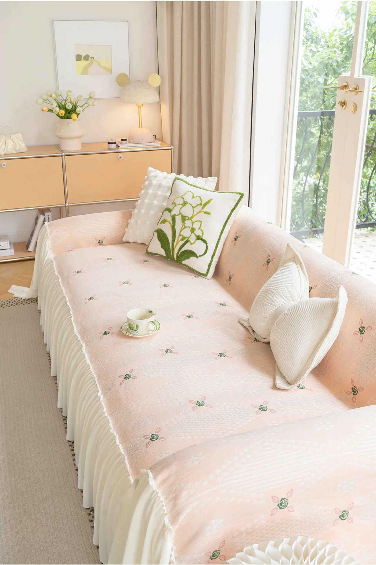 雪尼尔奶油风沙发巾蕾丝裙边2025新款防滑盖布懒人一片式沙发套罩