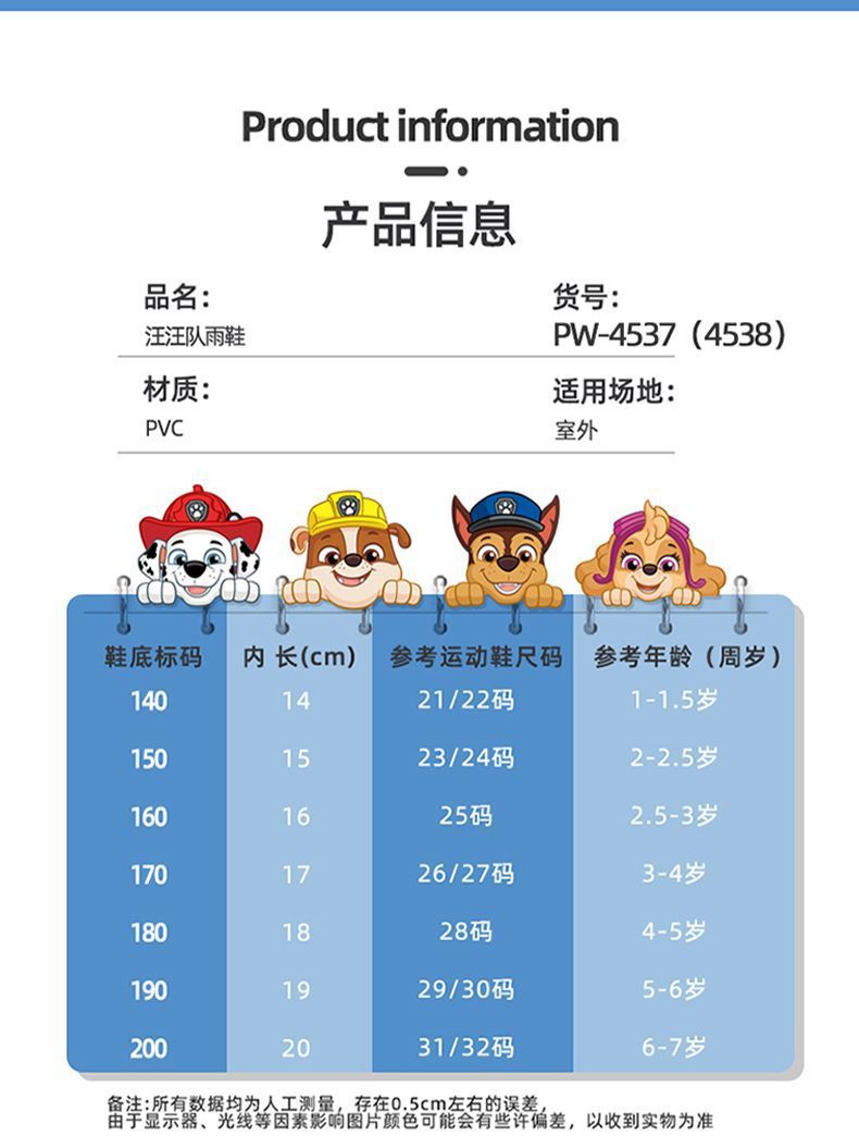 汪汪队立大功儿童雨鞋幼儿园上学专用卡通防滑防水束口小宝宝雨靴