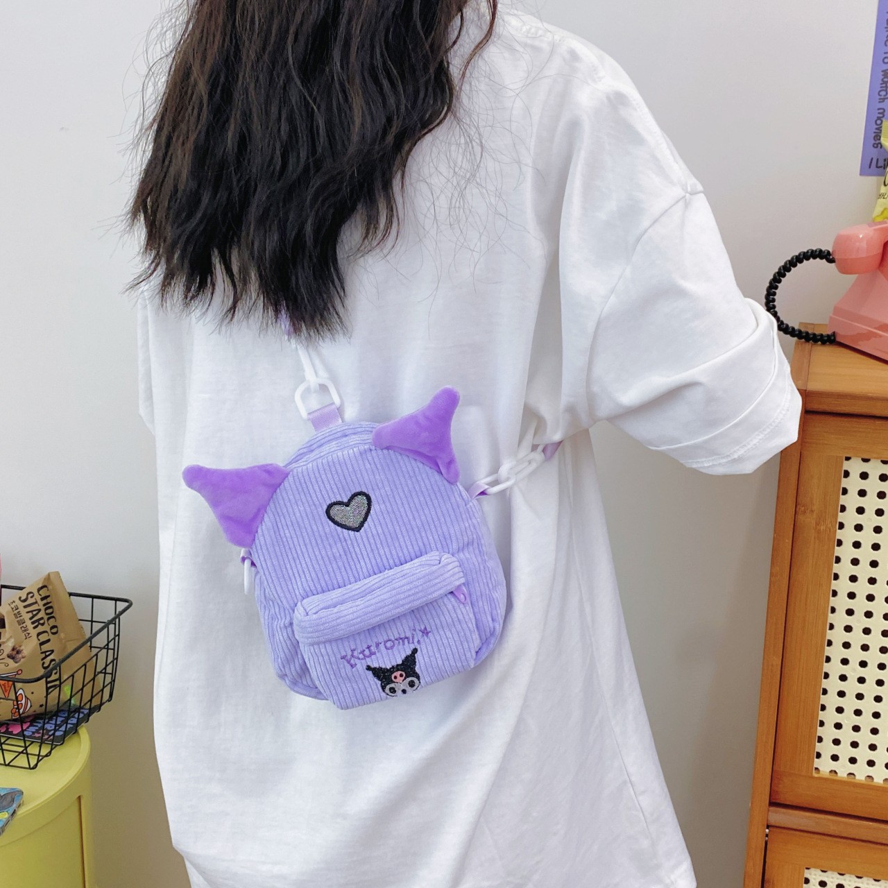 新款卡通条绒手机包女生斜跨化妆包儿童包零钱包双肩背包库洛米