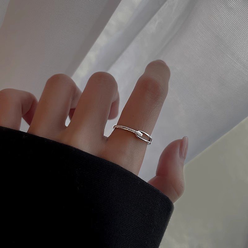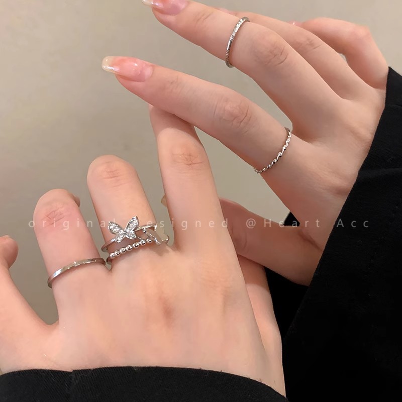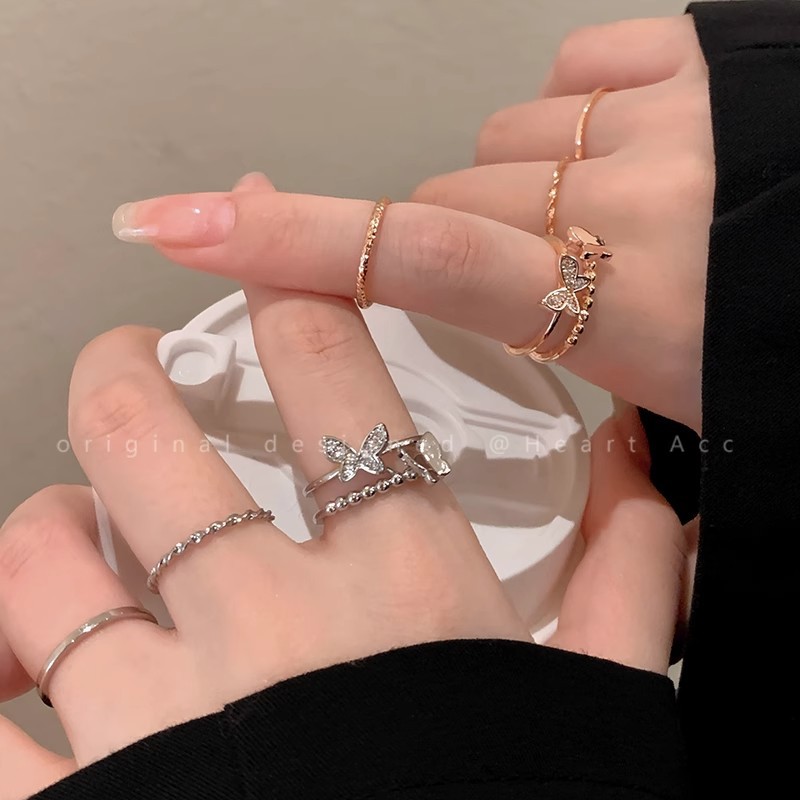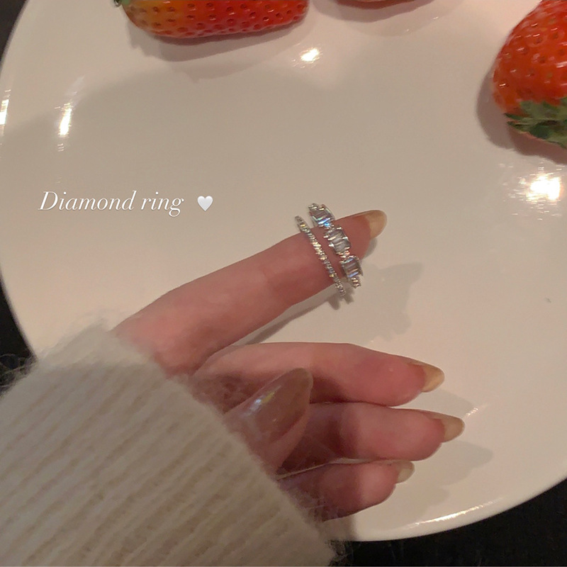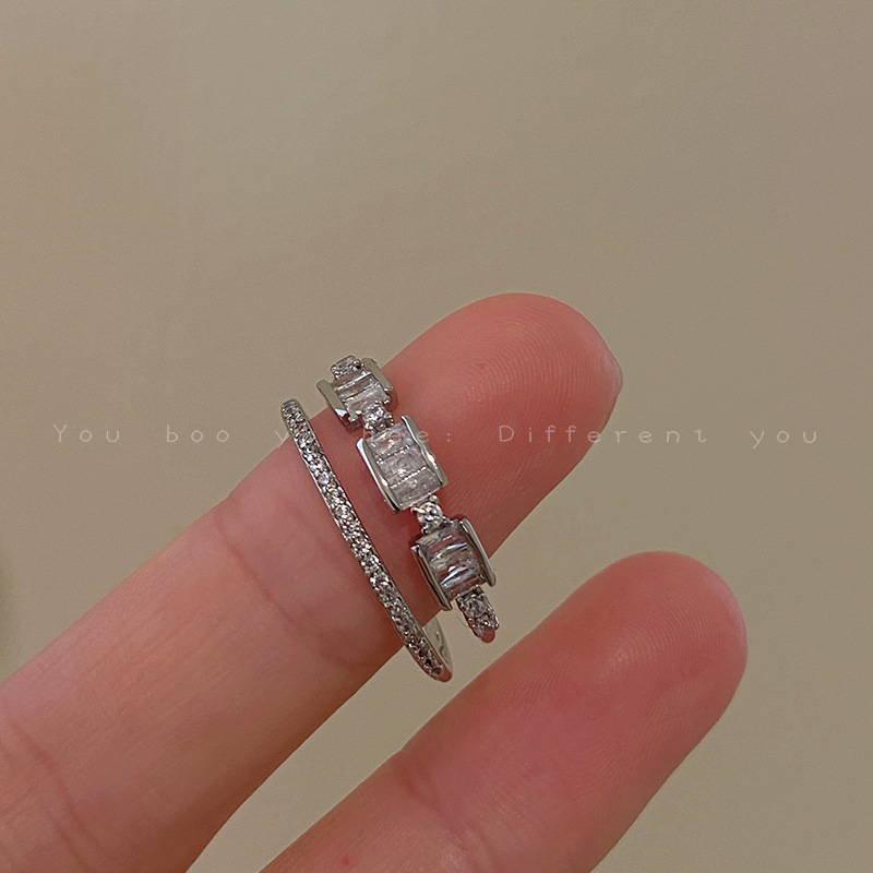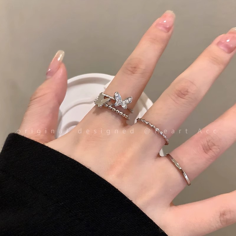 不掉色戒指小众设计高级感素圈锆石女叠戴套装ins开口戒轻奢个性