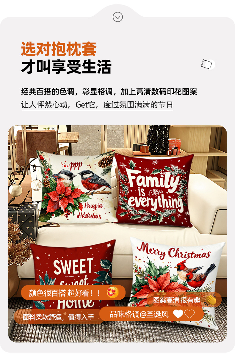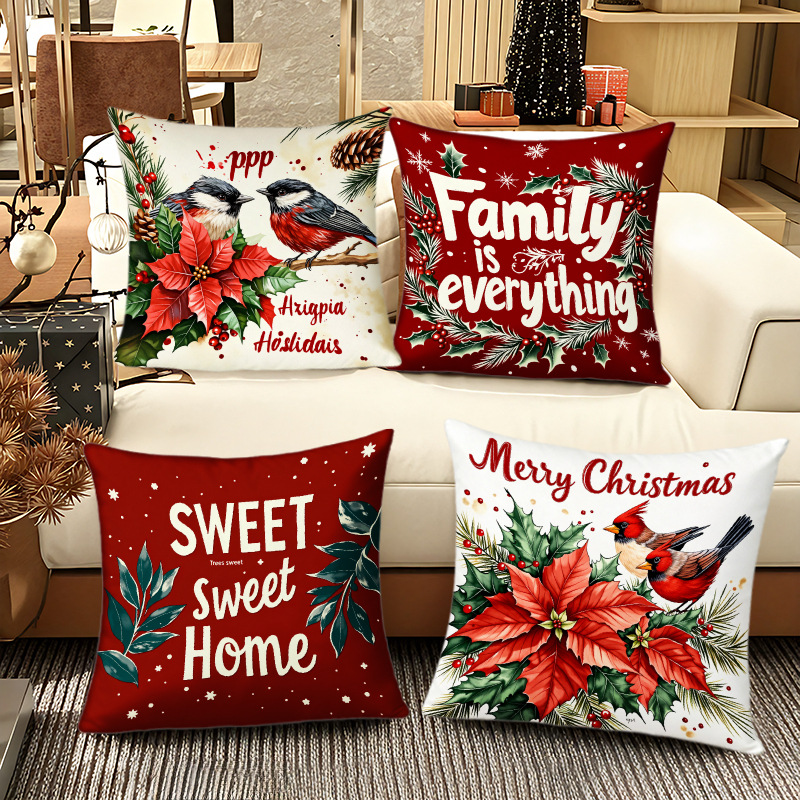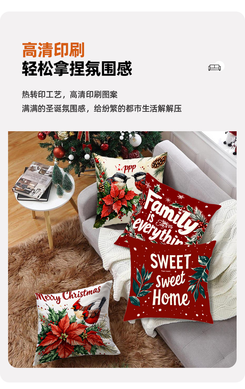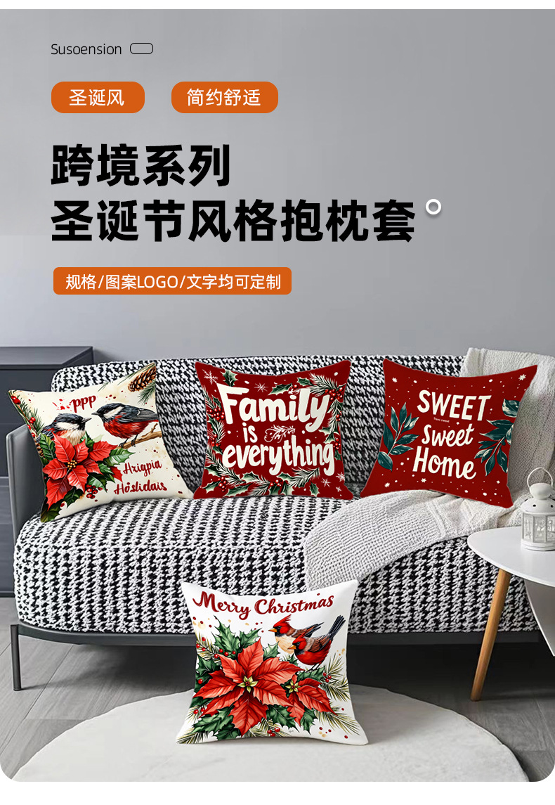 跨境热销圣诞主题抱枕套数码印花字母花卉节日氛围装饰靠垫靠枕套