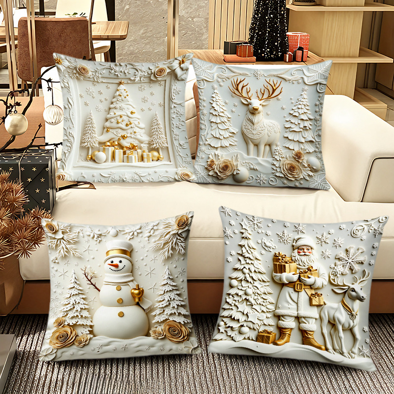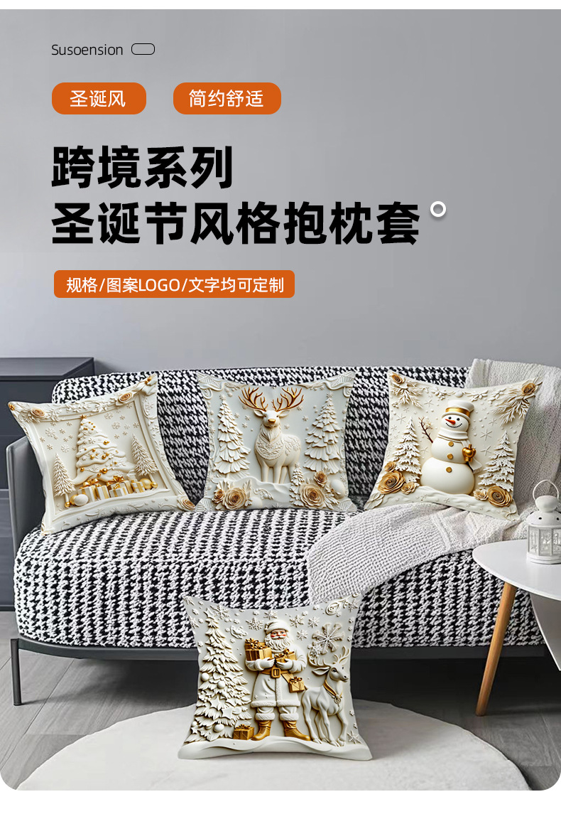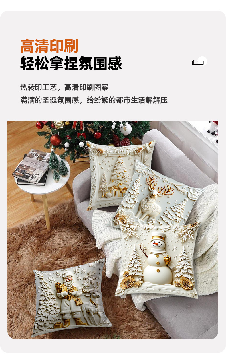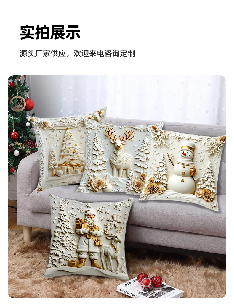 跨境热销金色圣诞风抱枕套短毛绒雪人麋鹿圣诞树家居装饰靠枕套