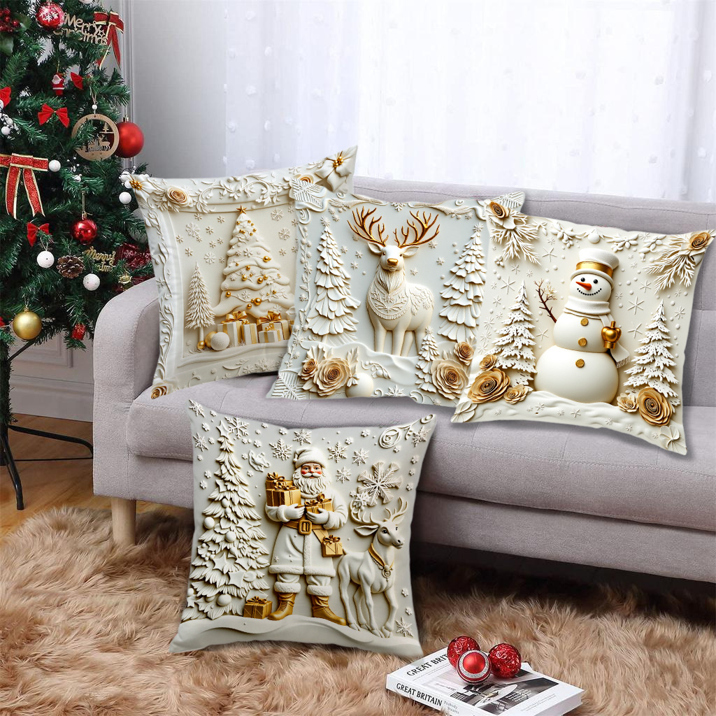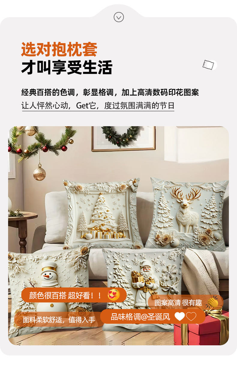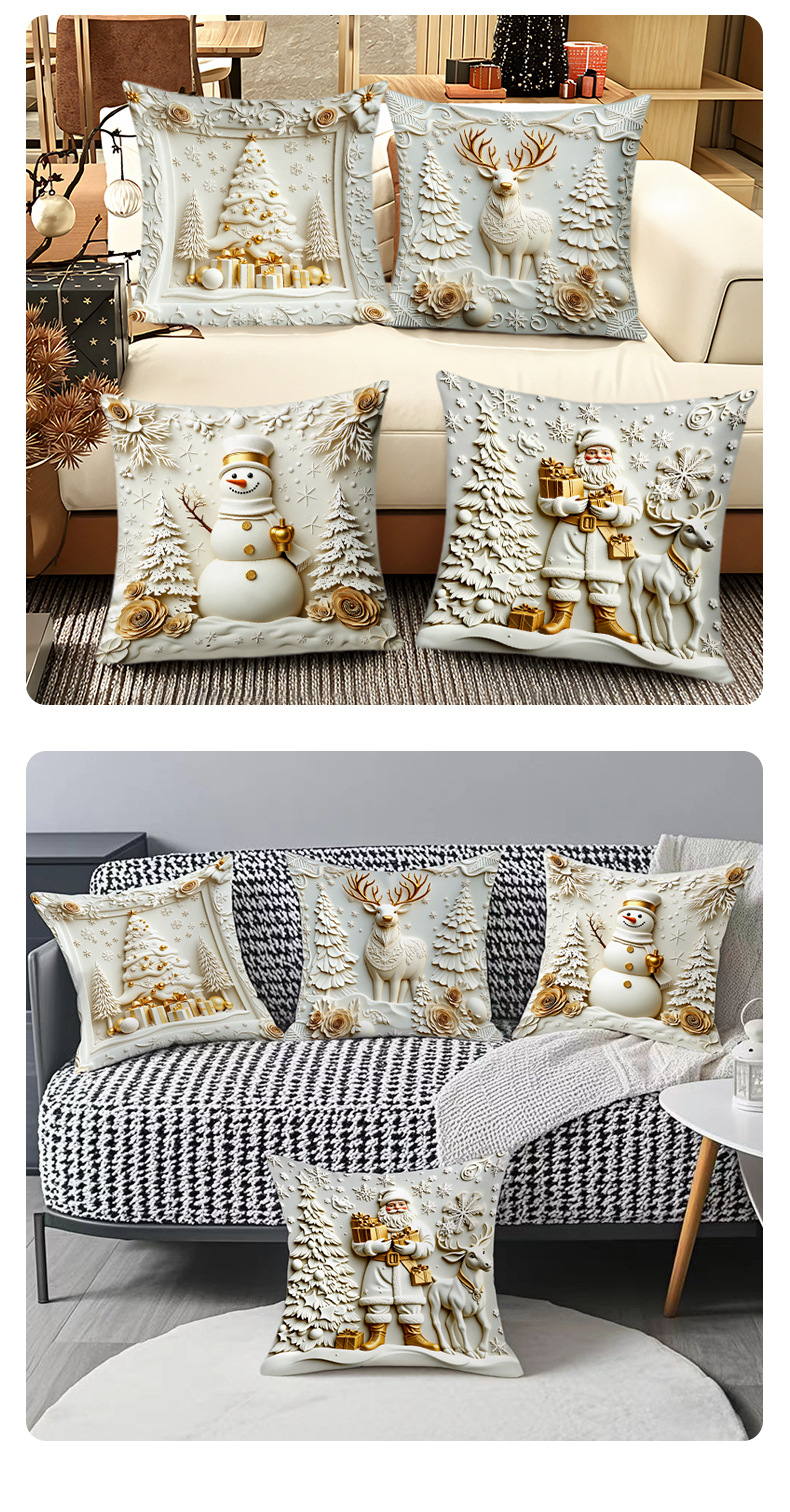 跨境热销金色圣诞风抱枕套短毛绒雪人麋鹿圣诞树家居装饰靠枕套