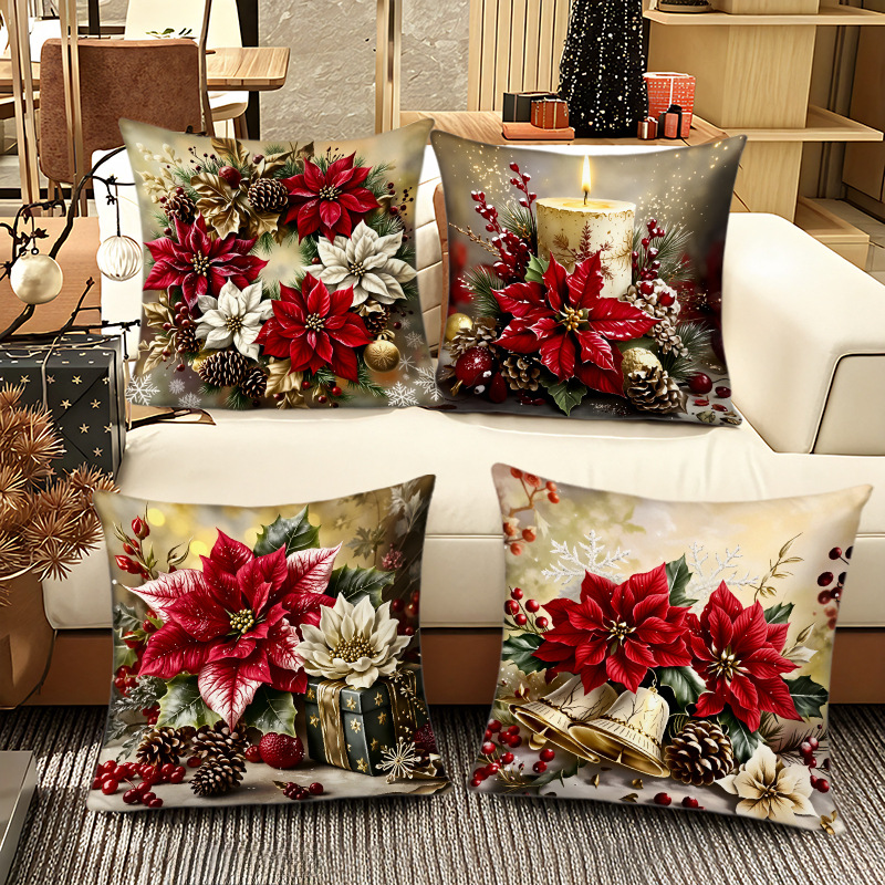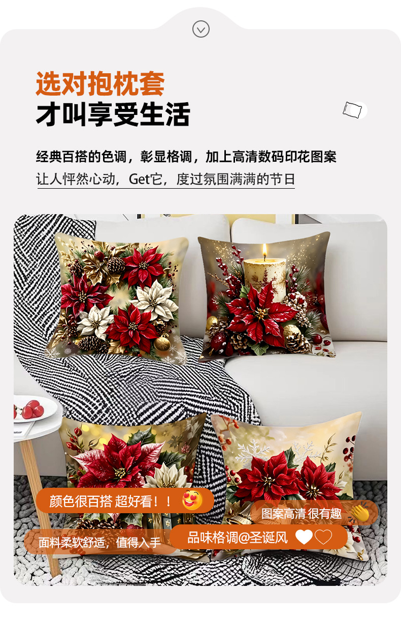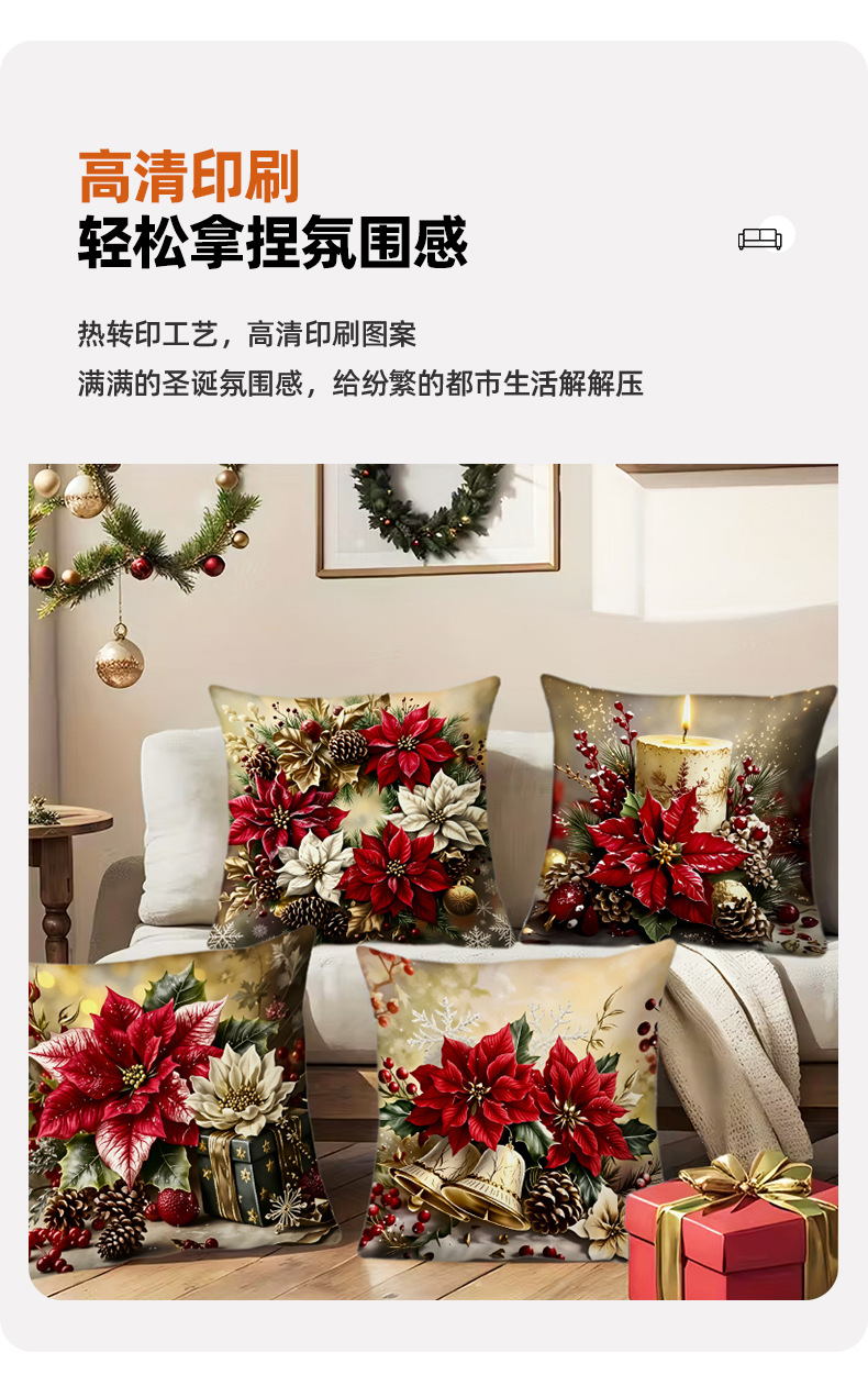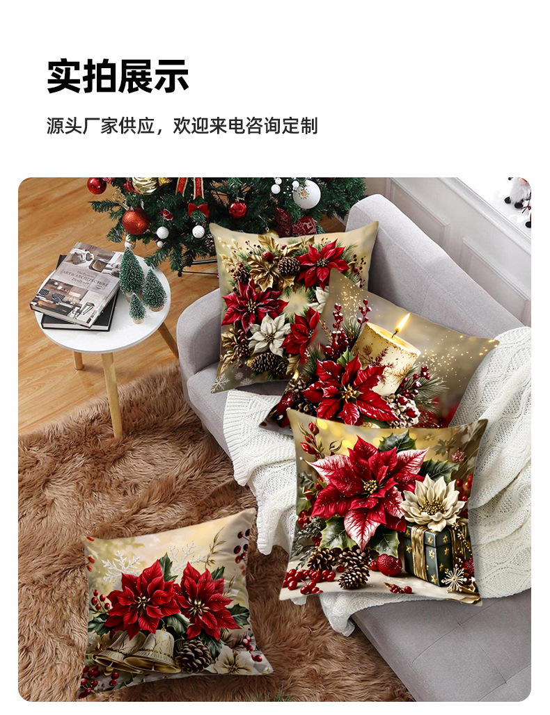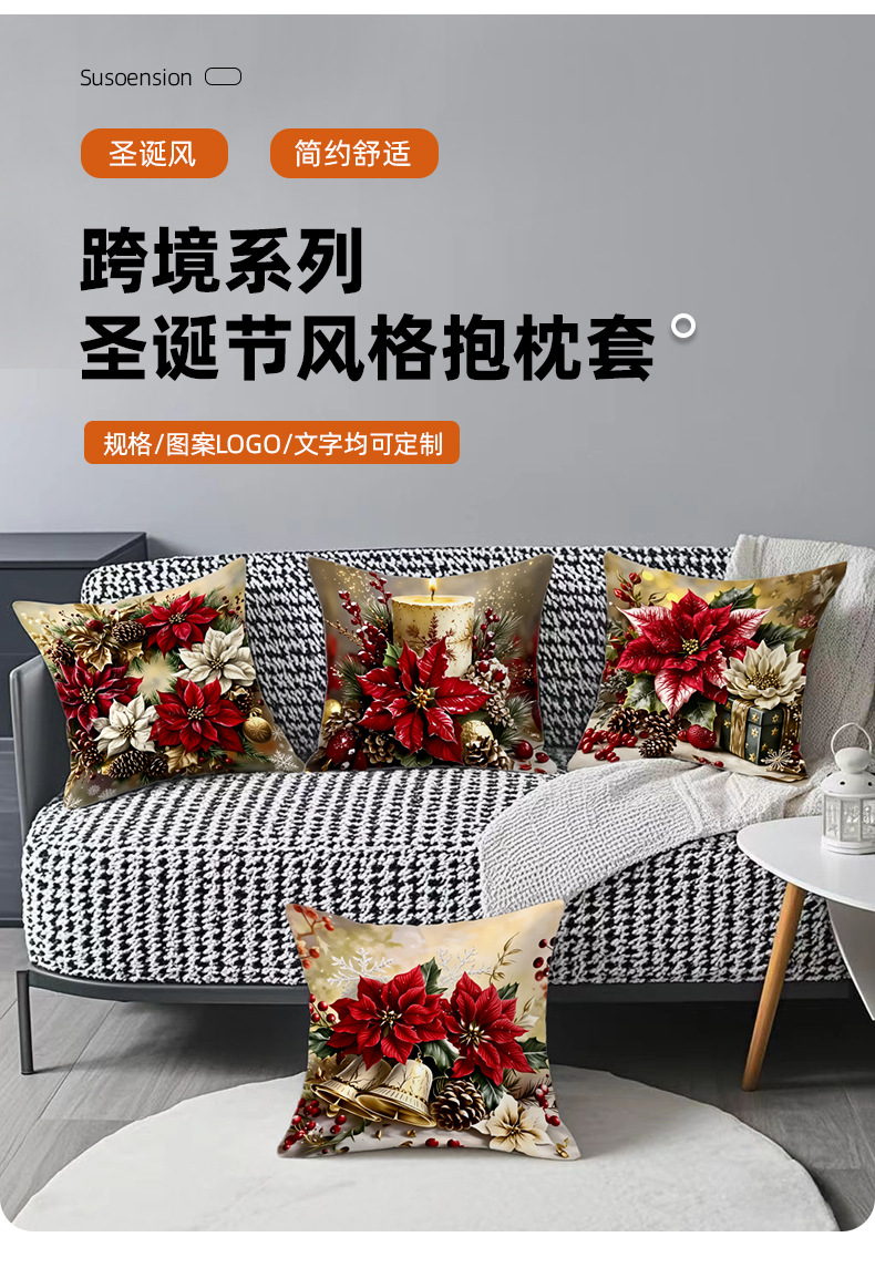 亚马逊热销圣诞主题靠枕套铃铛礼盒花卉数码印花抱枕套靠垫套批发