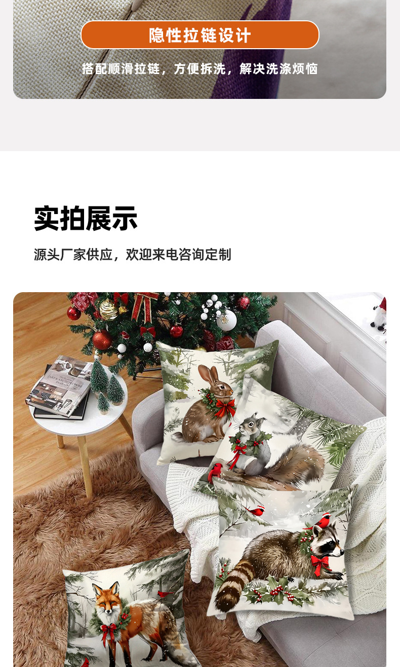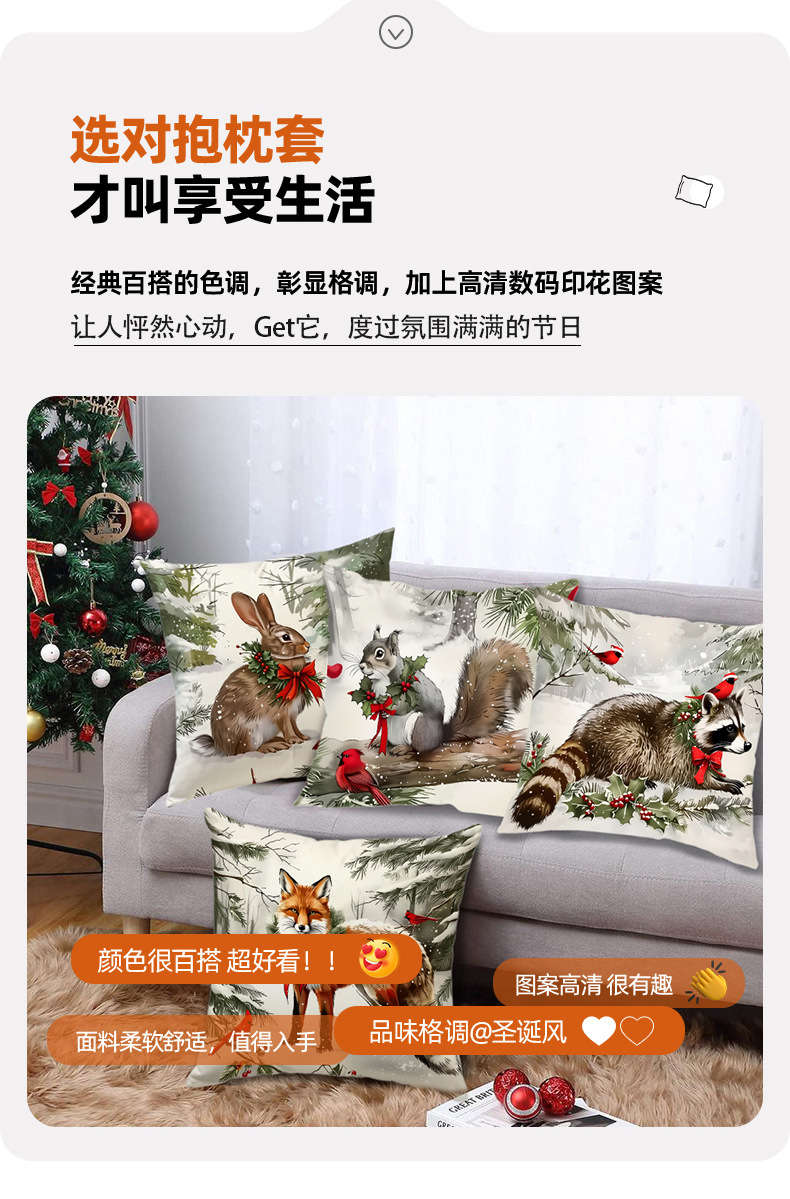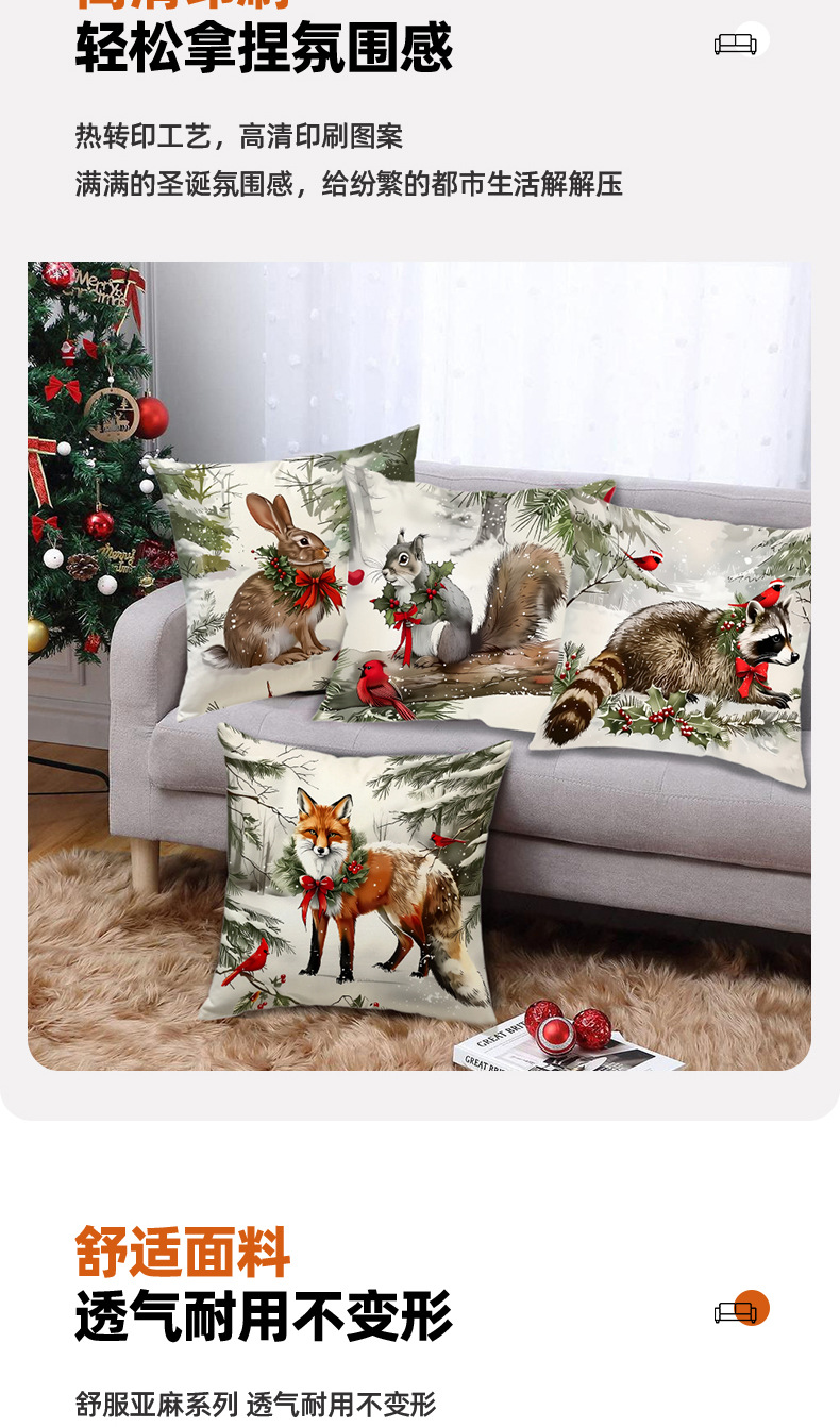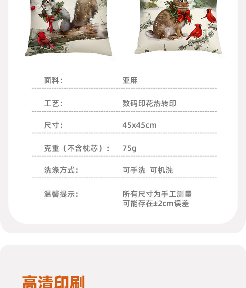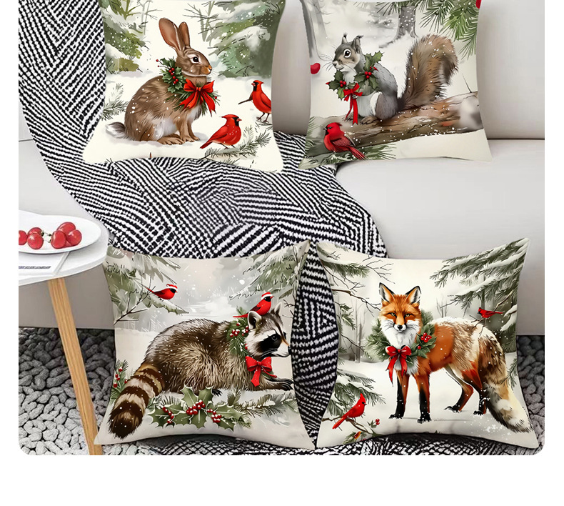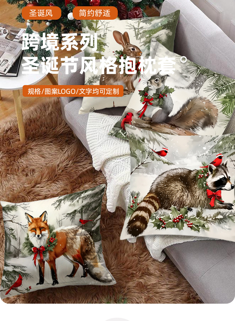 新款跨境圣诞风松鼠印花抱枕套节日氛围装饰家居客厅沙发靠枕套