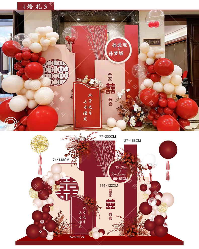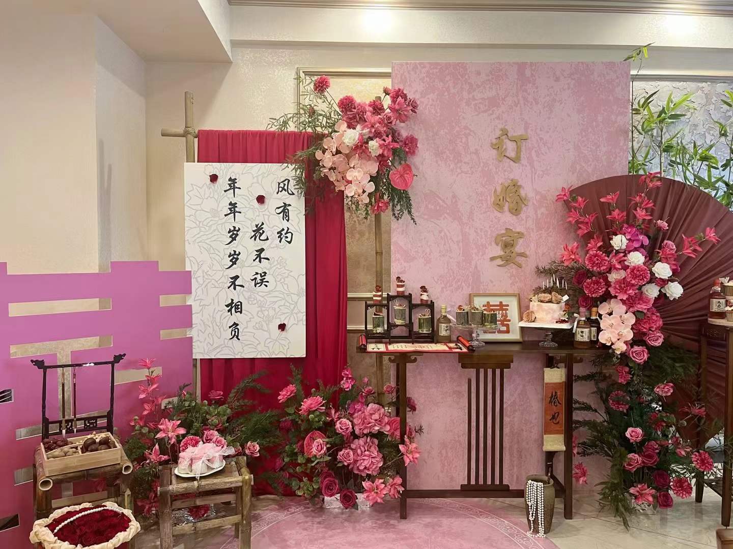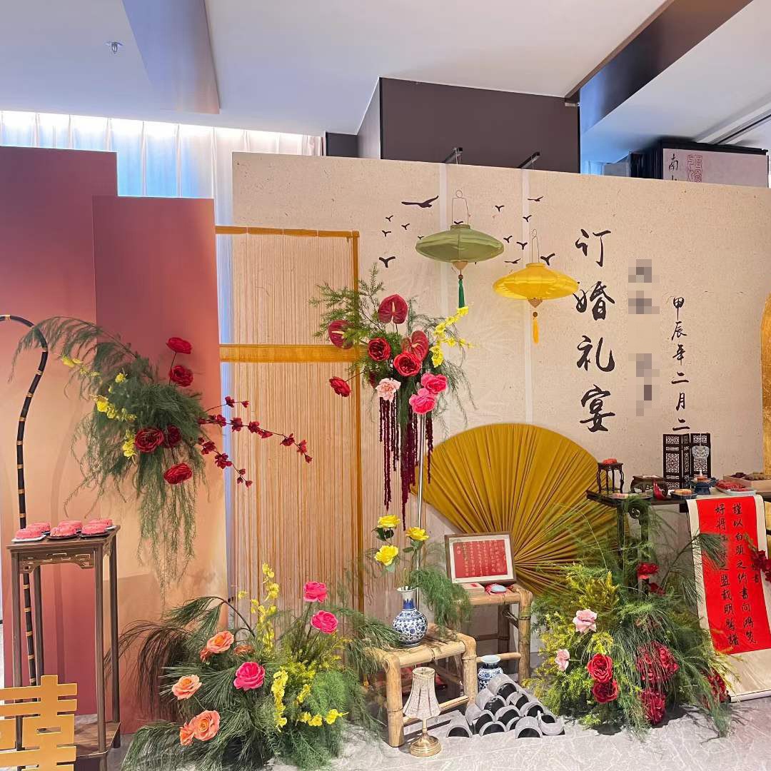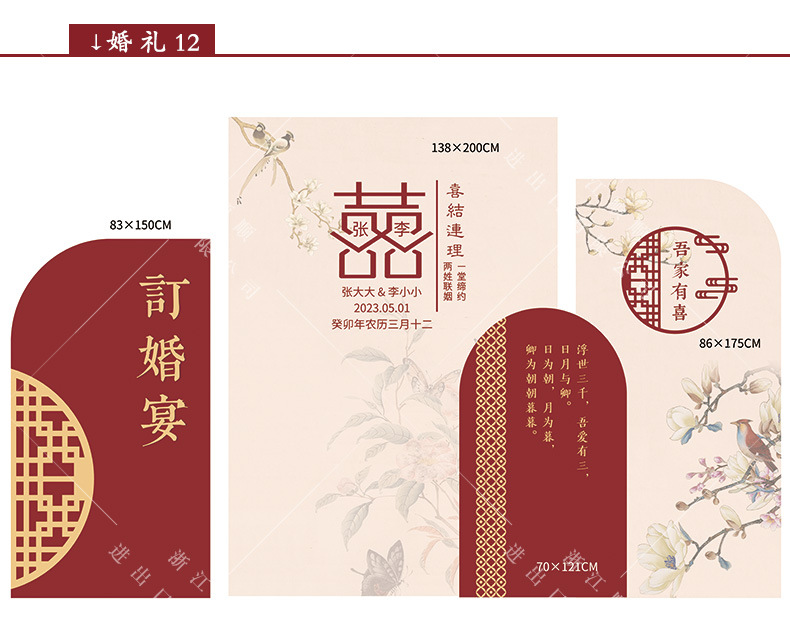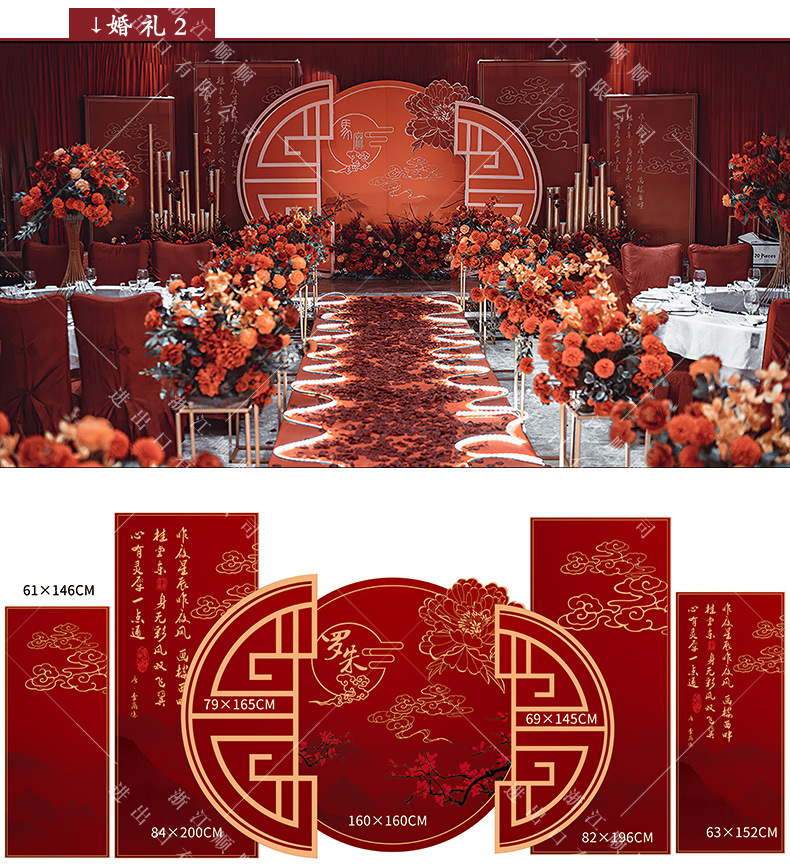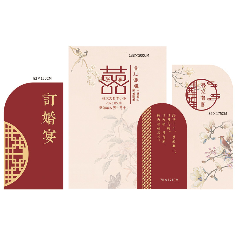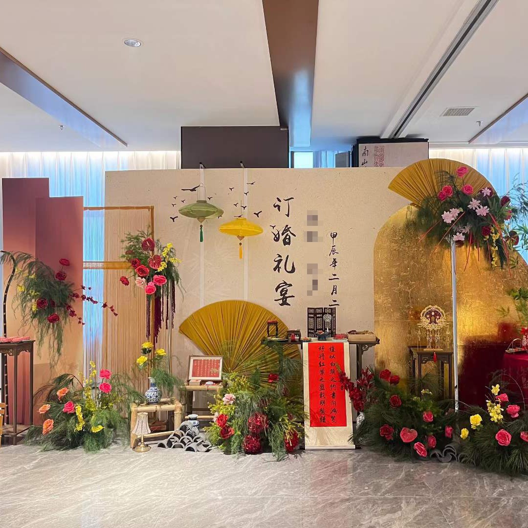 金色新中式订婚宴场景布置国风设计摆台婚礼布置结婚背景kt板