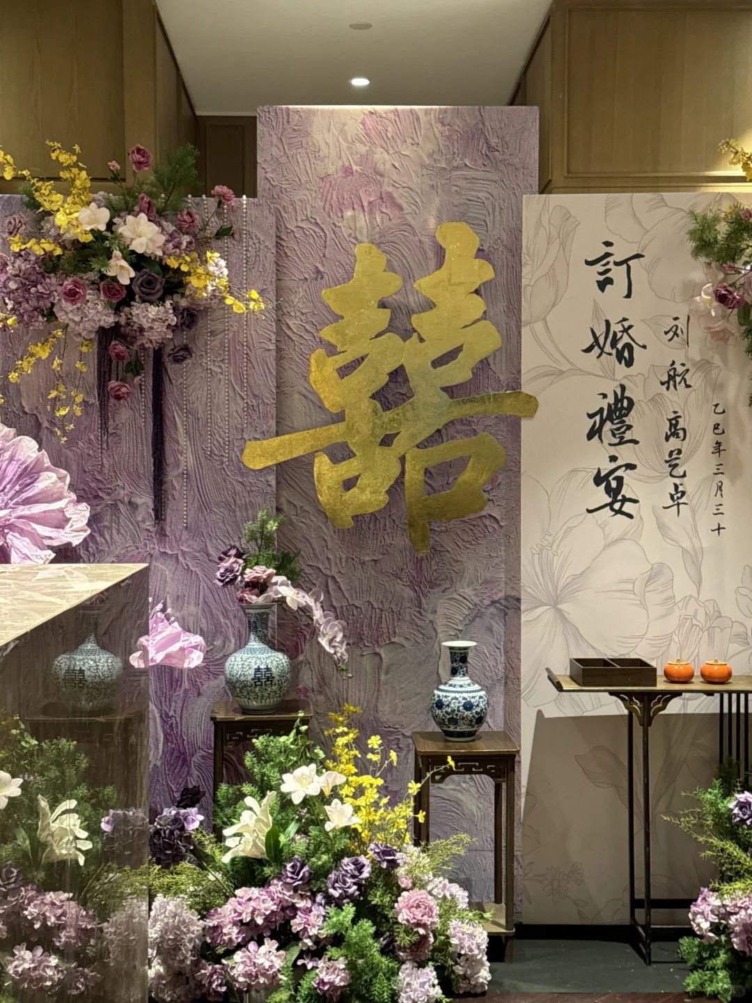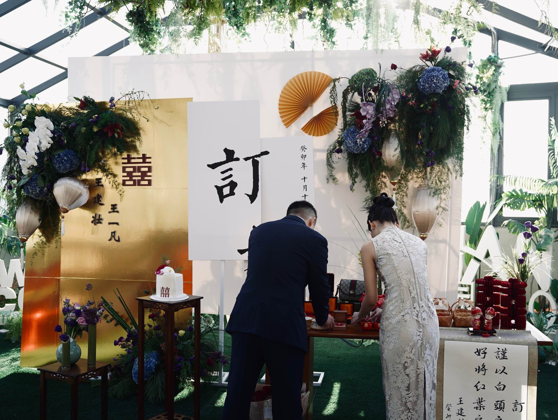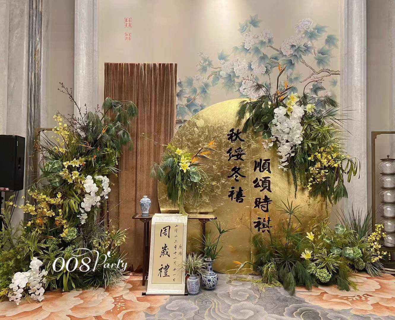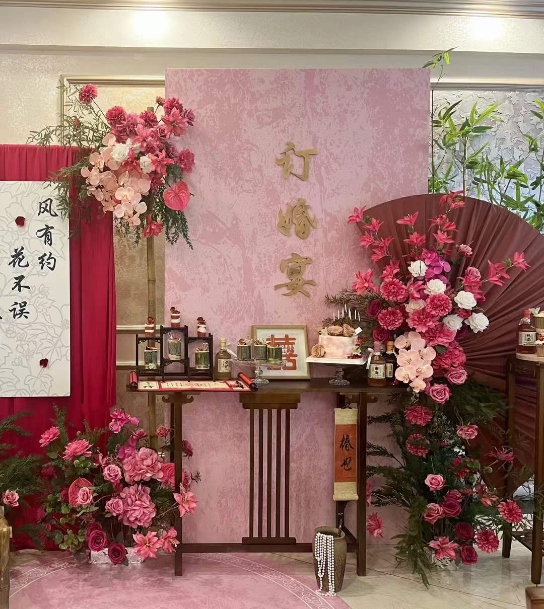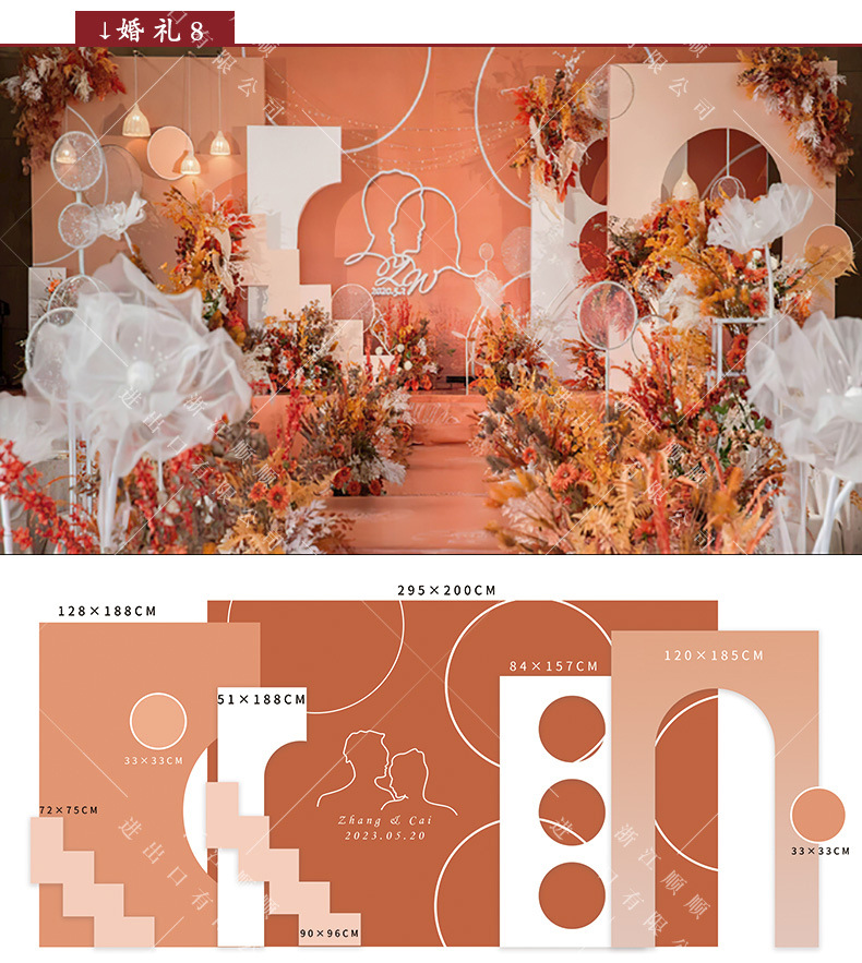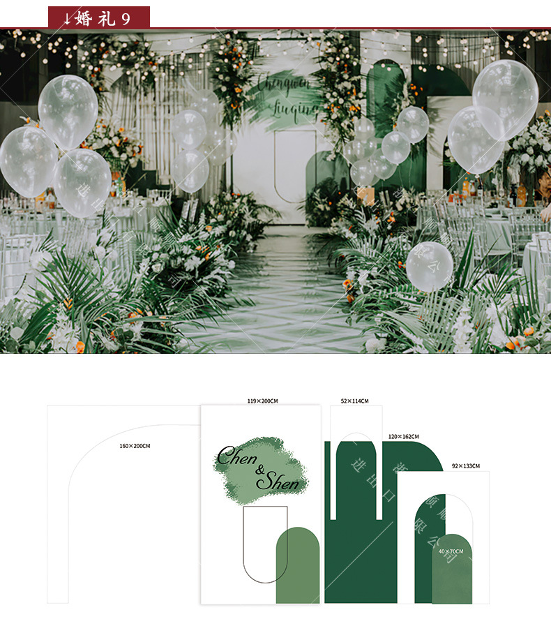 金色新中式订婚宴场景布置国风设计摆台婚礼布置结婚背景kt板