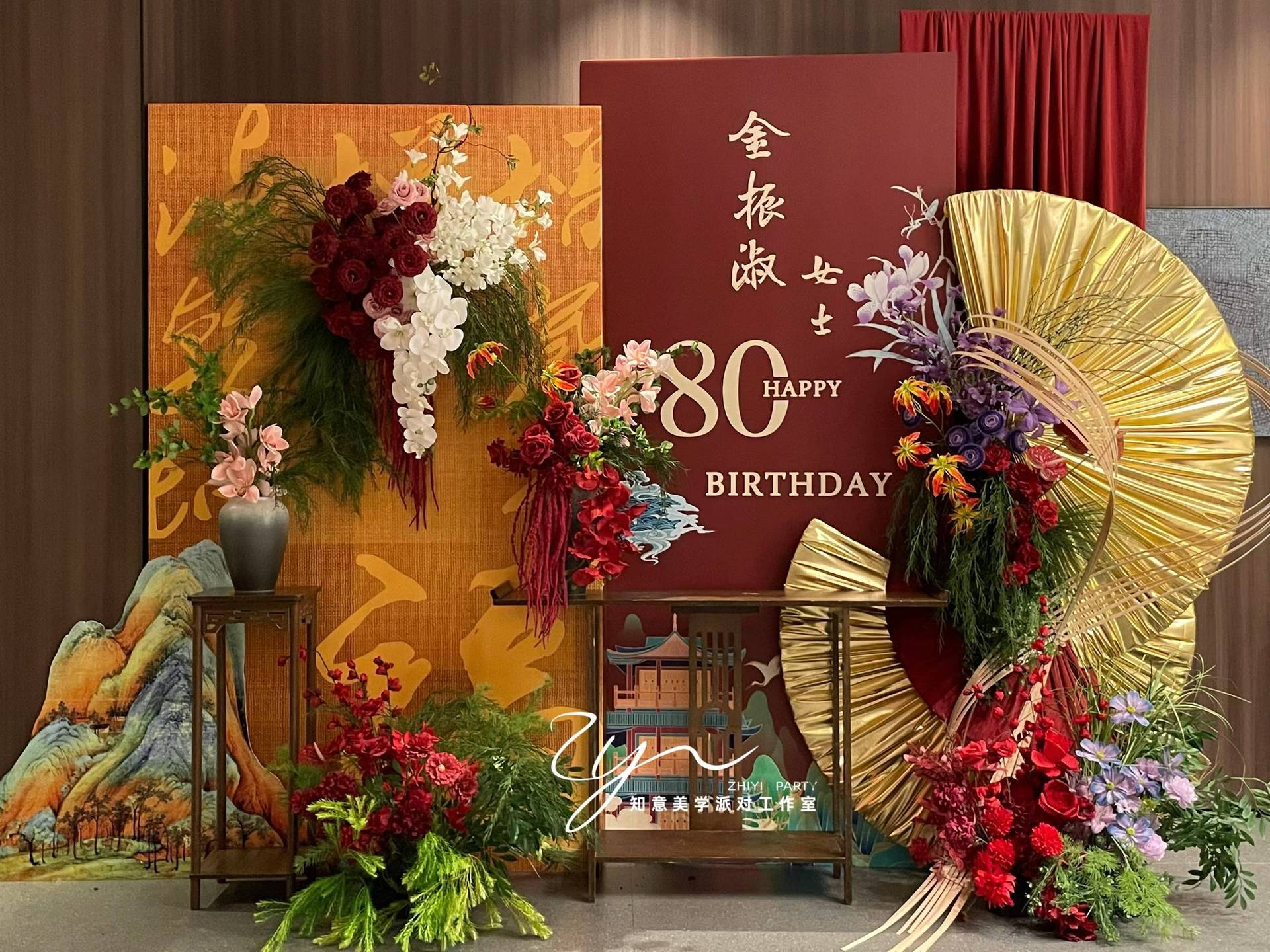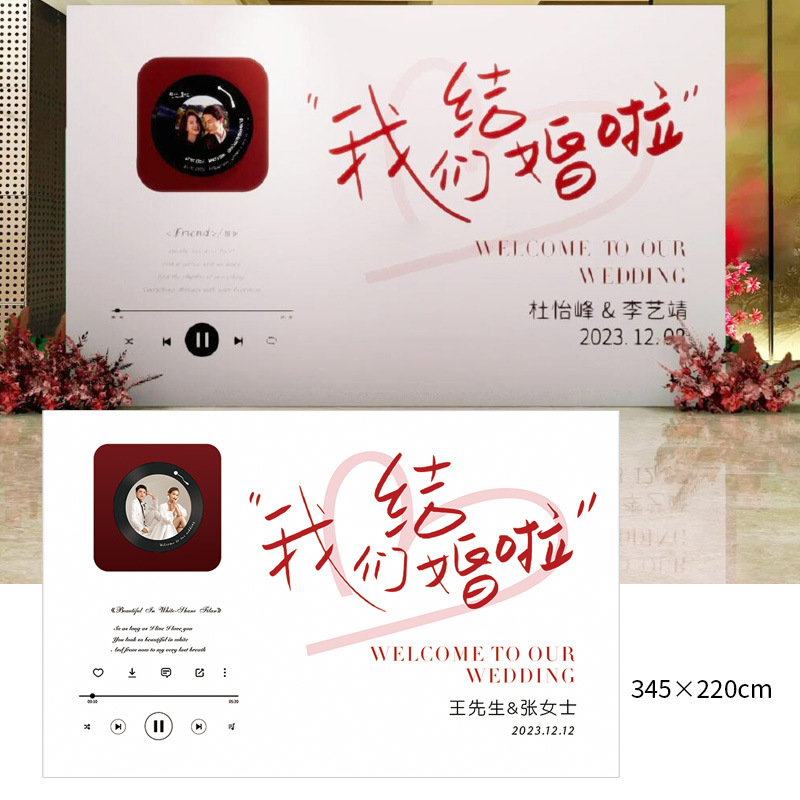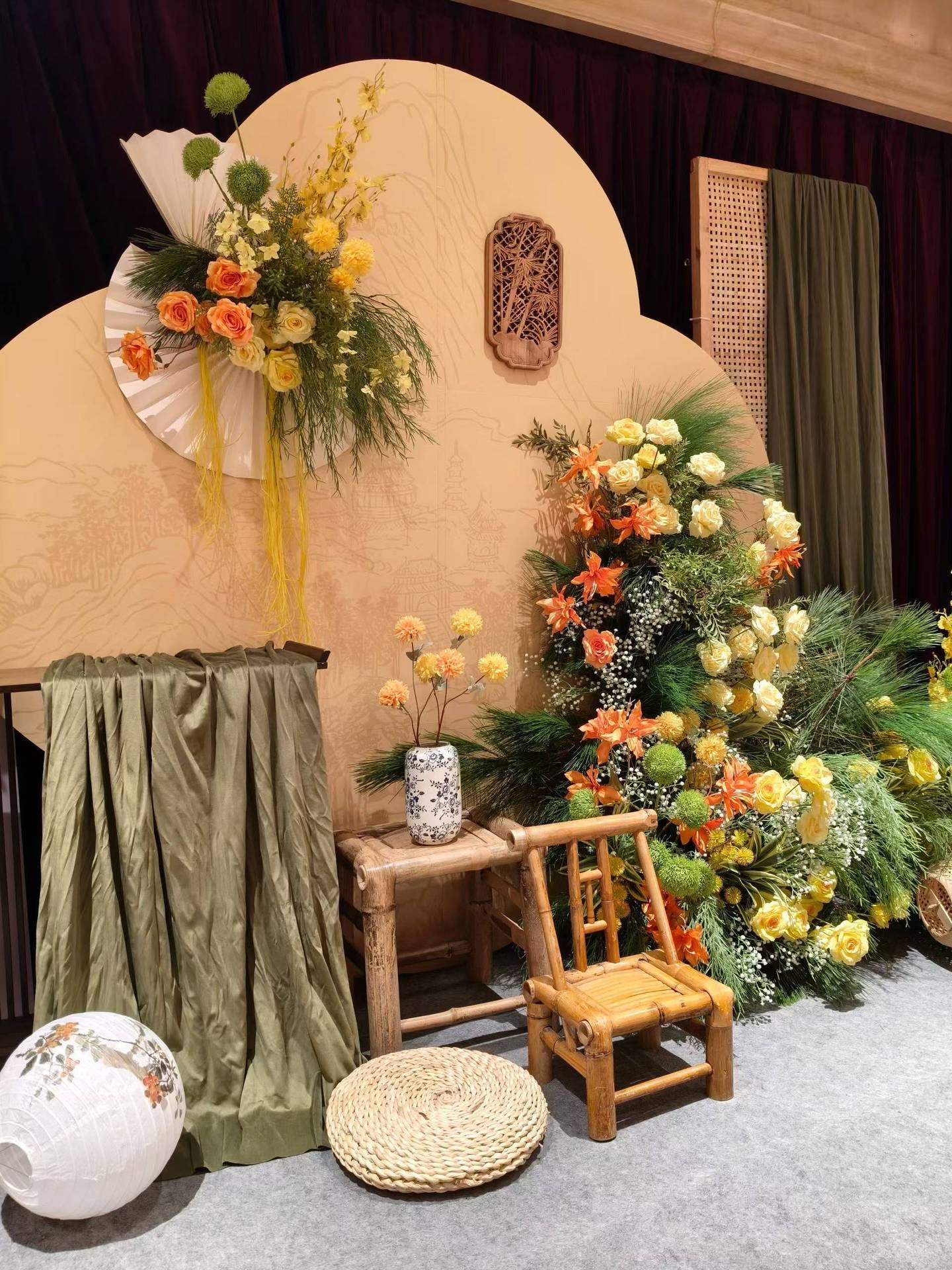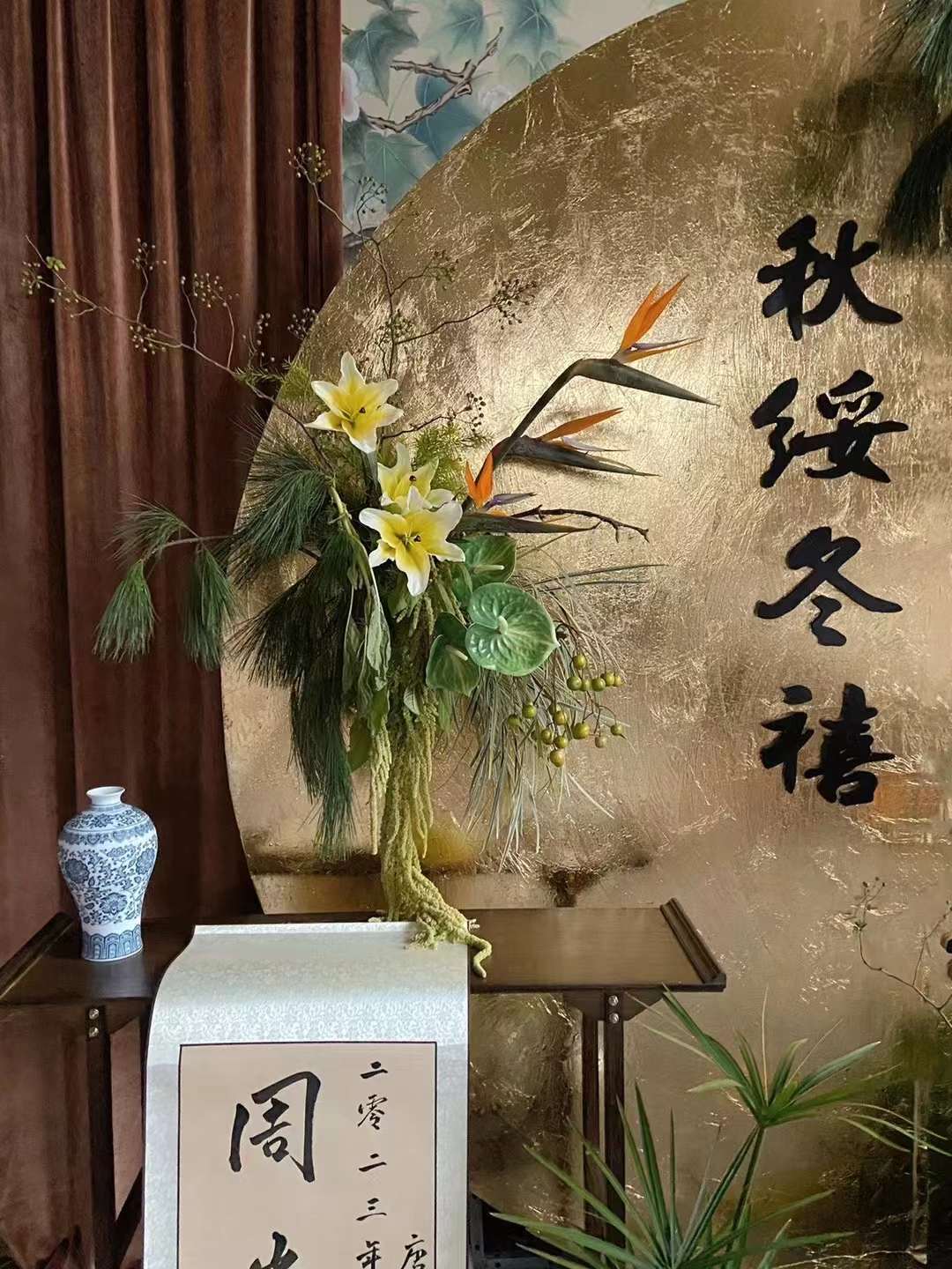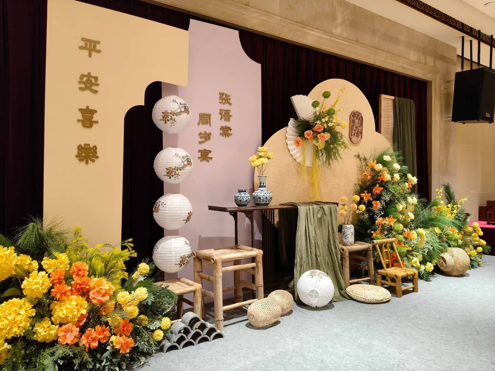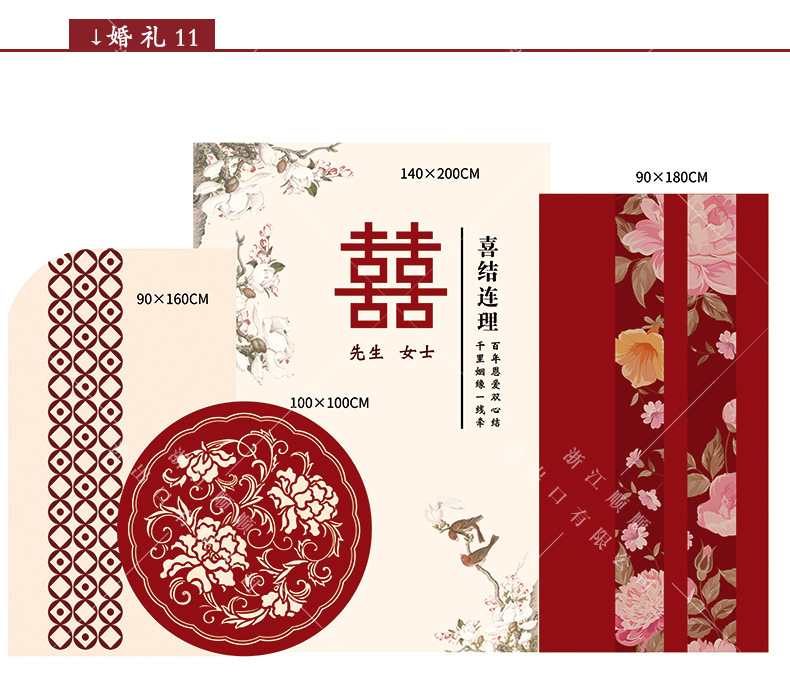 金色新中式订婚宴场景布置国风设计摆台婚礼布置结婚背景kt板