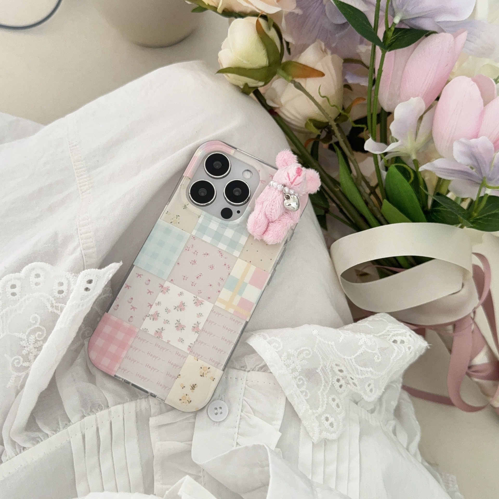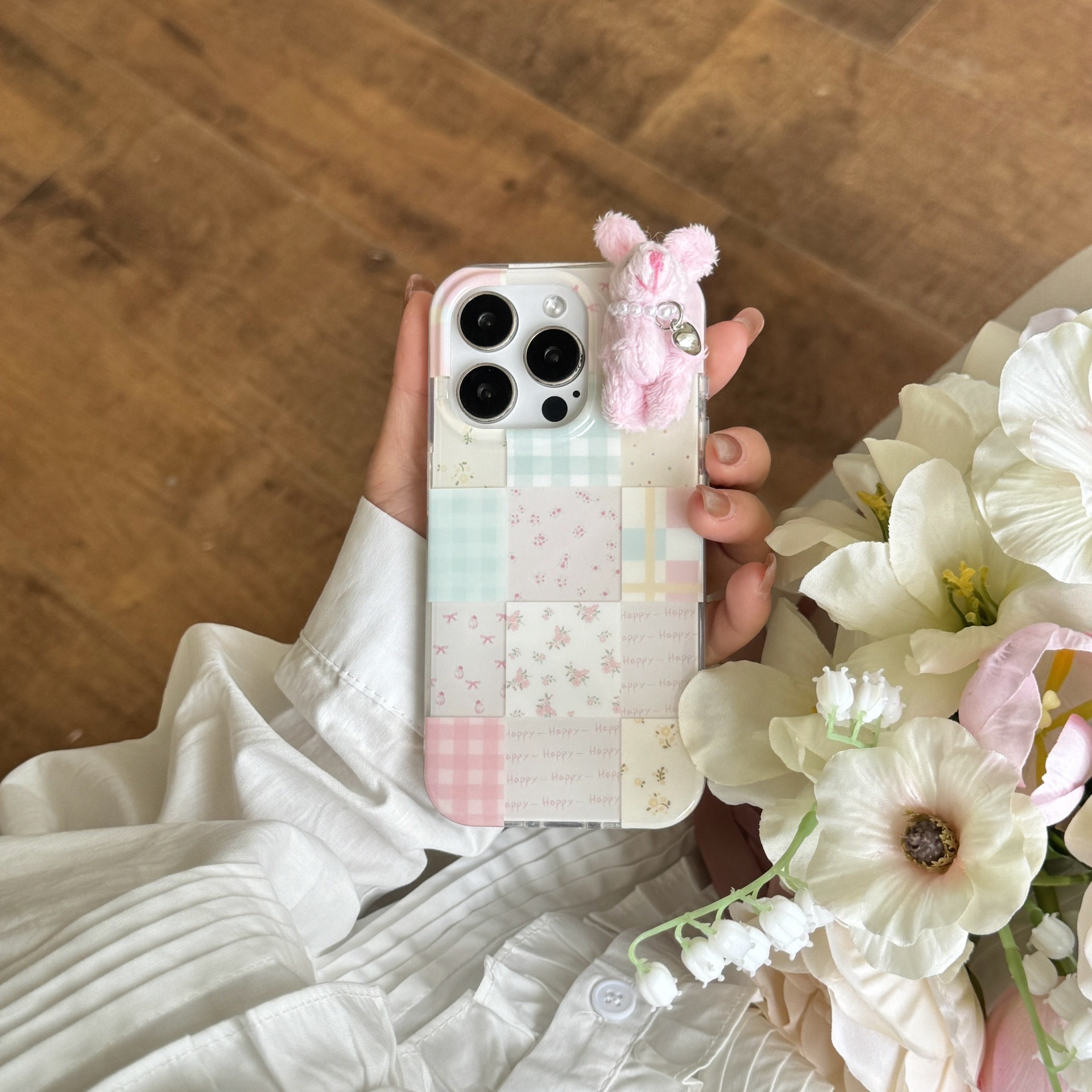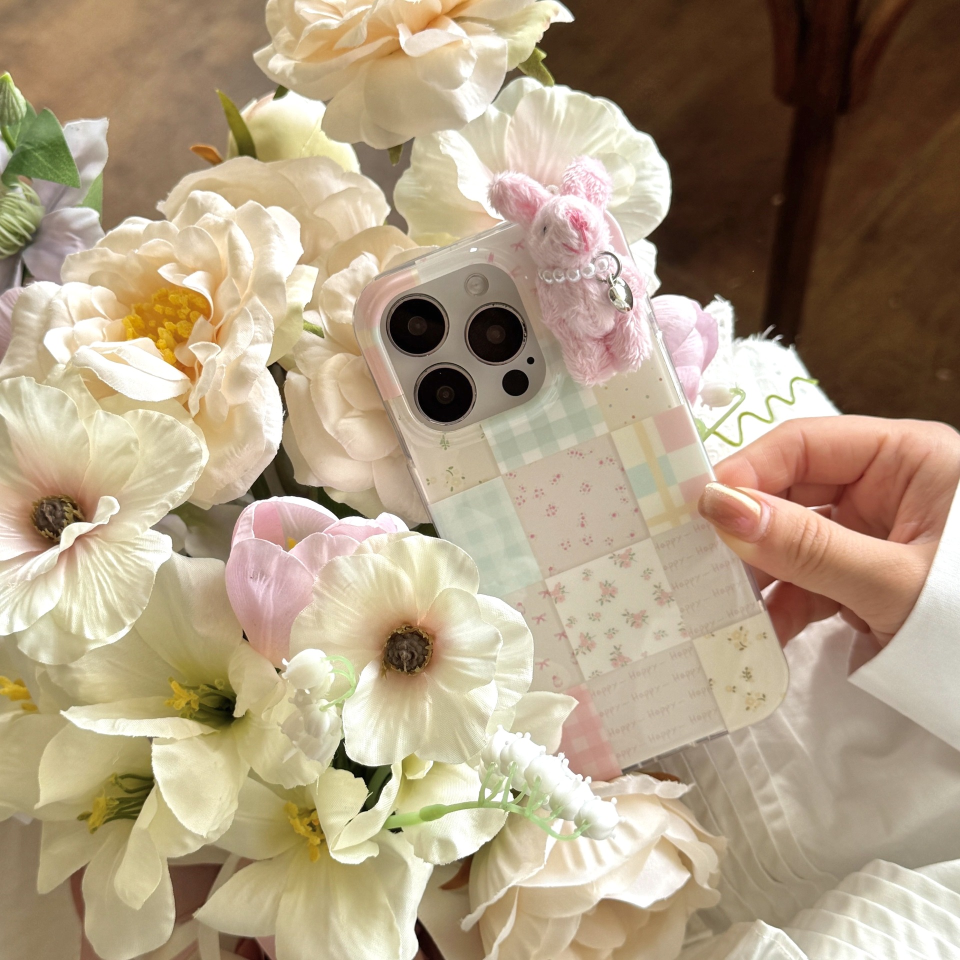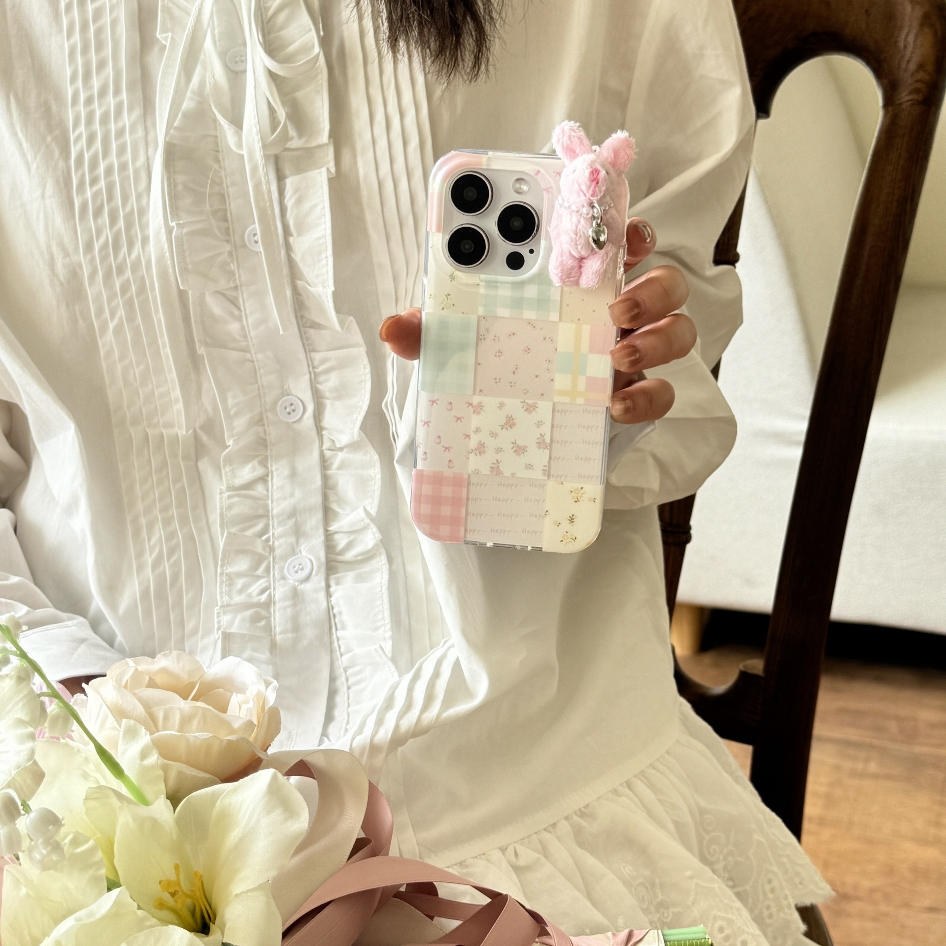 少女可爱格纹小兔子适用苹果16promax手机壳iPhone15卡通14碎花13
