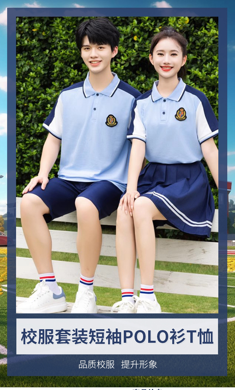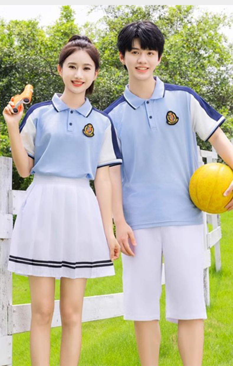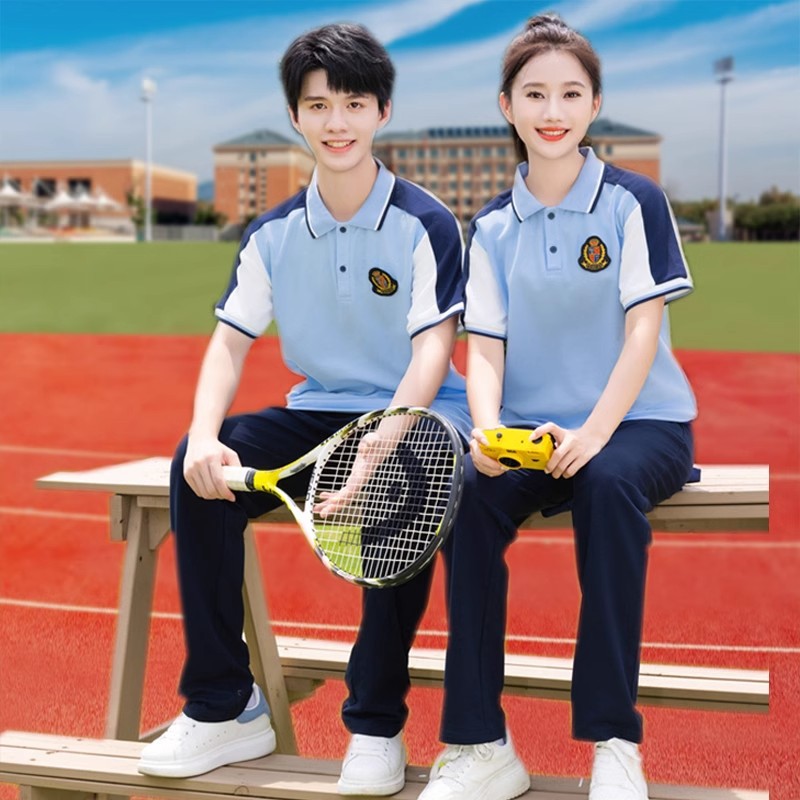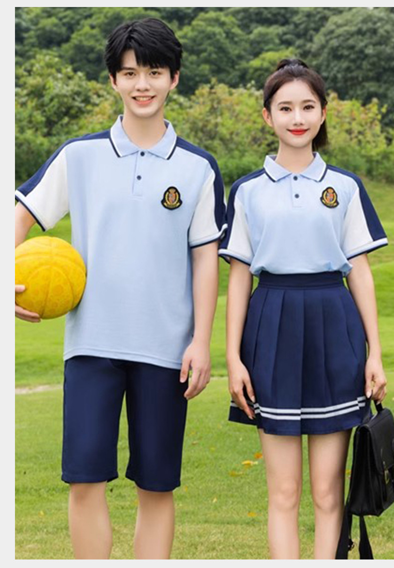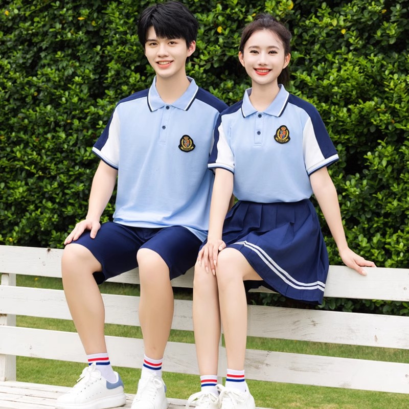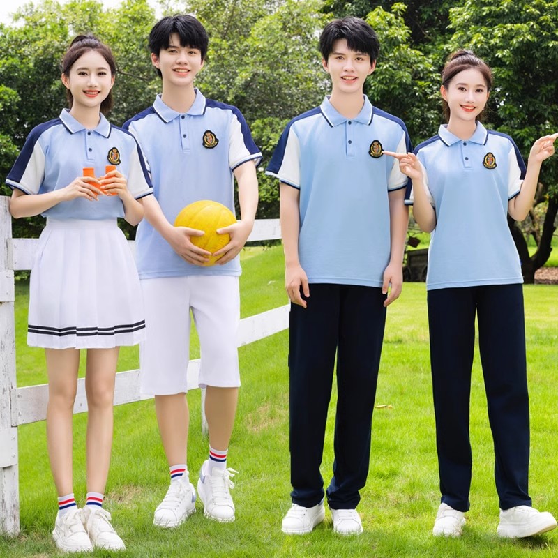 夏季校服polo衫园服 蓝色儿童校服高中休闲运动套装短袖T恤百褶裙