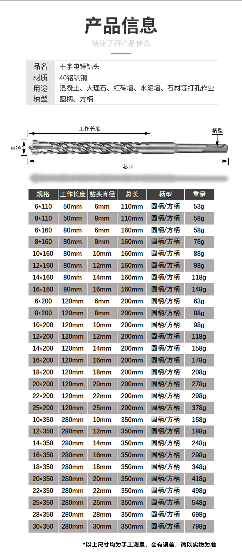 十字电锤冲击钻头混凝土打孔方柄穿墙圆柄过墙转头合金加长四刃钻