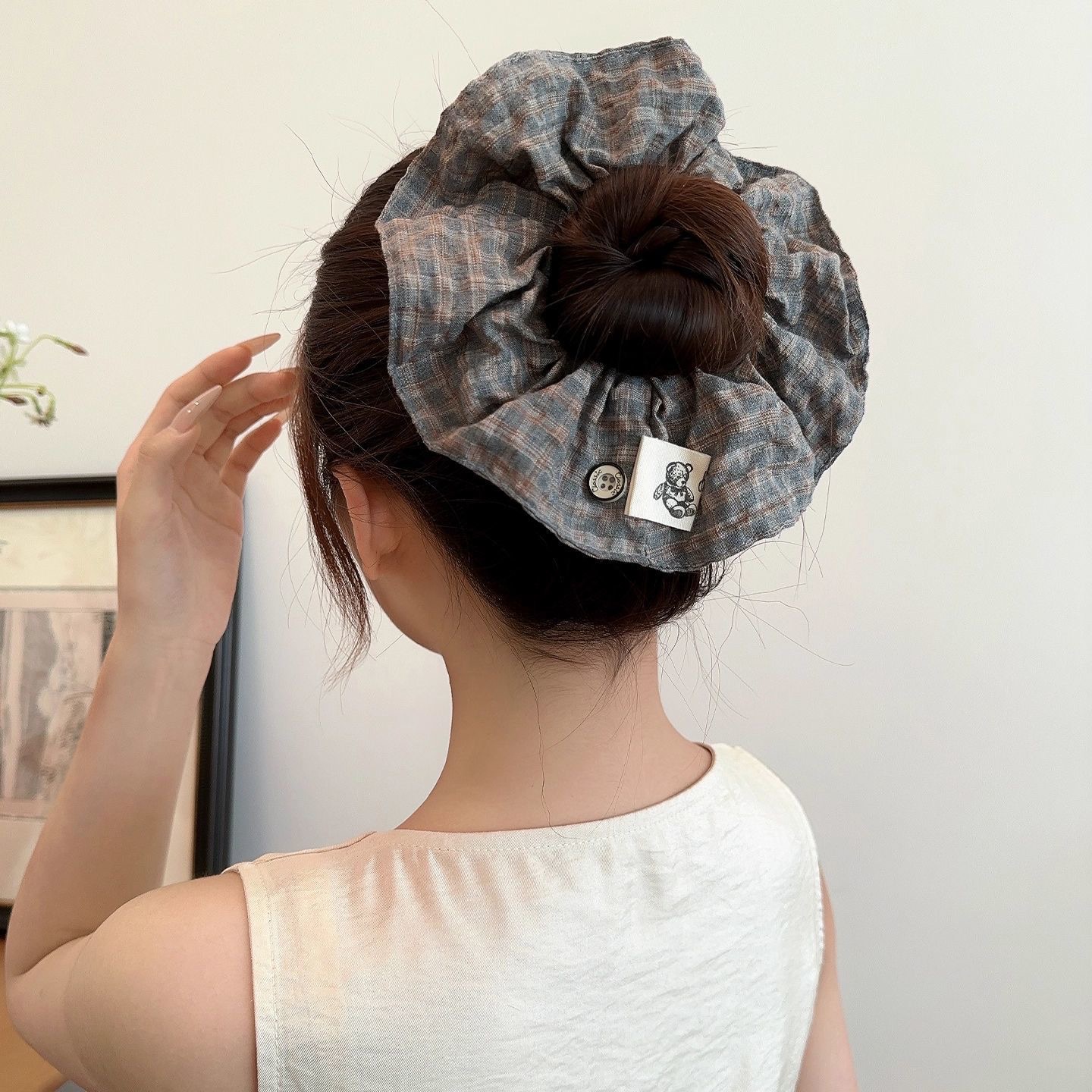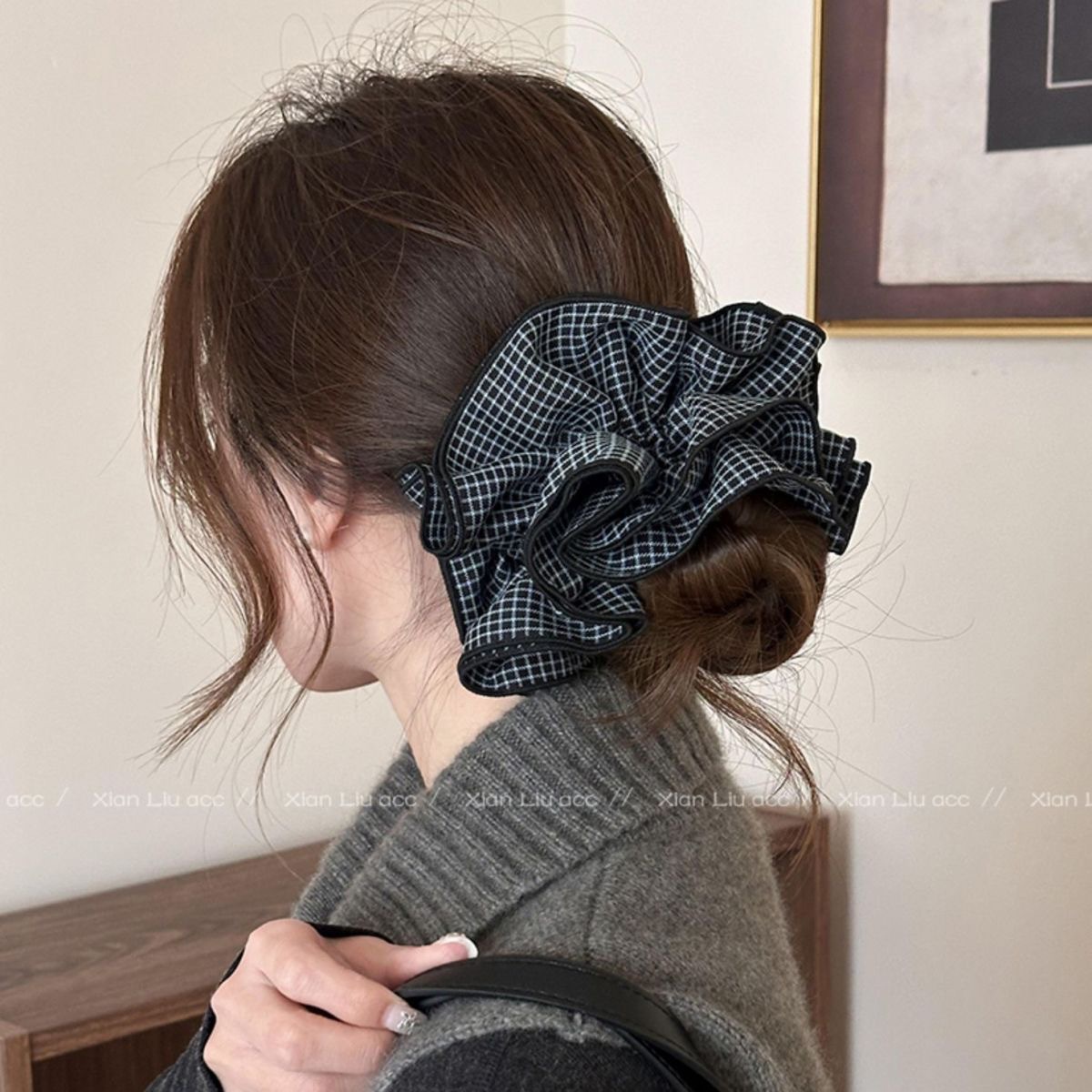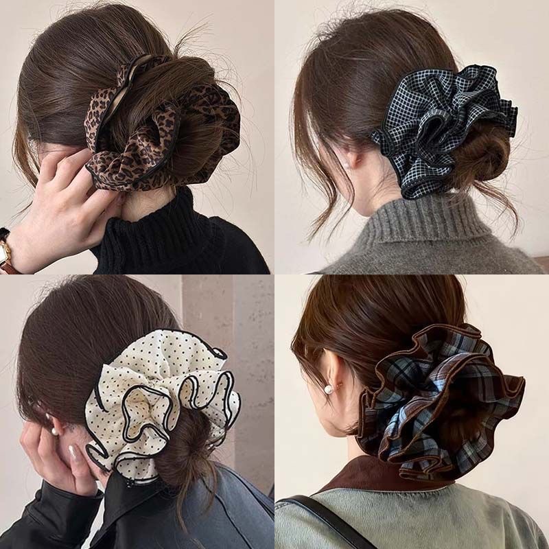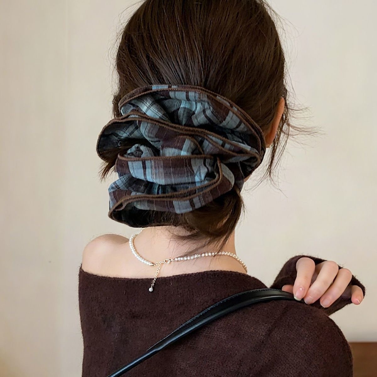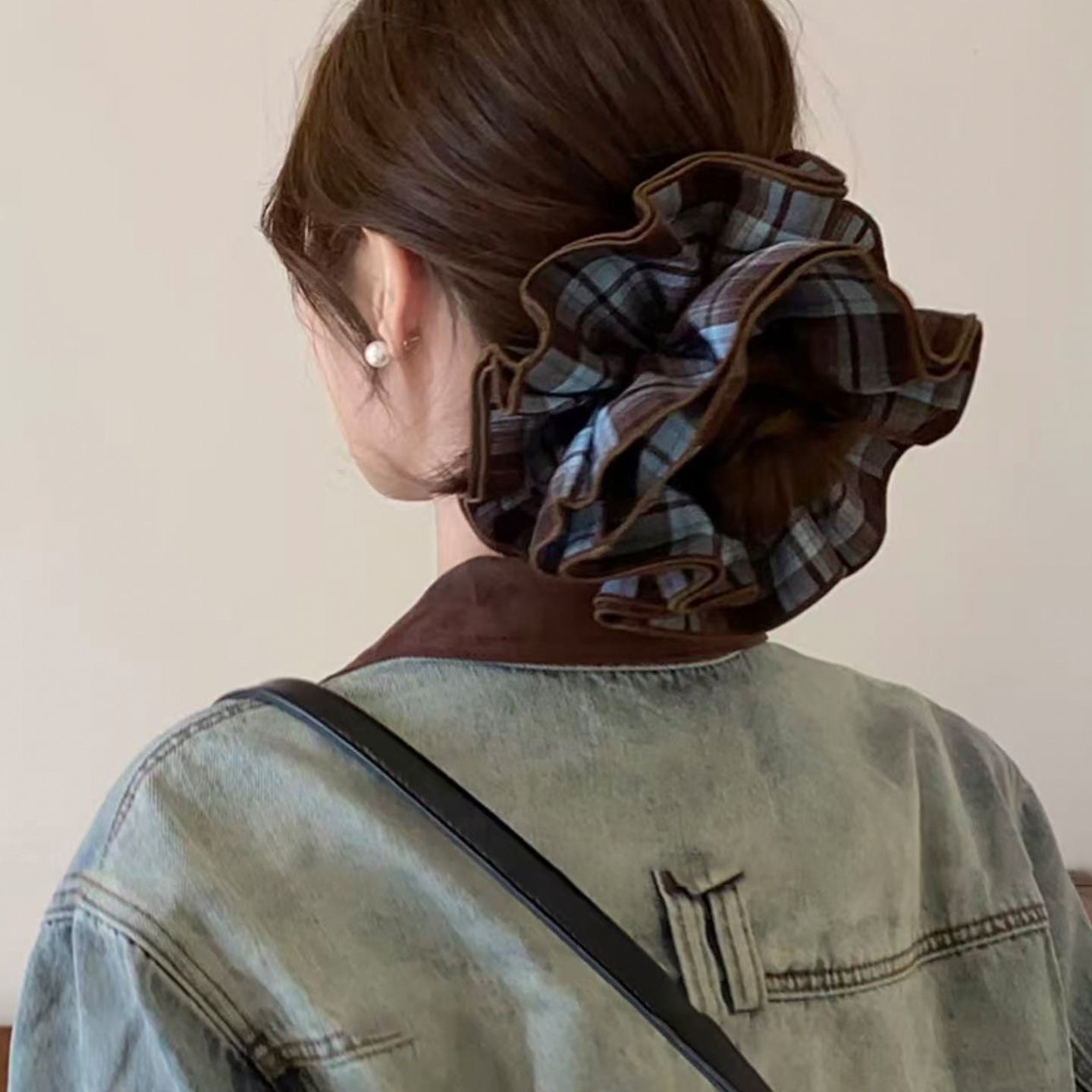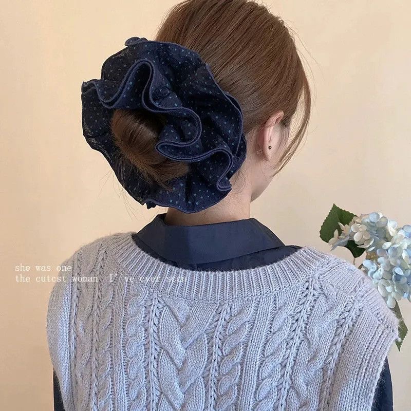 许我耀眼~赵露思同款韩系藏青格子四层大肠发圈发绳扎丸子头发饰