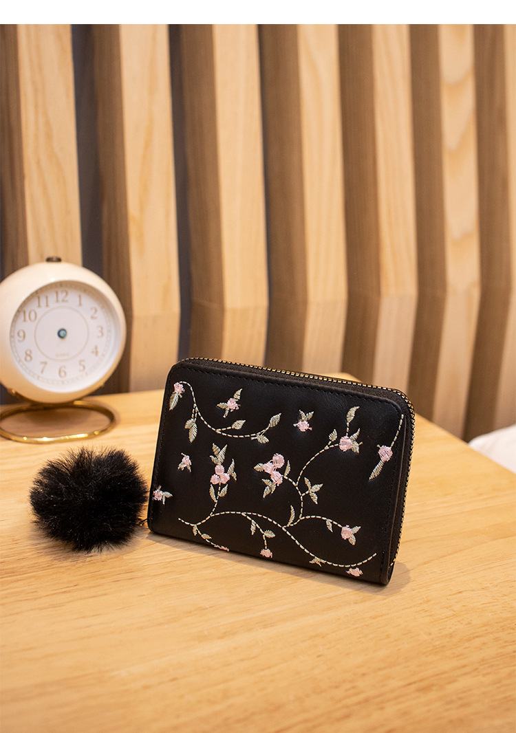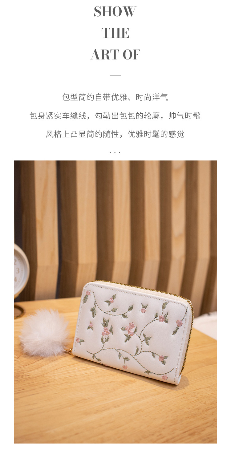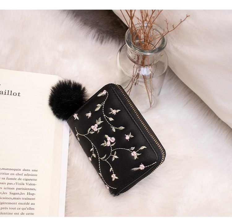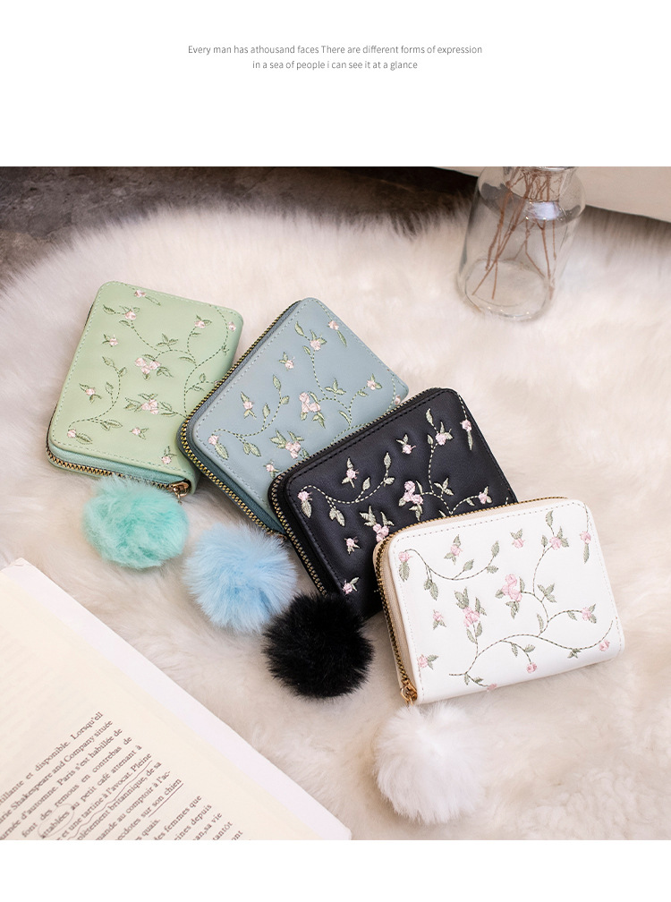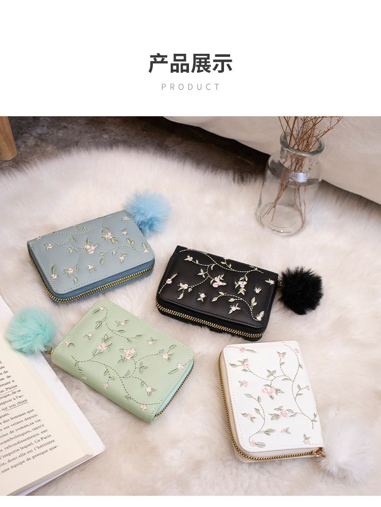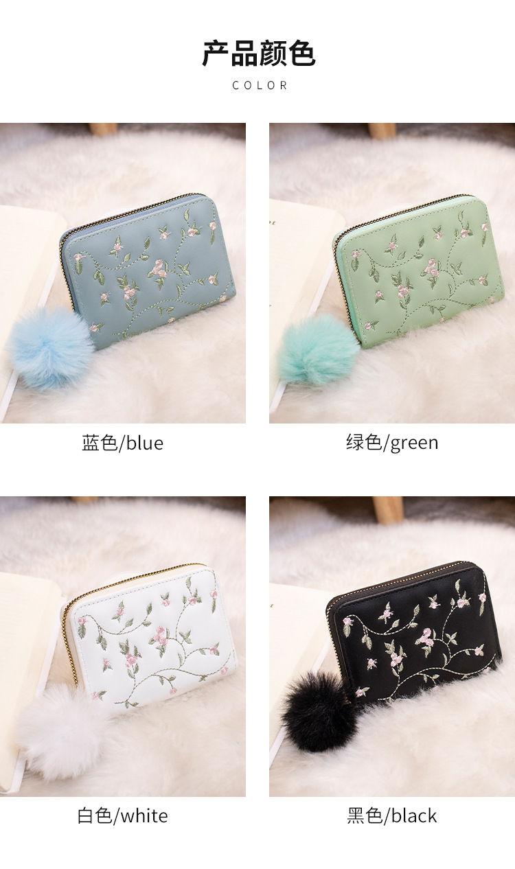 时尚短款刺小花钱包百搭零钱包外贸小包女士钱包毛绒挂件钱夹卡包