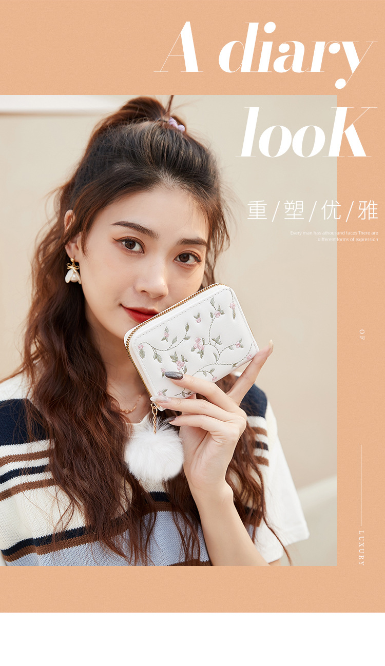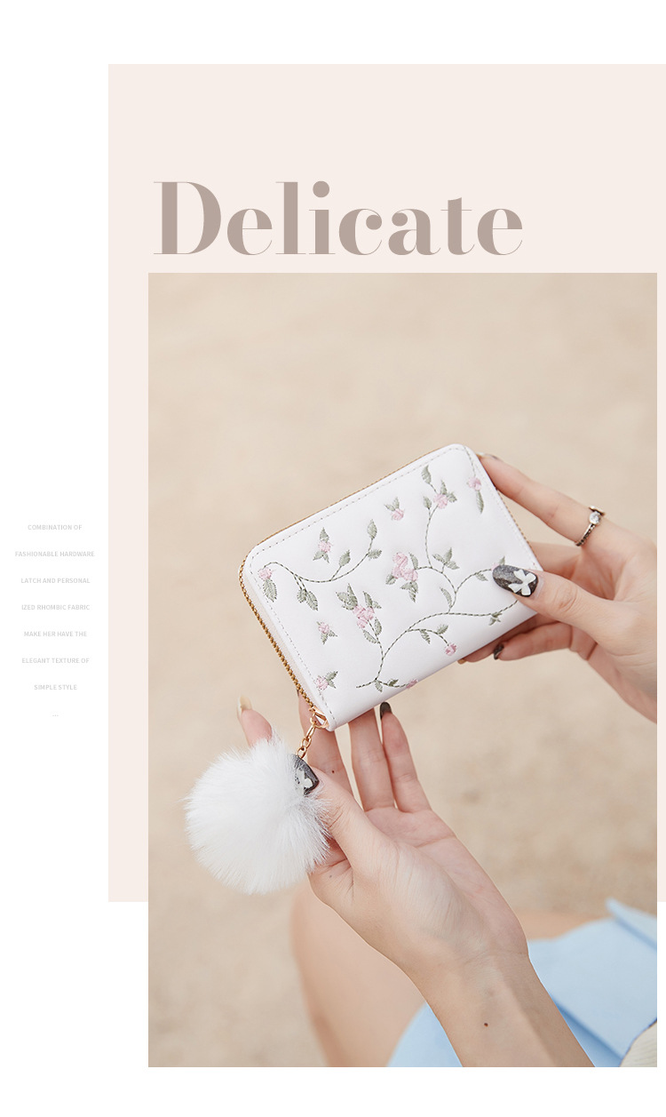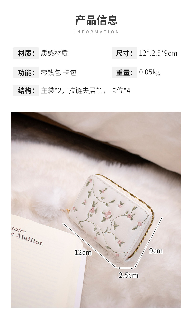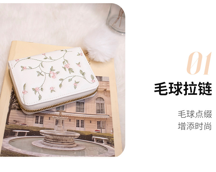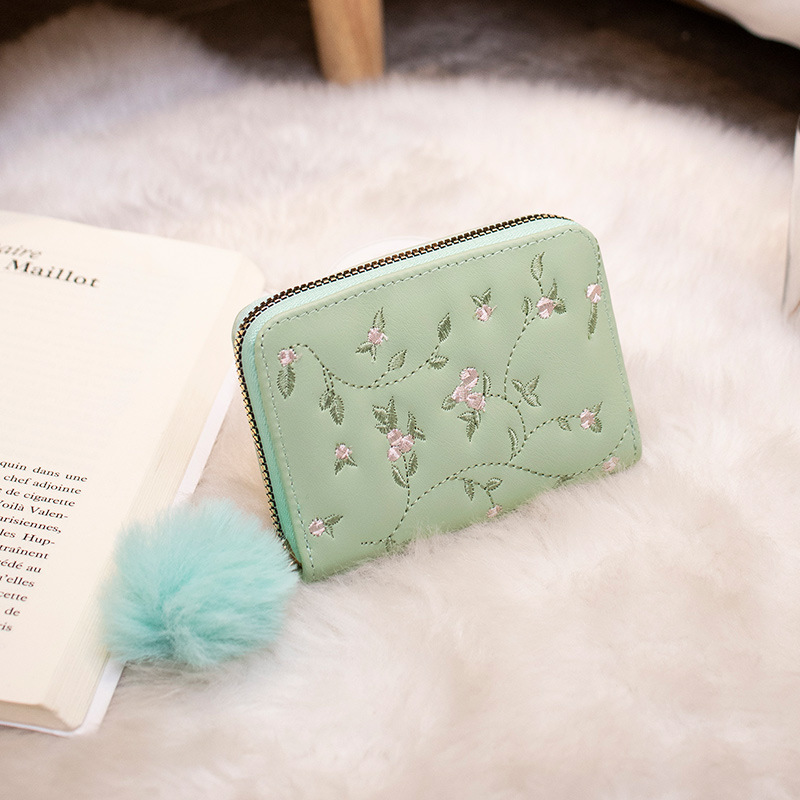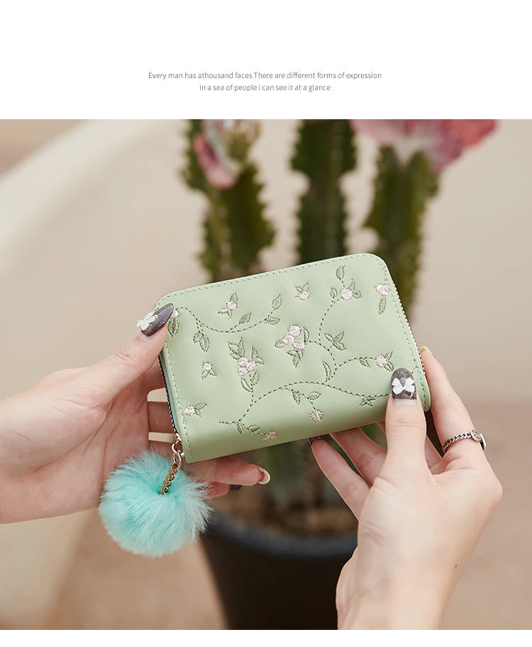 时尚短款刺小花钱包百搭零钱包外贸小包女士钱包毛绒挂件钱夹卡包