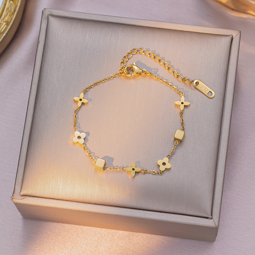 高级感轻奢几何小方块花朵钛钢项链女生时尚网红四叶草锁骨链套装
