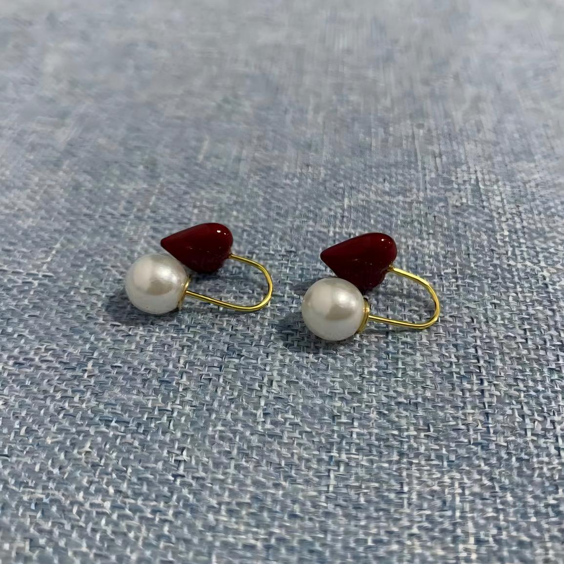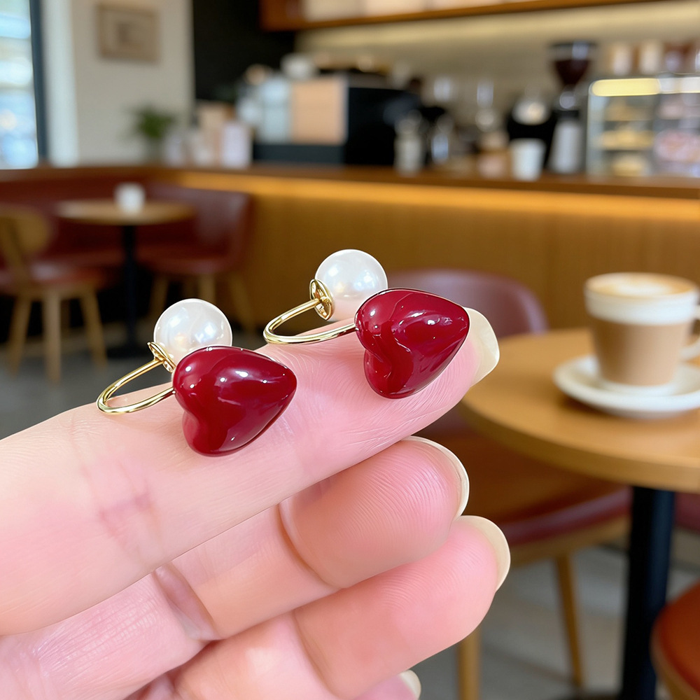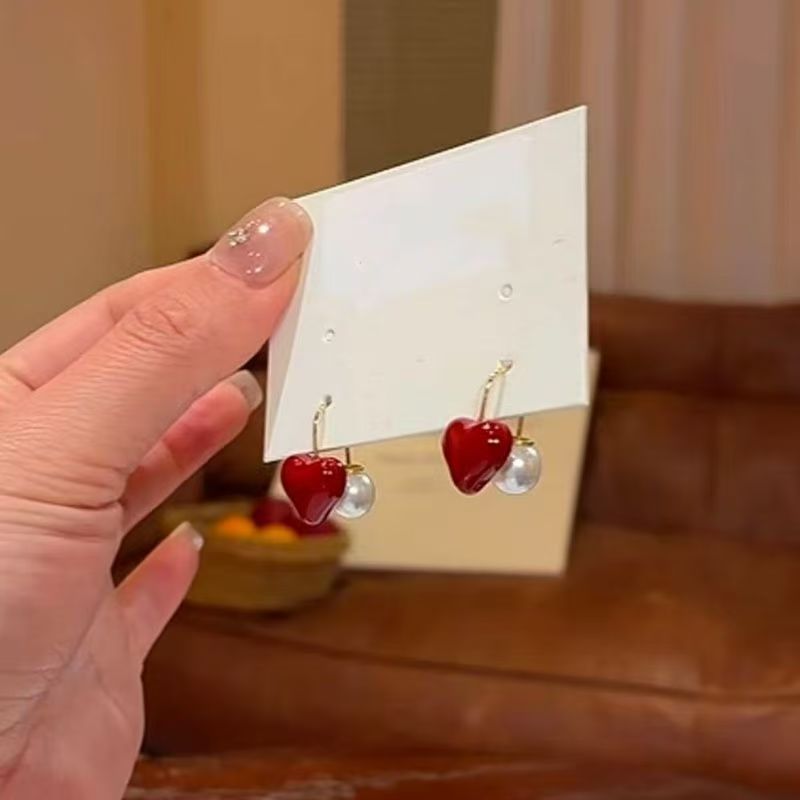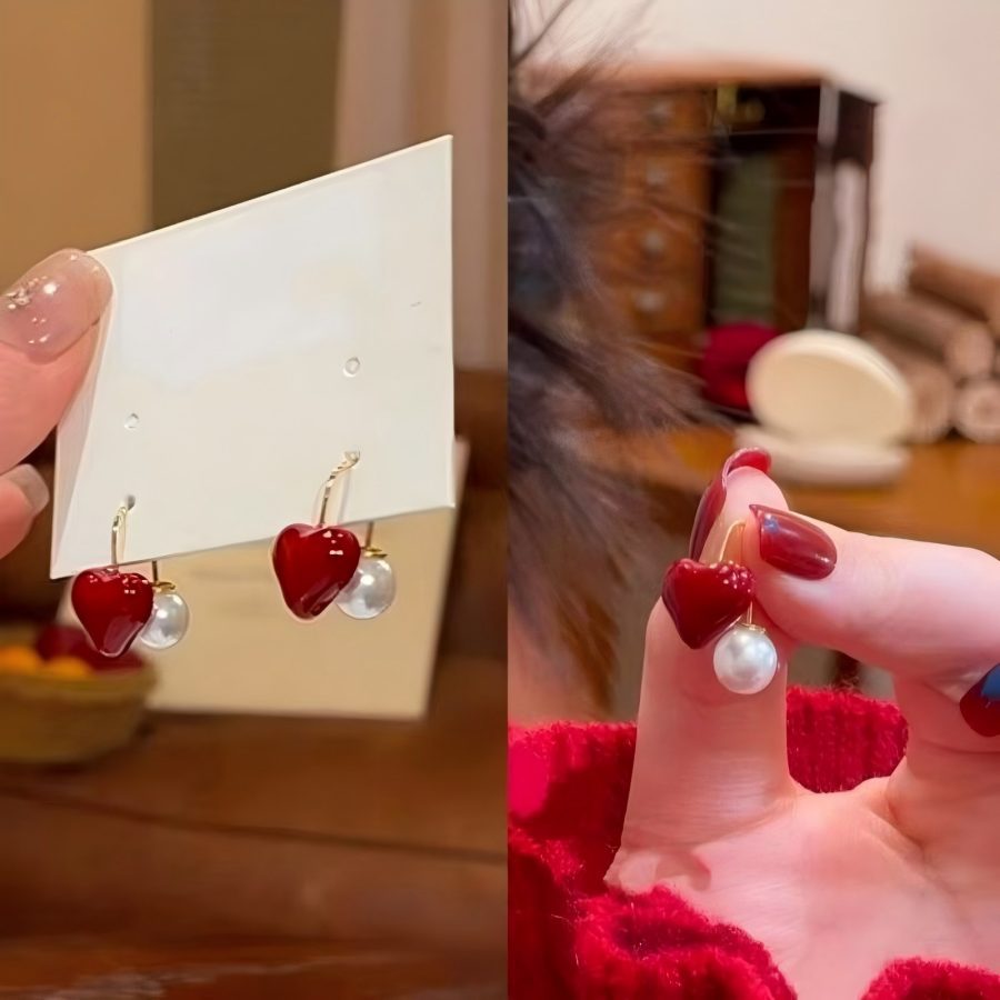 爆款爱心珍珠耳钉2026新年高级感耳环巨好看小众红色两戴桃心耳饰