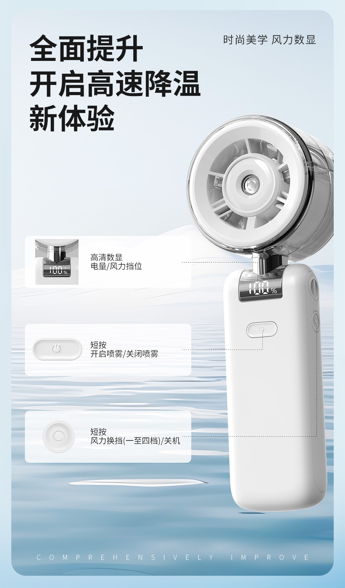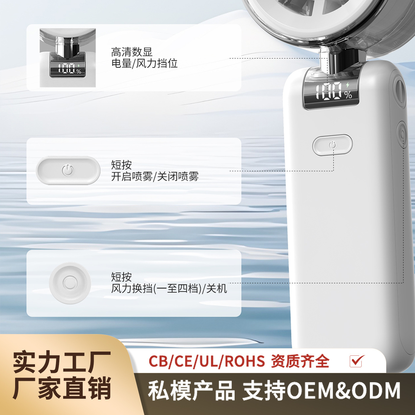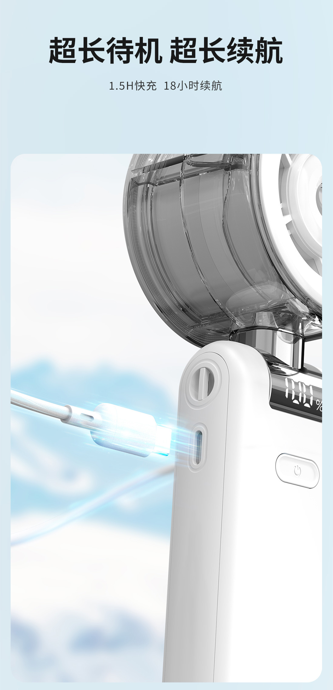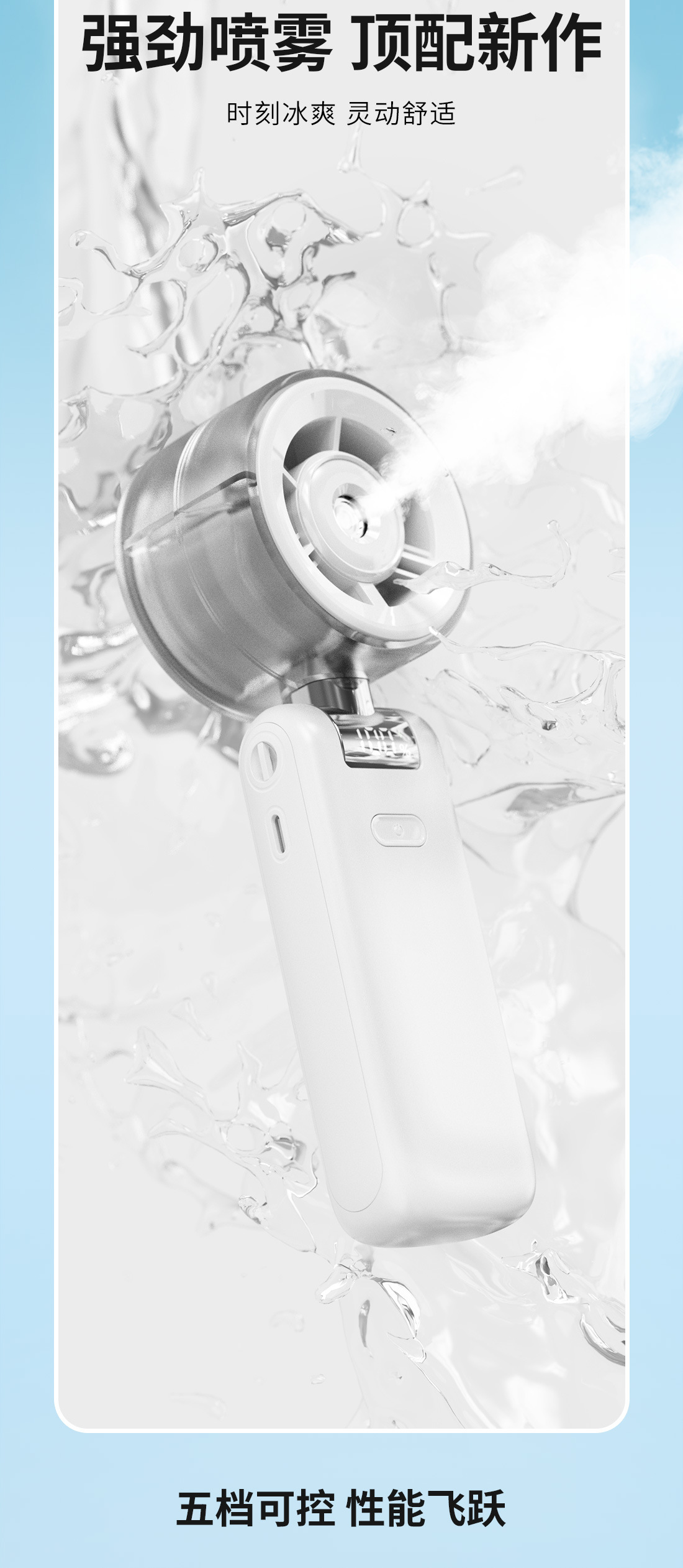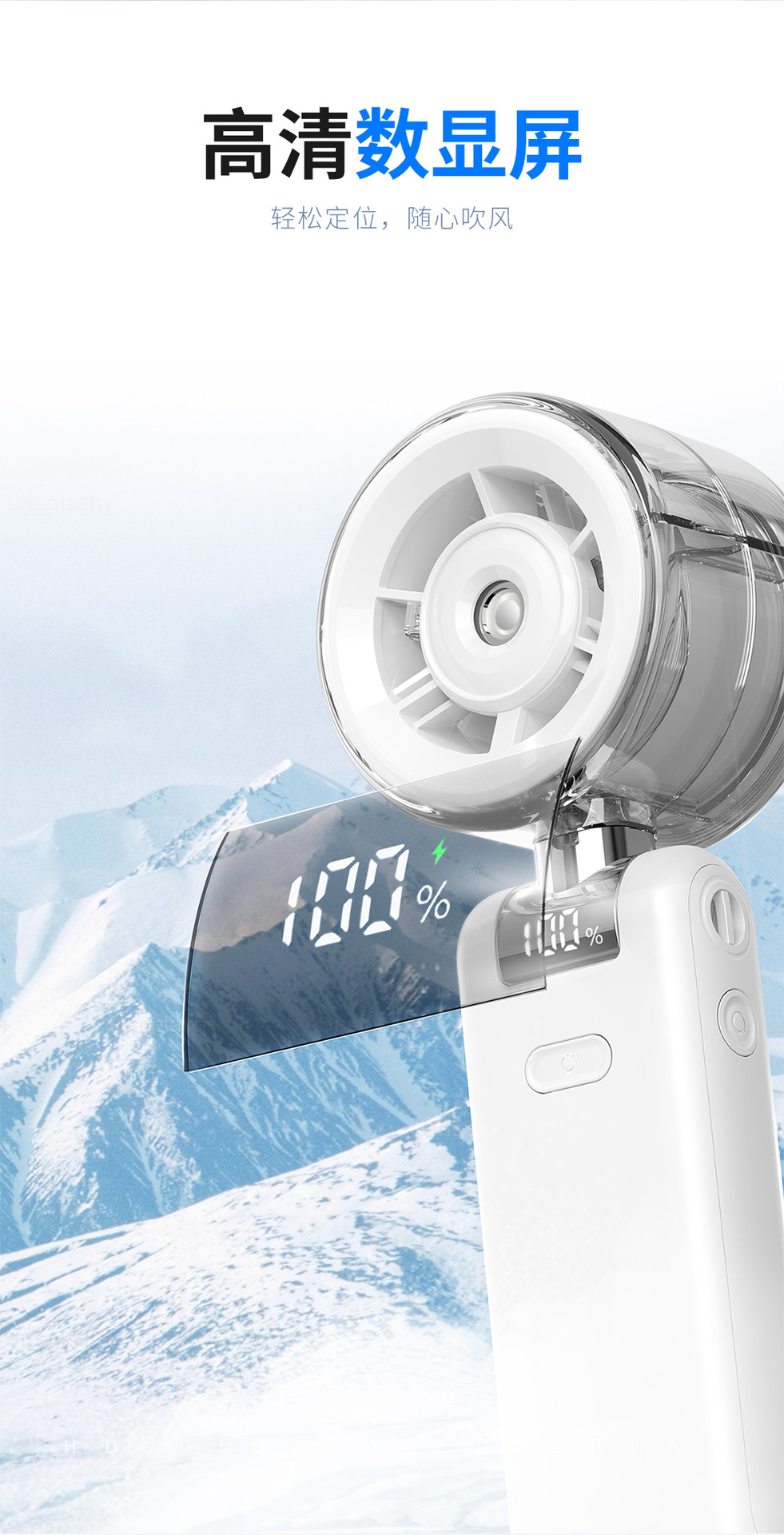 2026新款折叠喷雾手持风扇 便携式数显5档高速手持户外充电小风扇