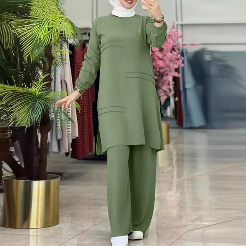 H712#穆斯林女装纯色两件套服装运动服气质优雅长袖衬衫阔腿裤套