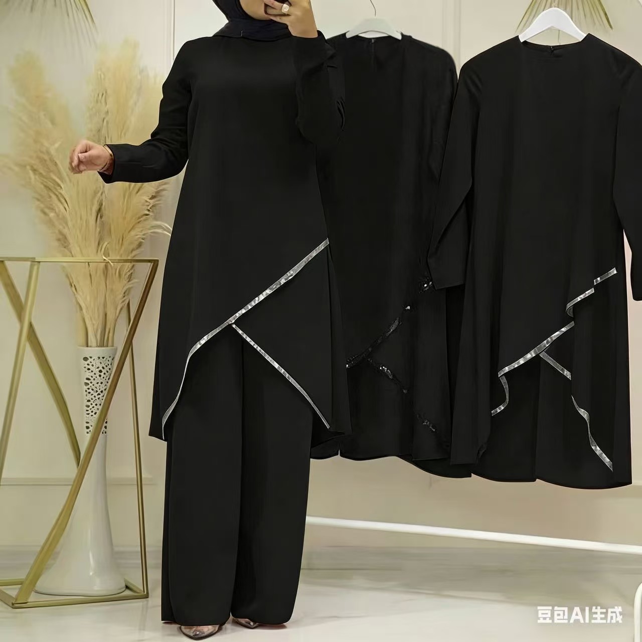 现货 女装纯色圆领长袖上衣宽松直筒休闲裤两件套装