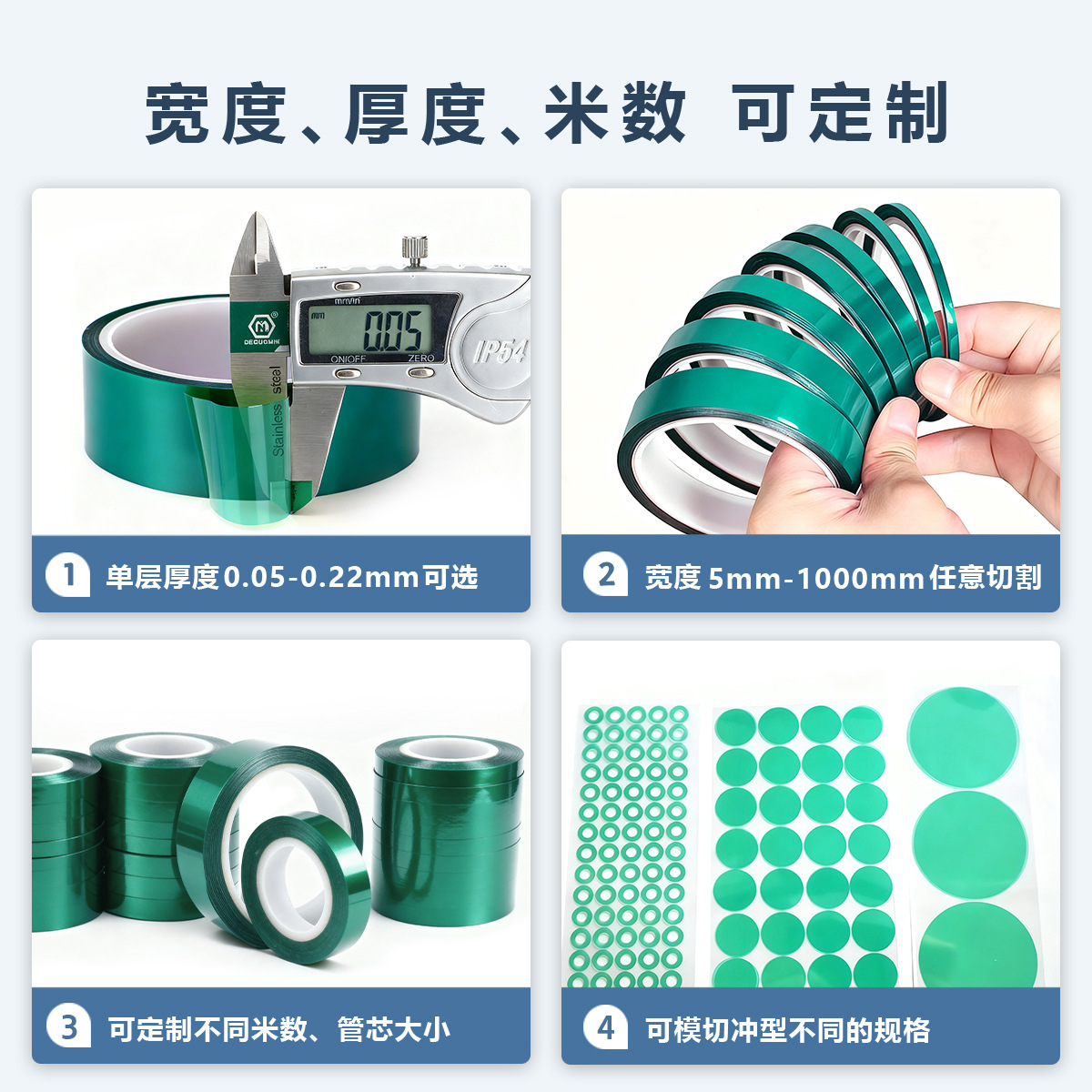 | green 0.05mm thickness (temperature resistance 220 ℃); any width and length can be customized, contact customer service for quotation!(绿色0.05mm厚度(耐温220℃);任意宽度、长度均可定制,联系客服报价!) | USD $22.53 | 657 roll available |