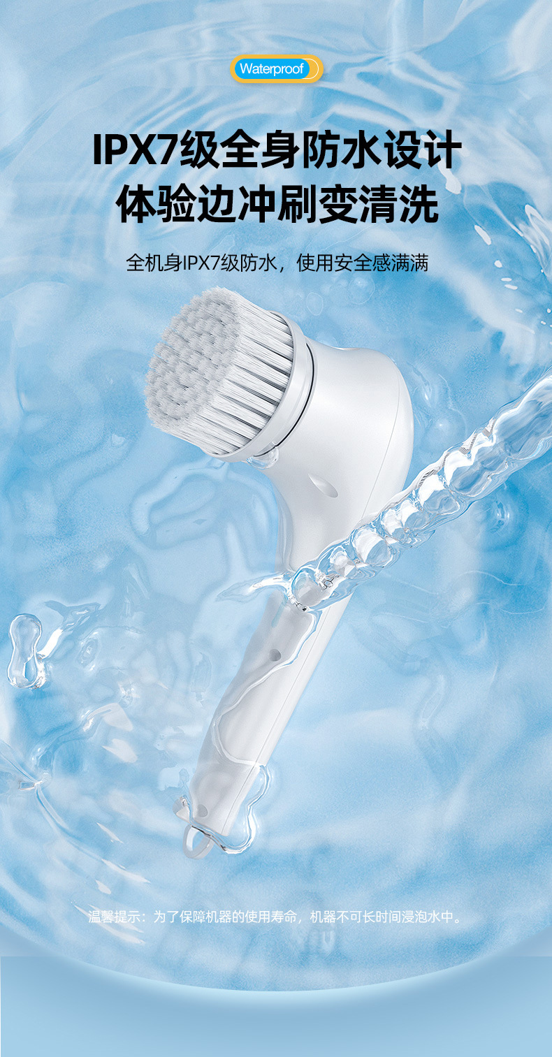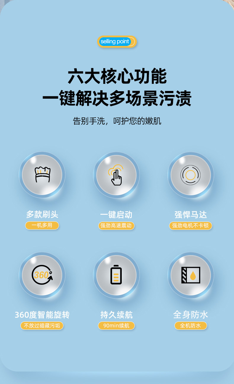 产品包含:主机+充电线+绒布刷头+尼龙刷头+海绵刷头+海绵百洁布+钢丝球刷头