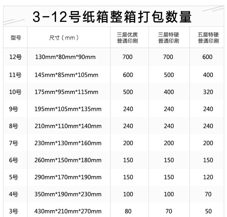 | 12(130*80*90mm);三层特硬(普通印刷S) | USD $0.07 | 312350 piece available |