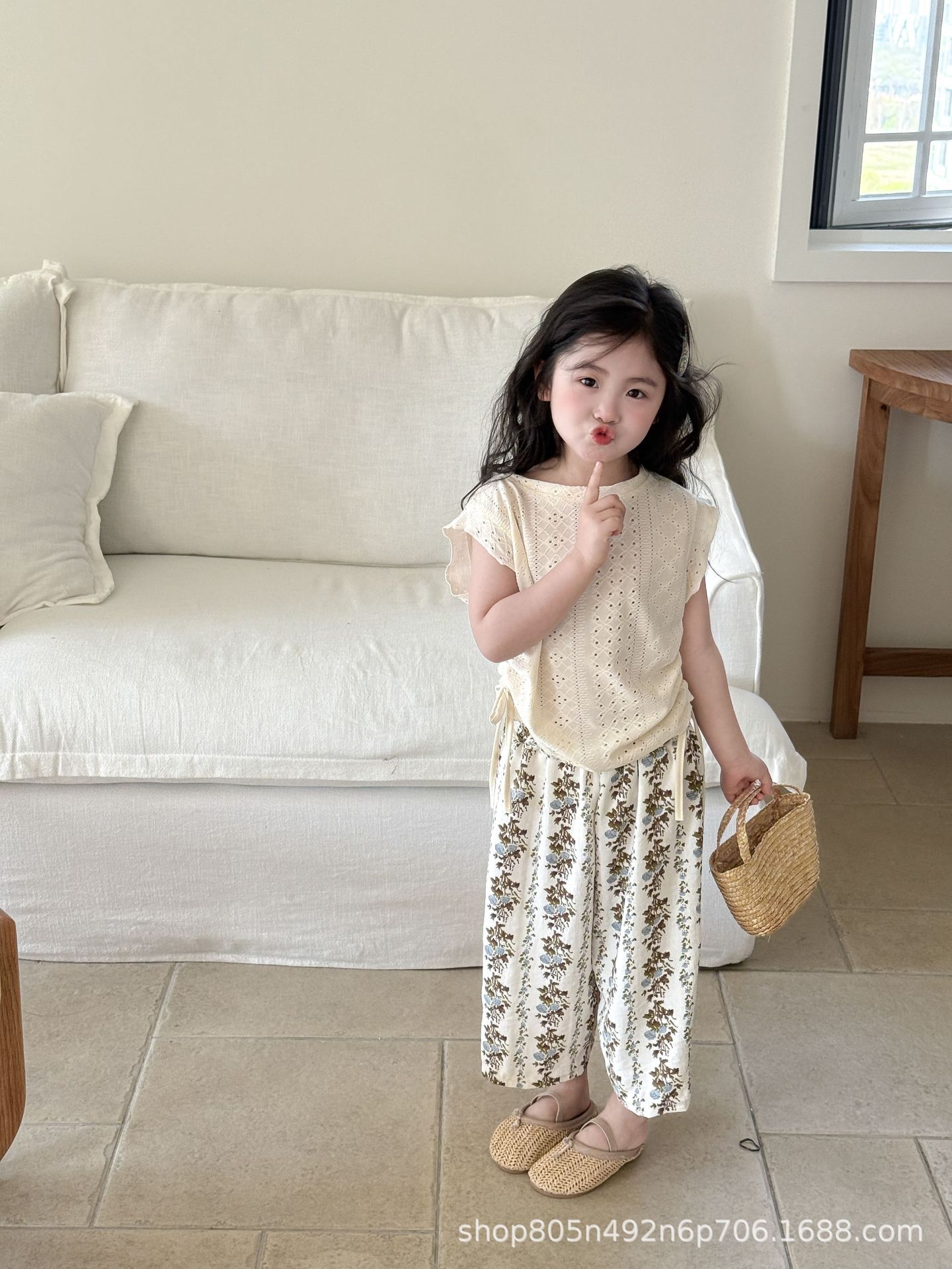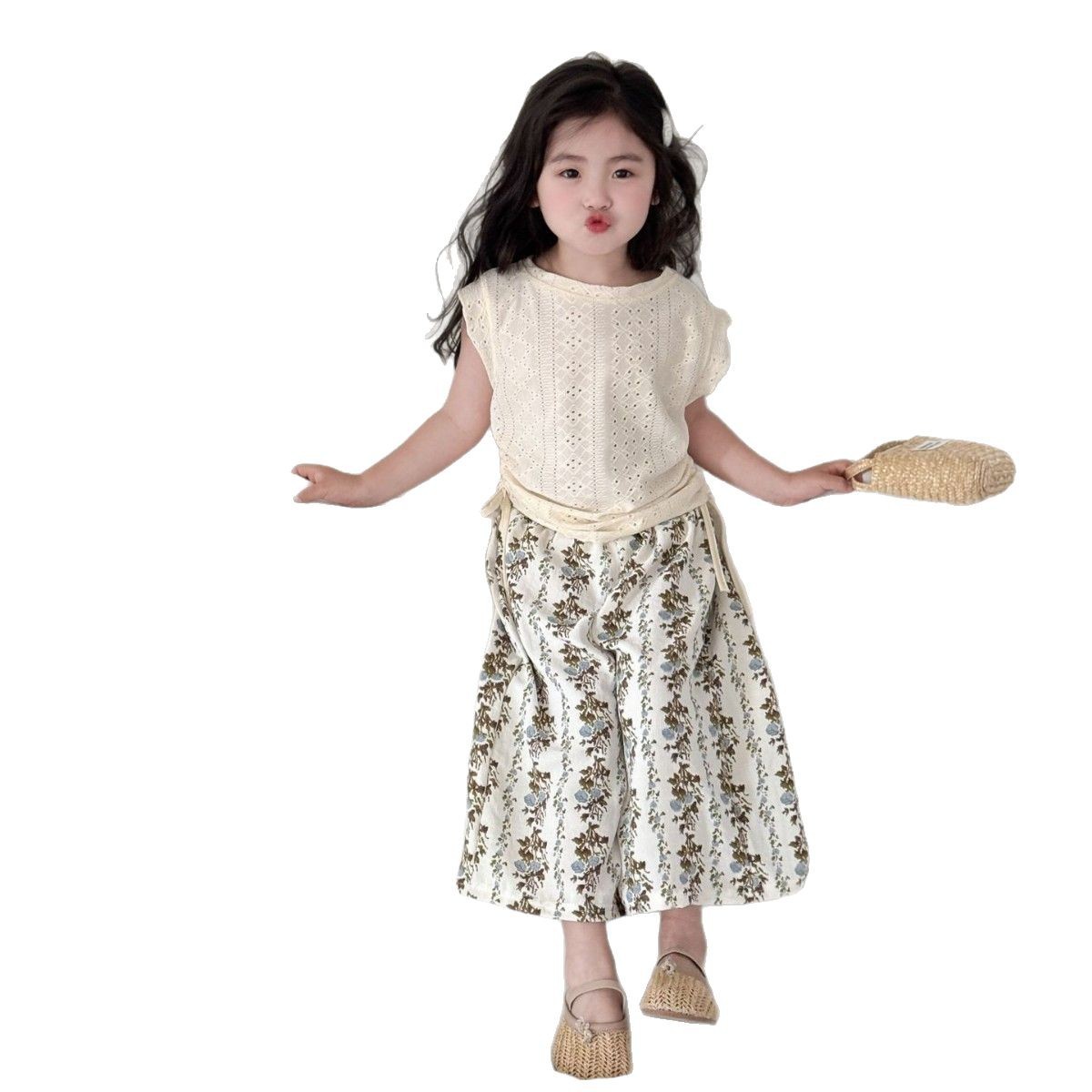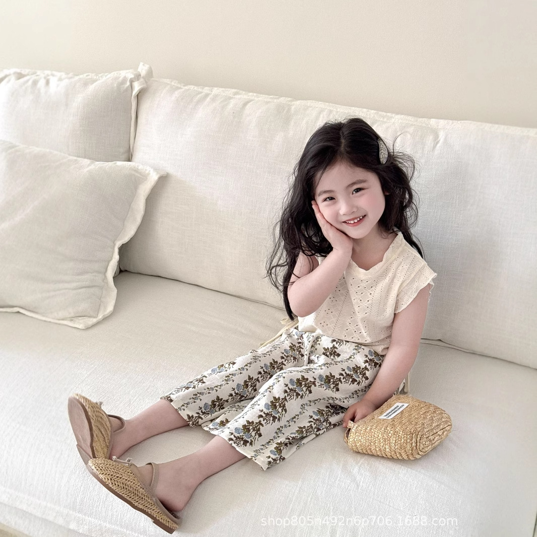 女童夏季套装儿童洋气透气网眼时尚上衣女宝碎花阔腿裤休闲中小童