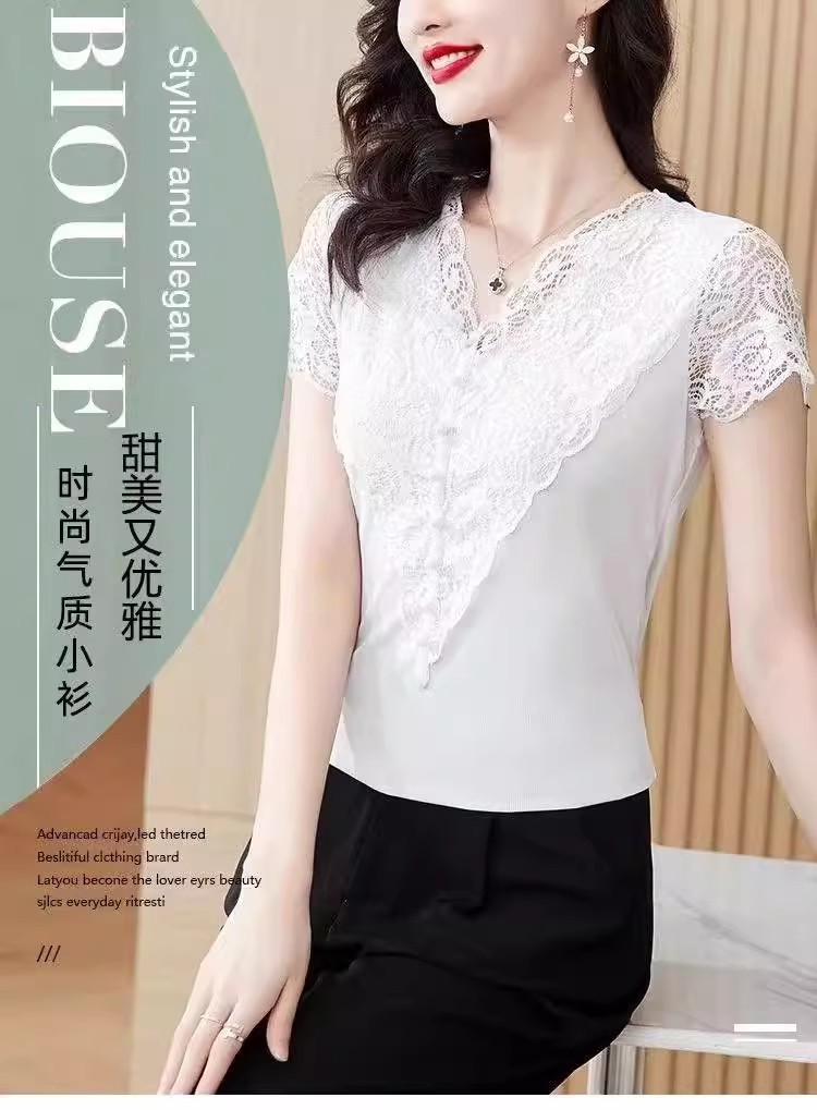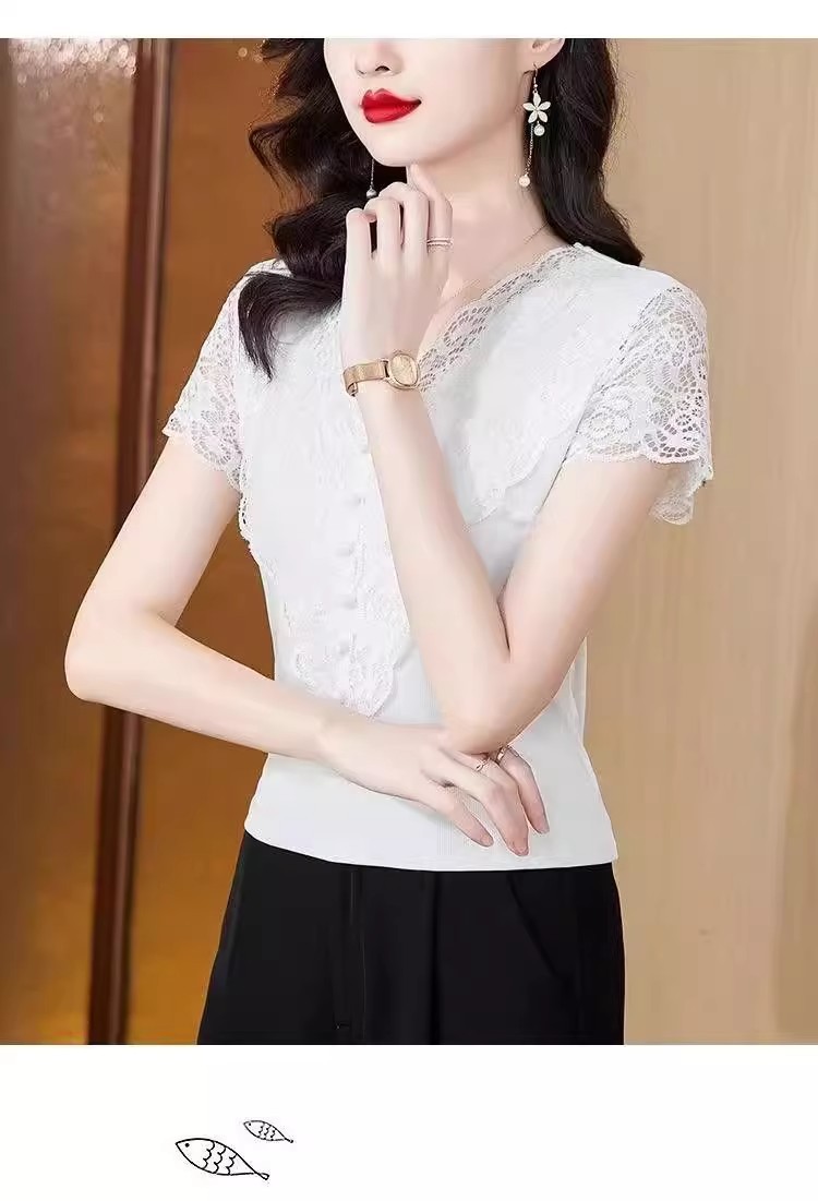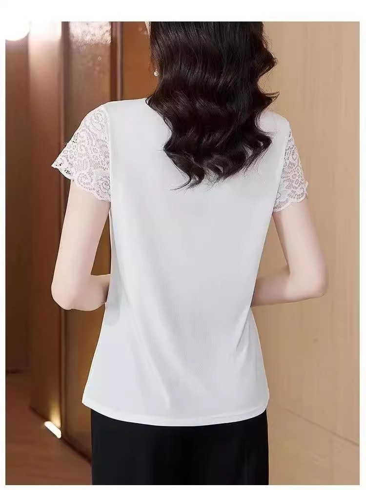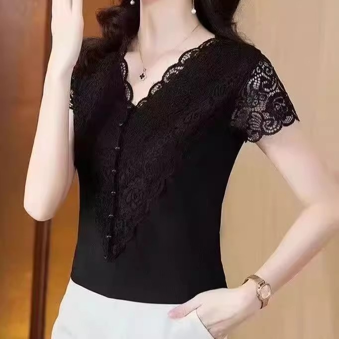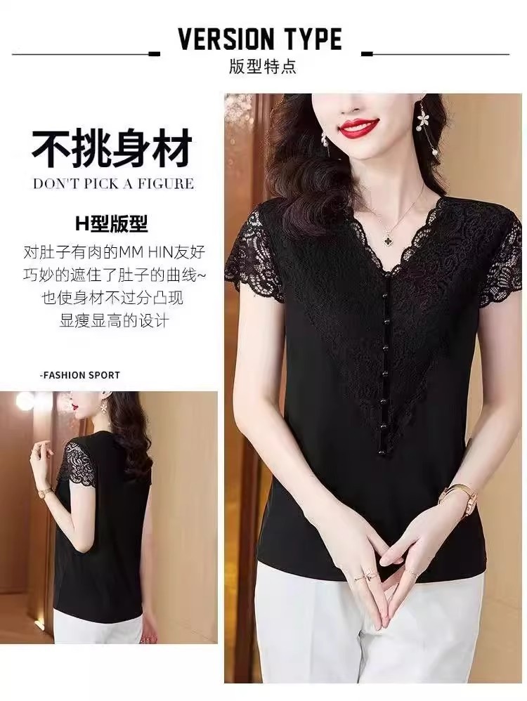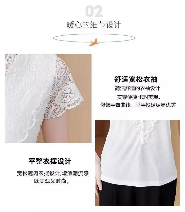 夏季新款大码蕾丝拼接设计2025韩版气质上衣显瘦遮肉短袖打底洋气