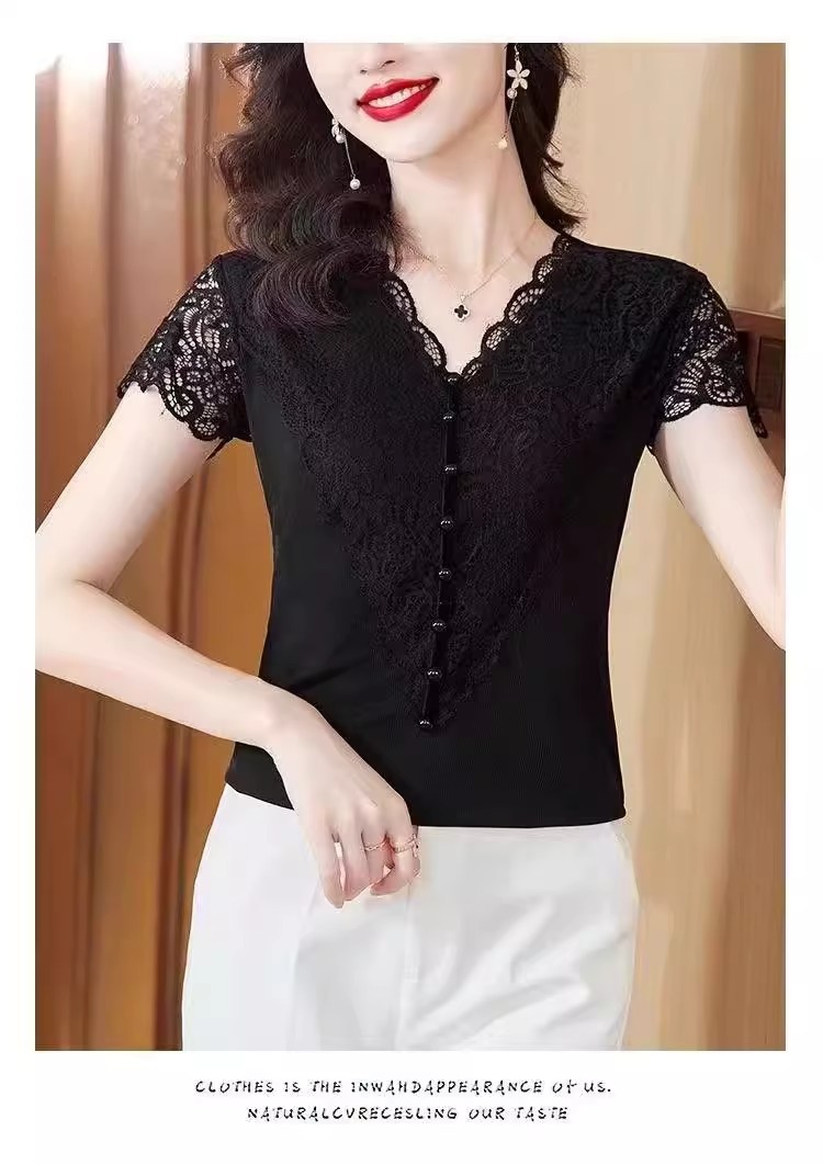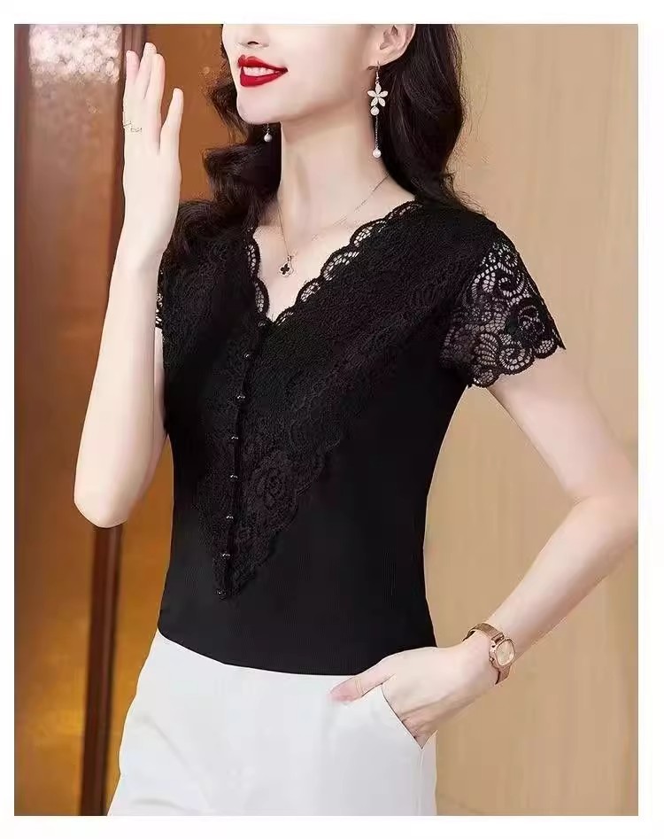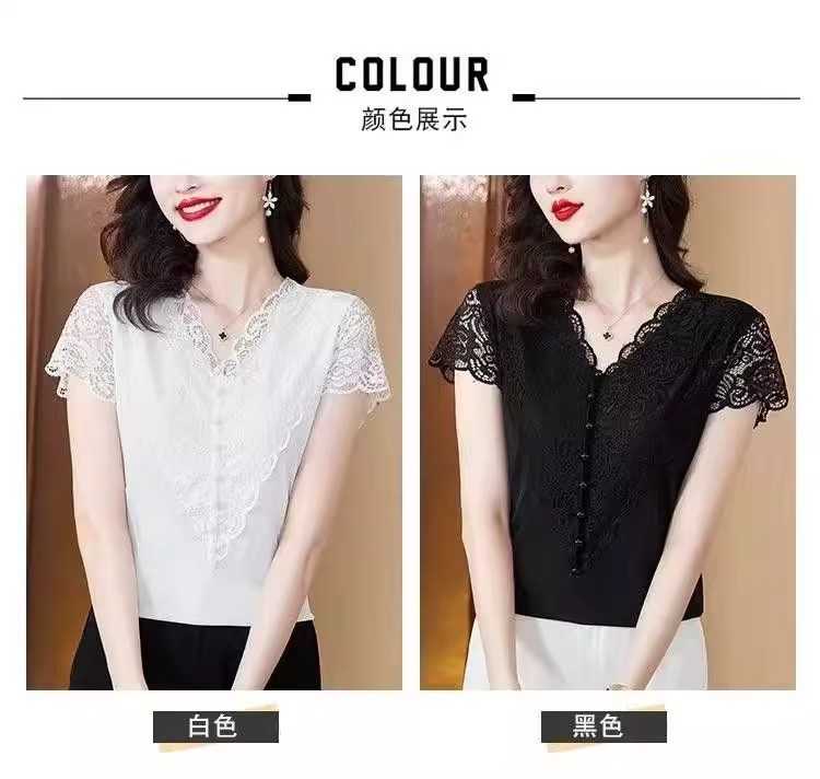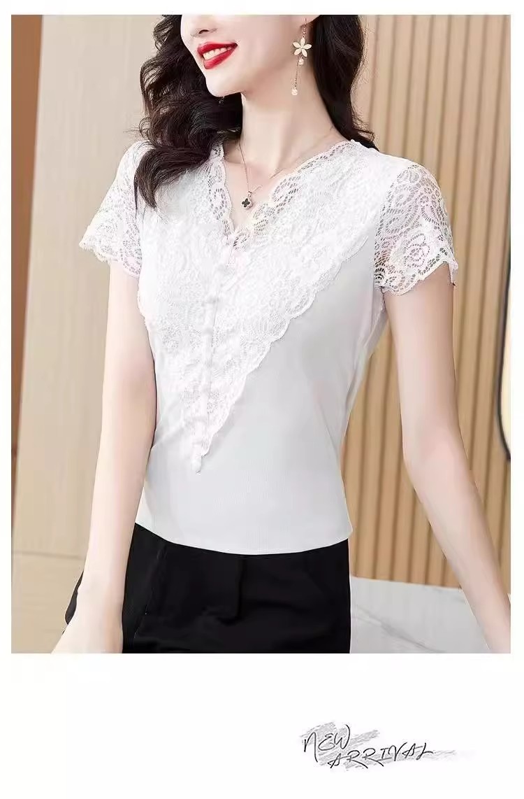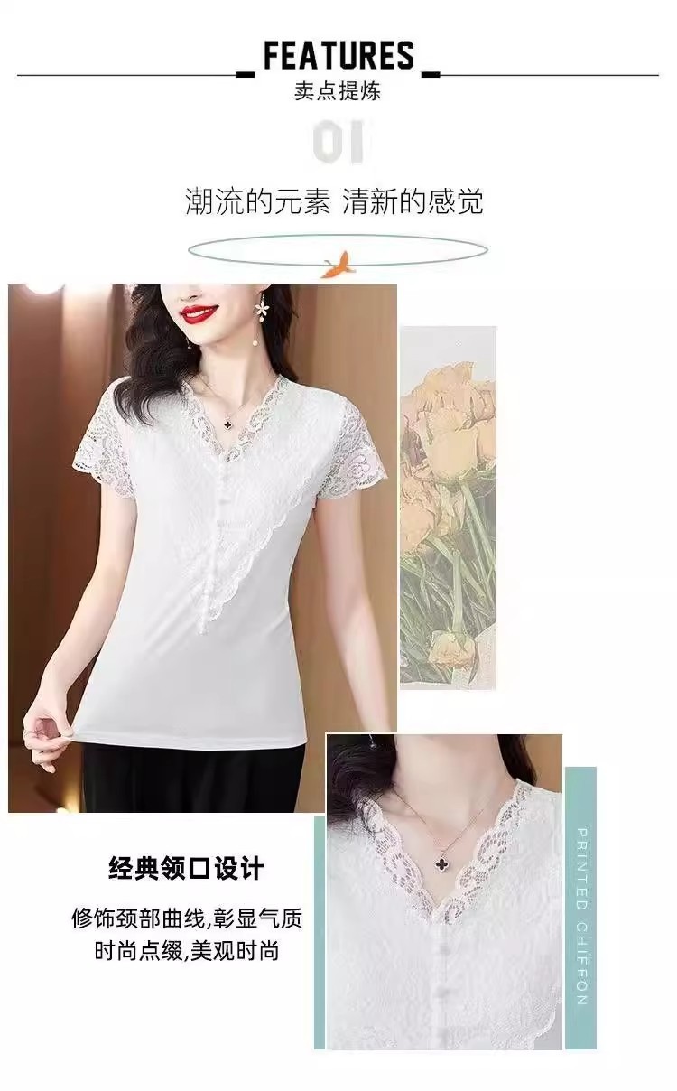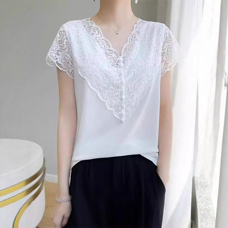 夏季新款大码蕾丝拼接设计2025韩版气质上衣显瘦遮肉短袖打底洋气