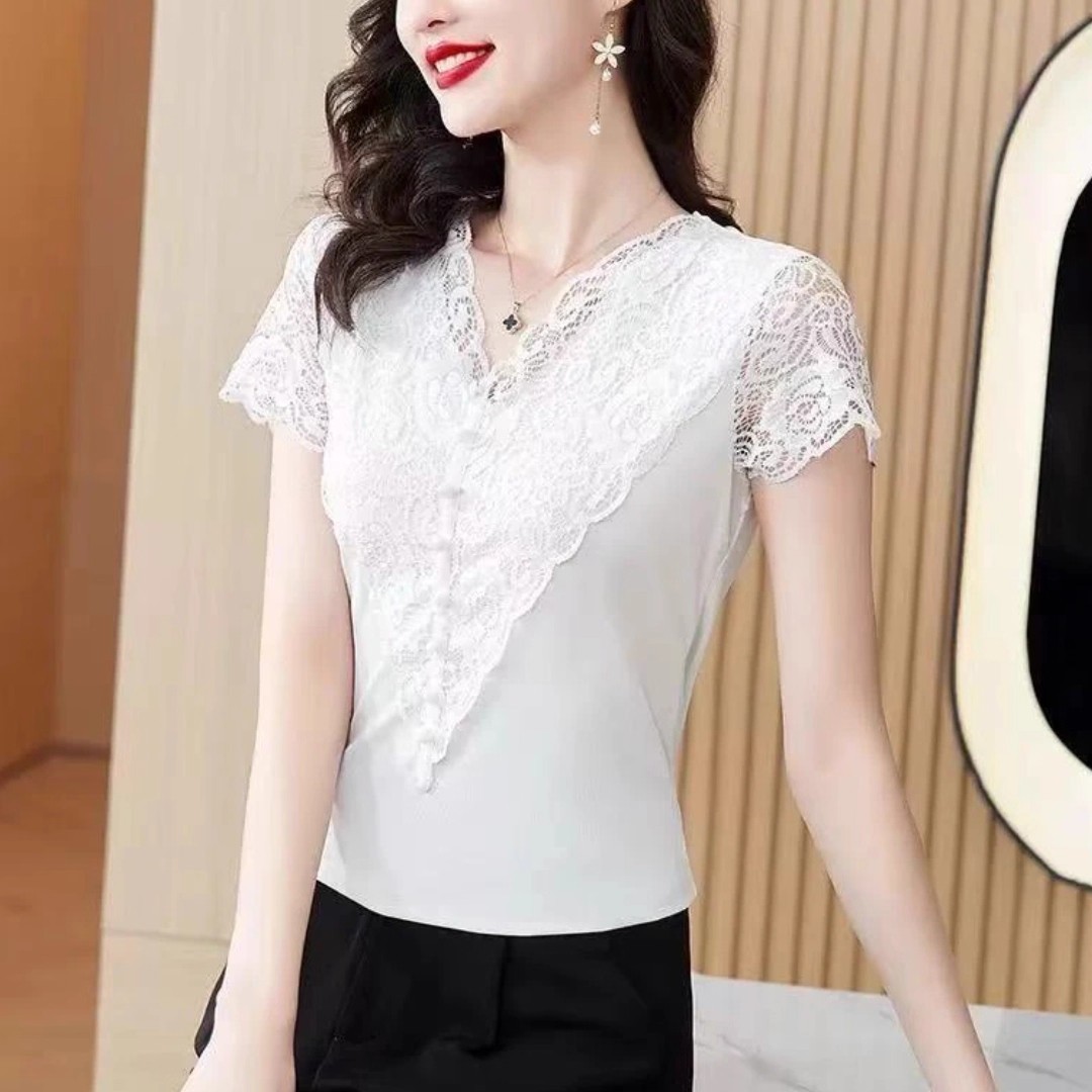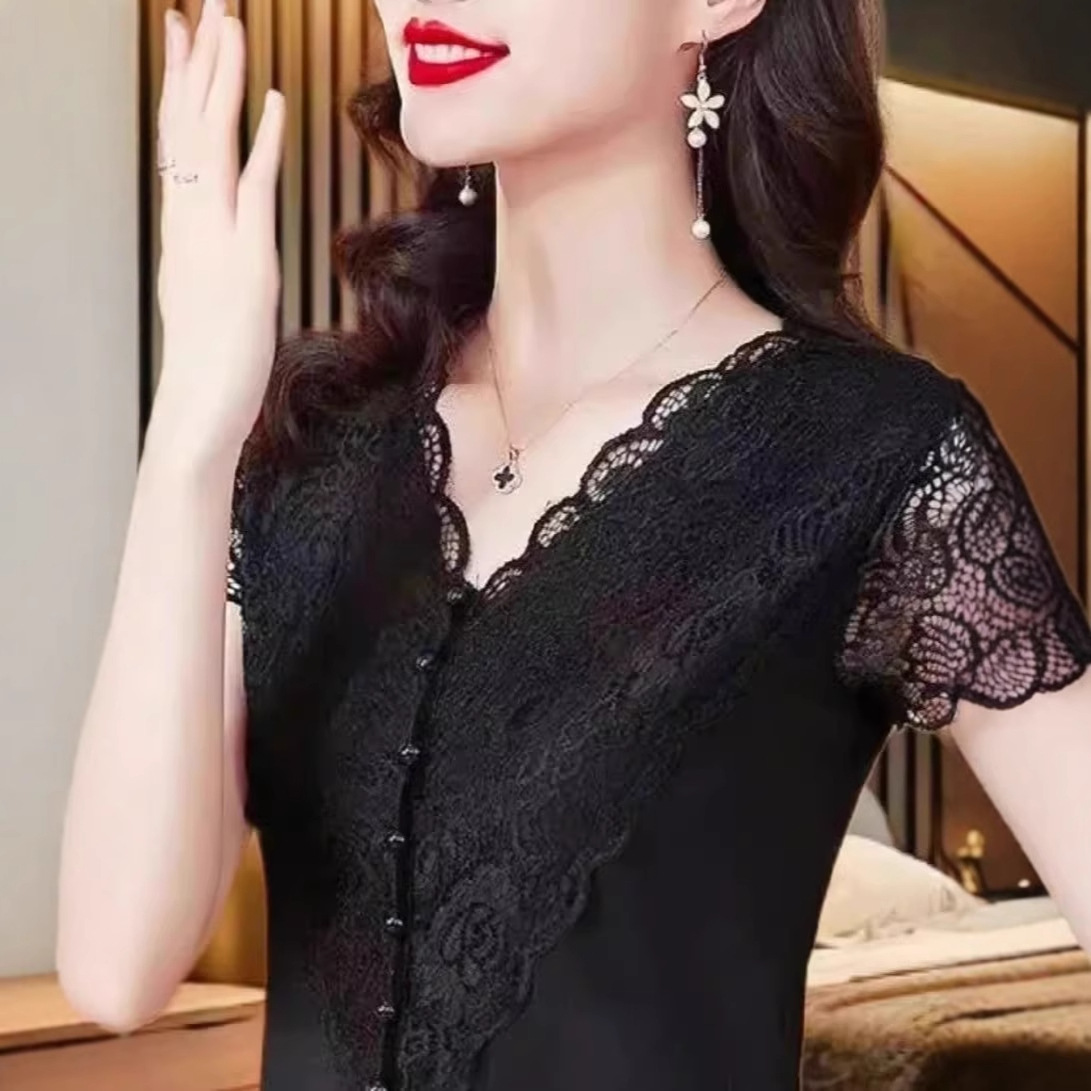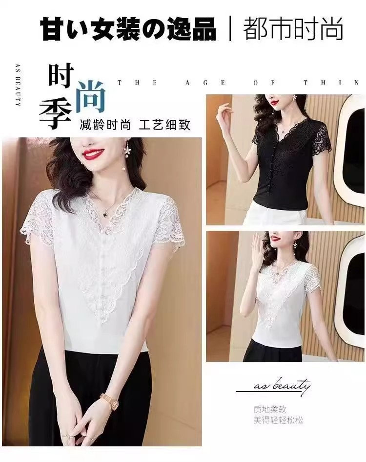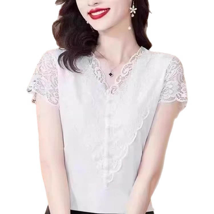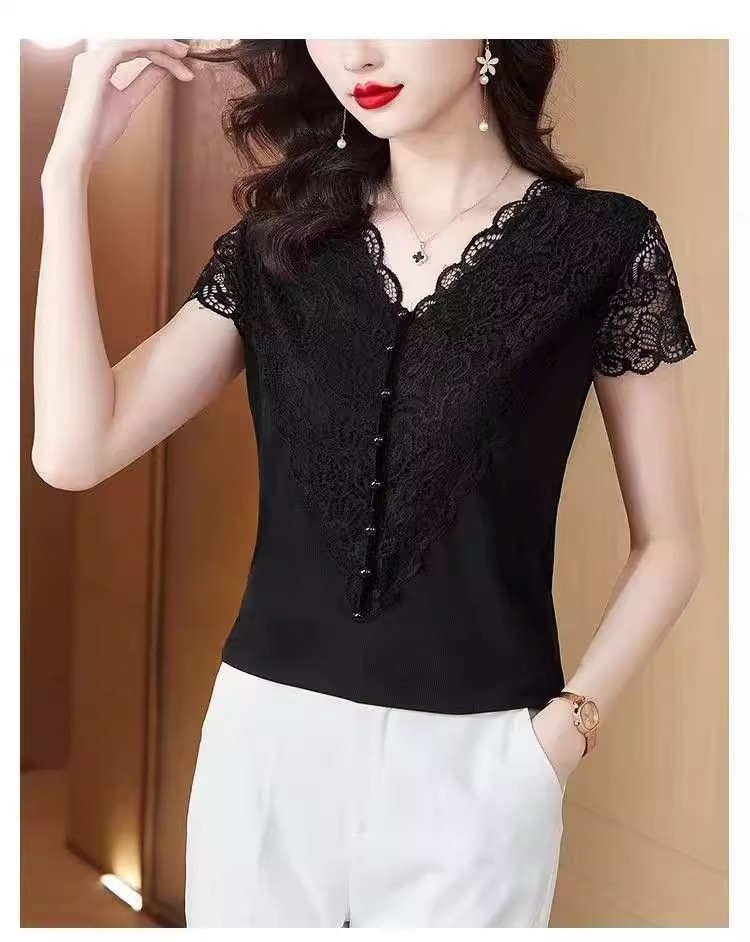 夏季新款大码蕾丝拼接设计2025韩版气质上衣显瘦遮肉短袖打底洋气