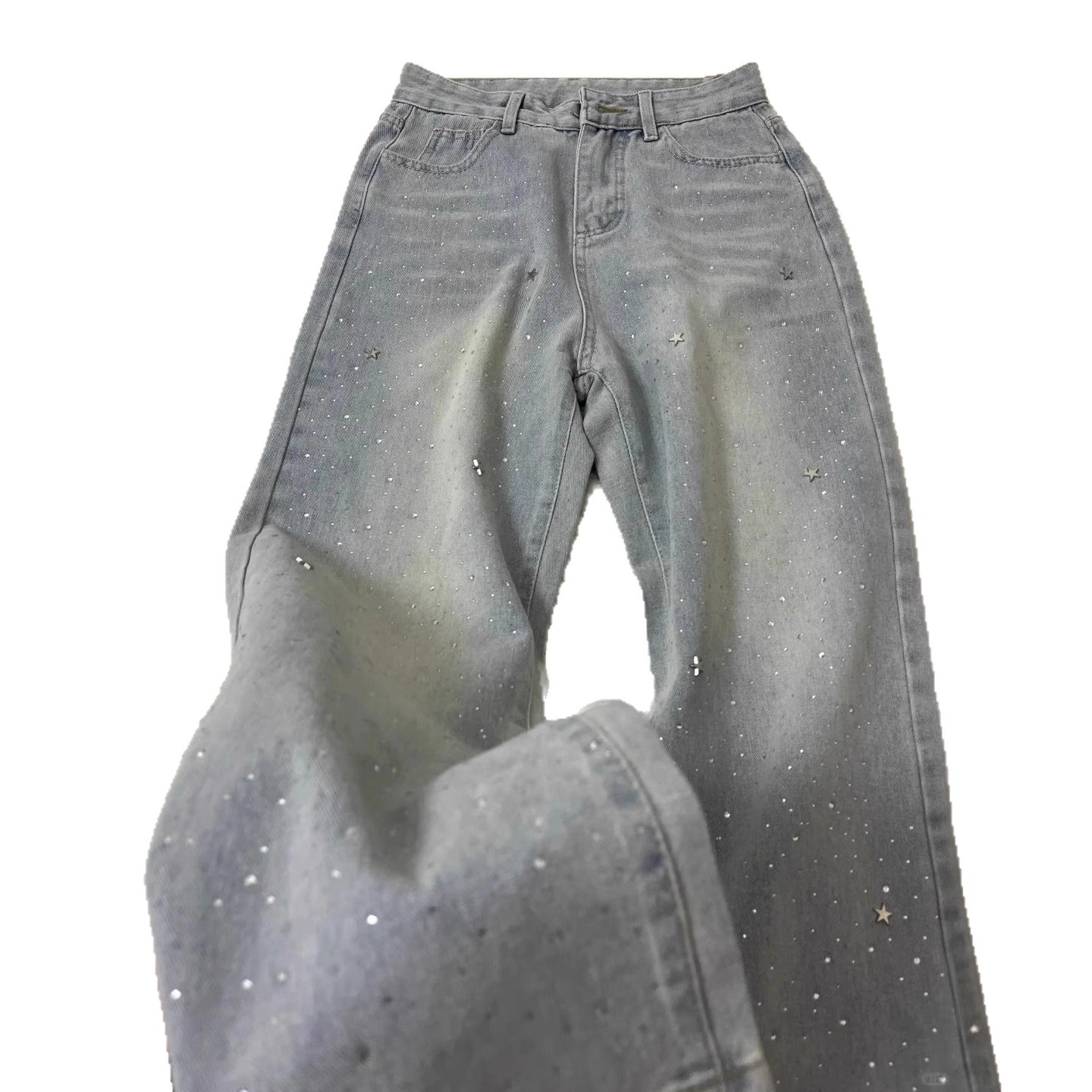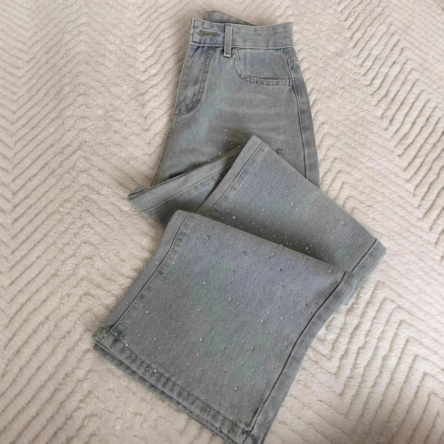 浅色亮闪闪直筒牛仔裤女春秋季新款胖mm高腰宽松显瘦重工垂感长裤