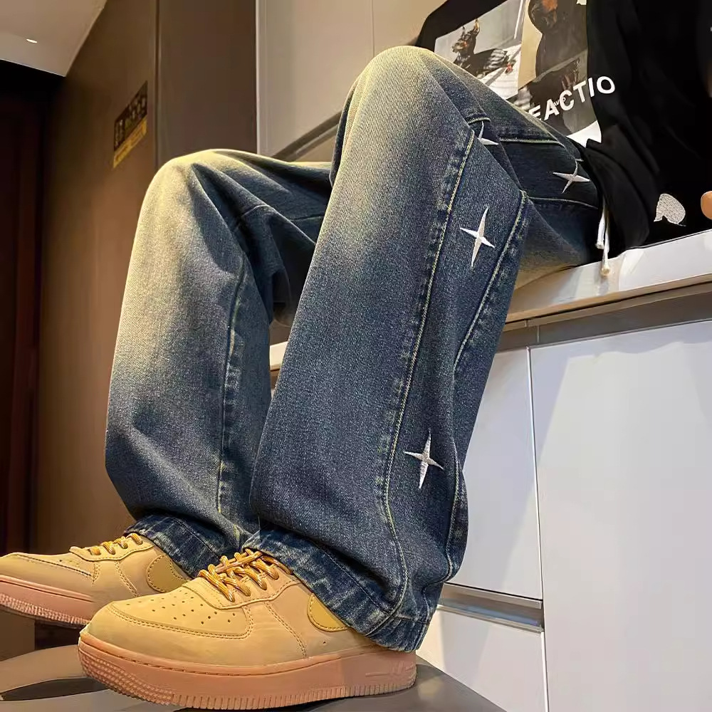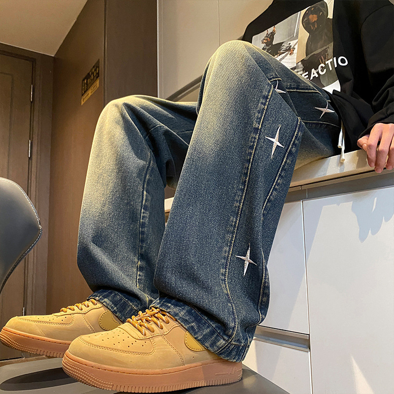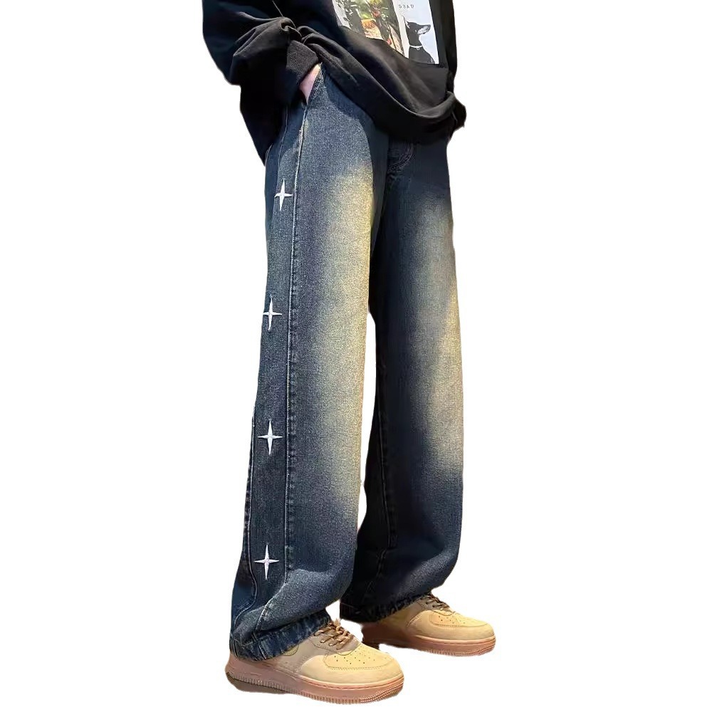 美式高街hiphop星星刺绣牛仔裤男春秋夏季薄款宽松直筒男生长裤子