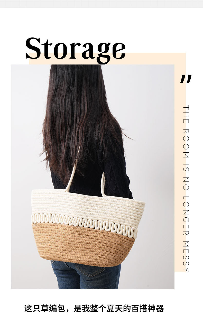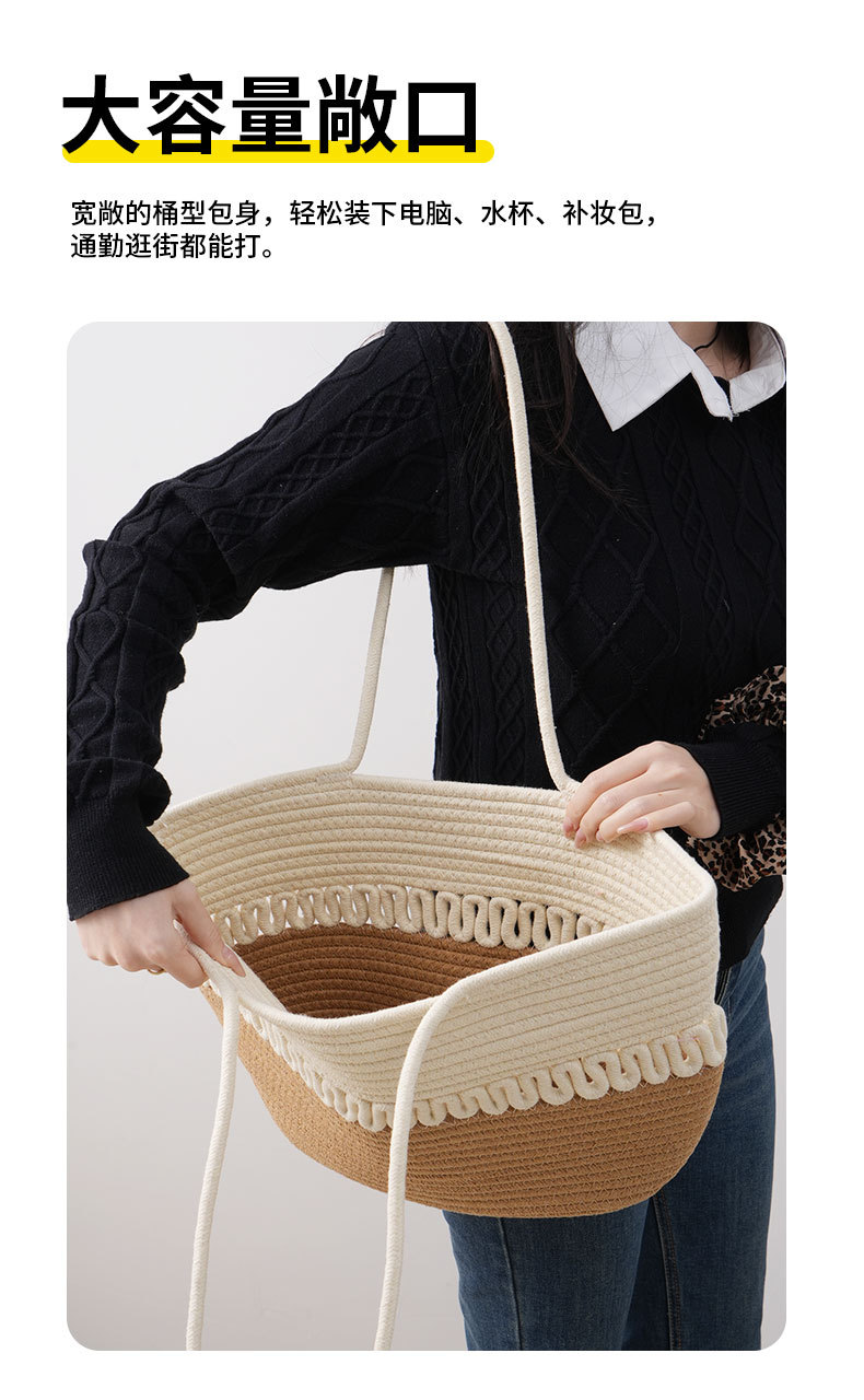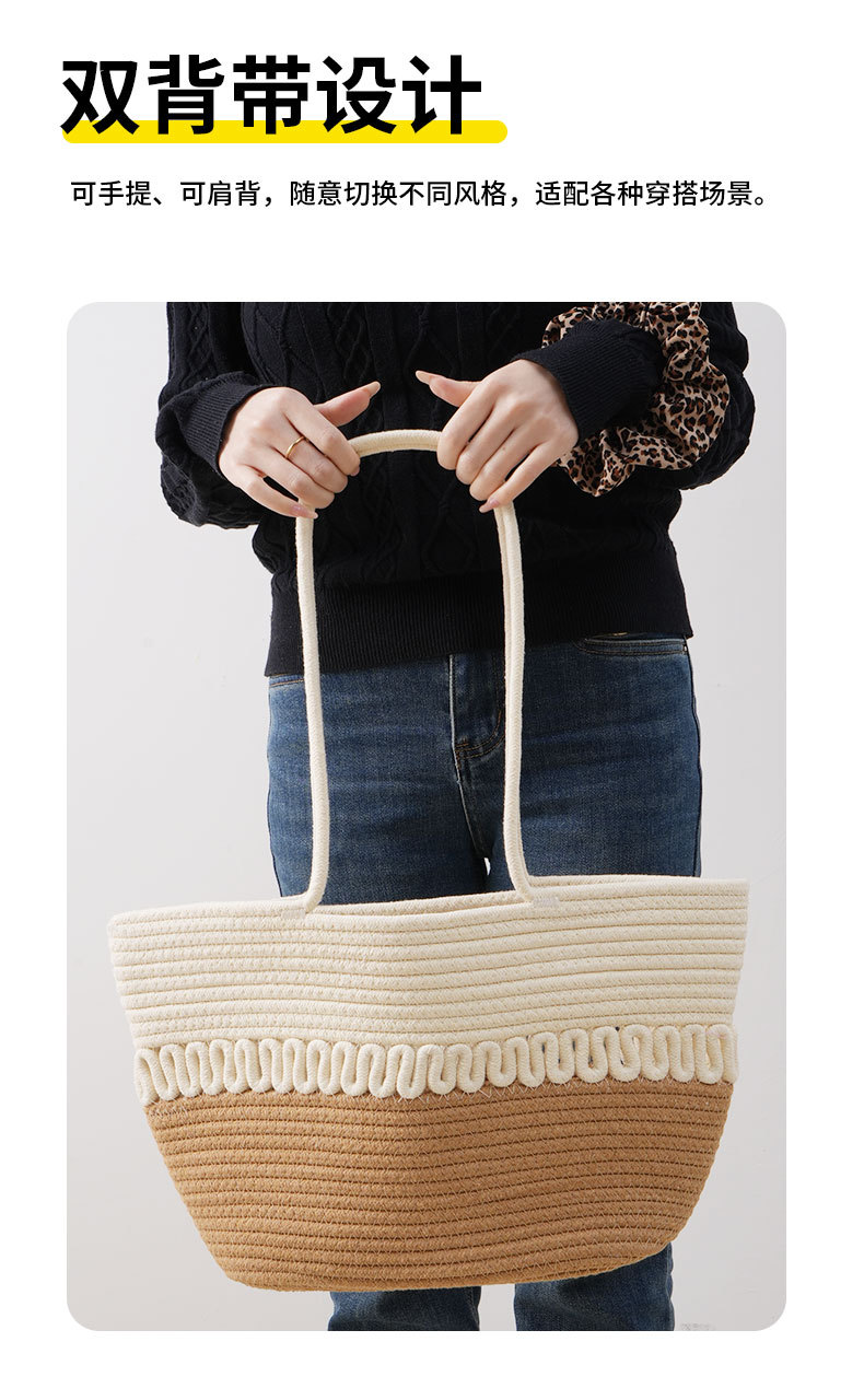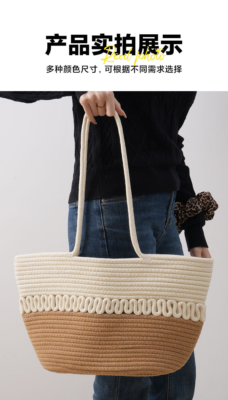 拼色花边编织包 大容量沙滩单肩菜篮子休闲简约托特包镂空 草编包