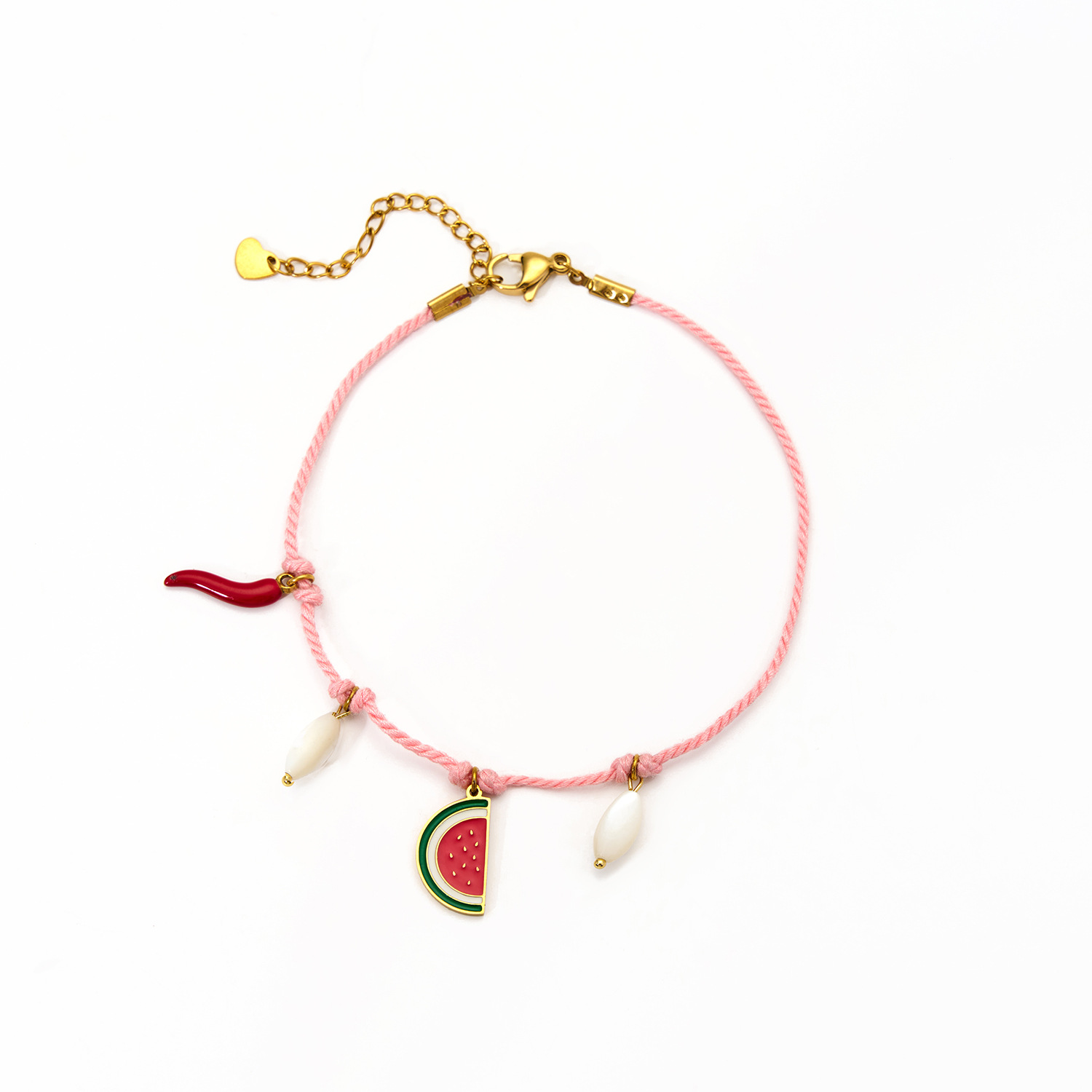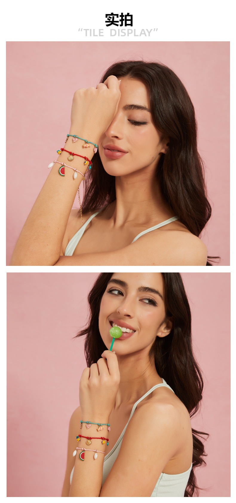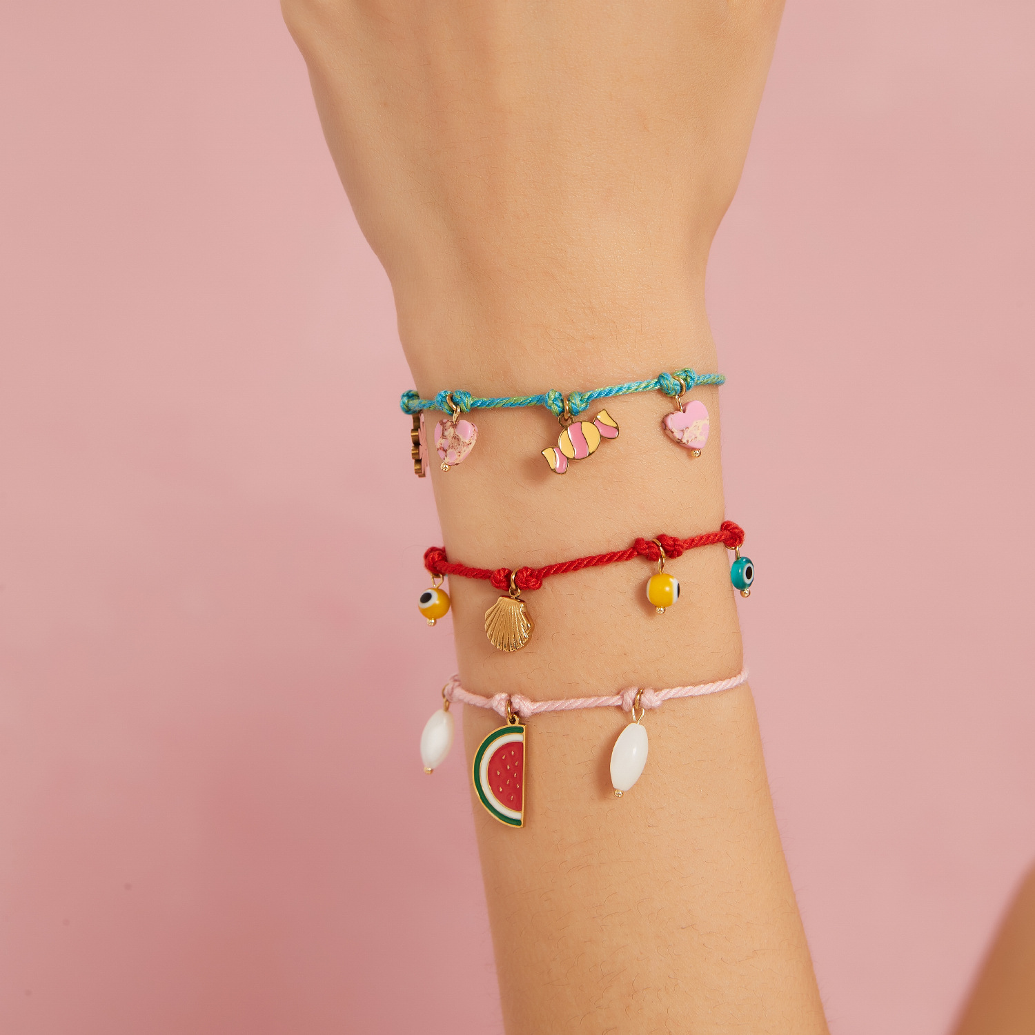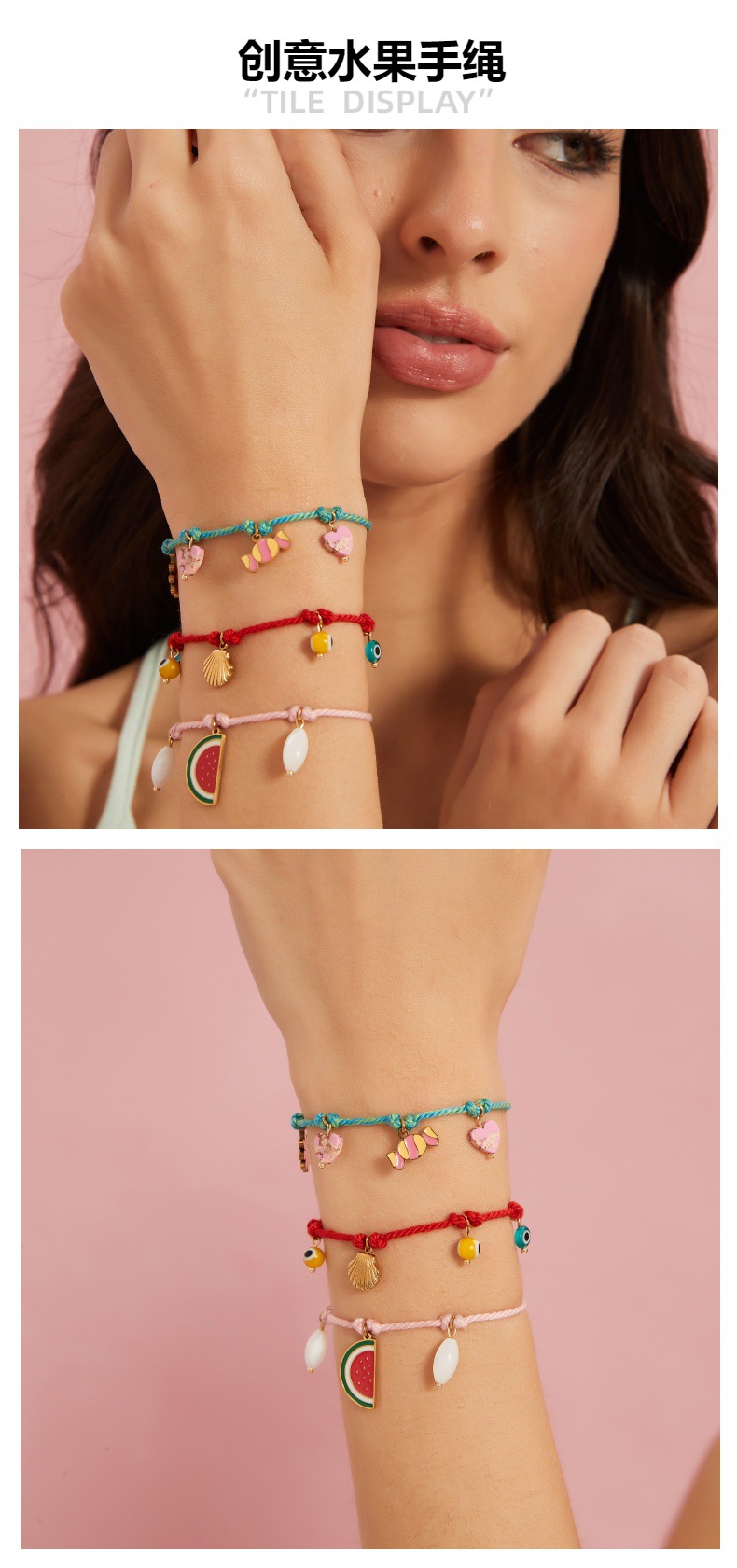 时尚创意棉绳手链搭配水果贝壳眼睛挂件个性多彩手工编织手绳批发