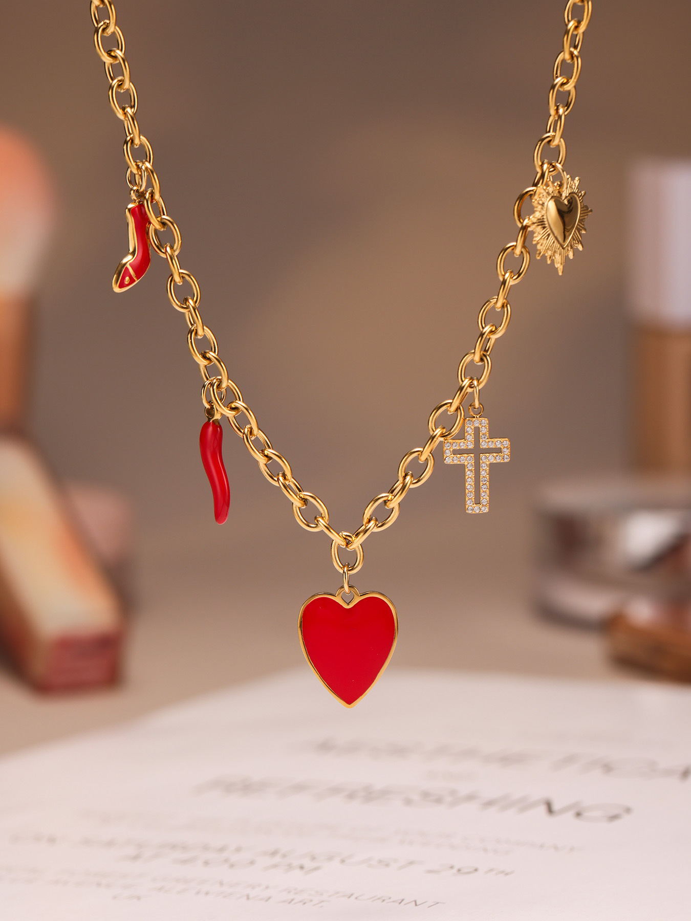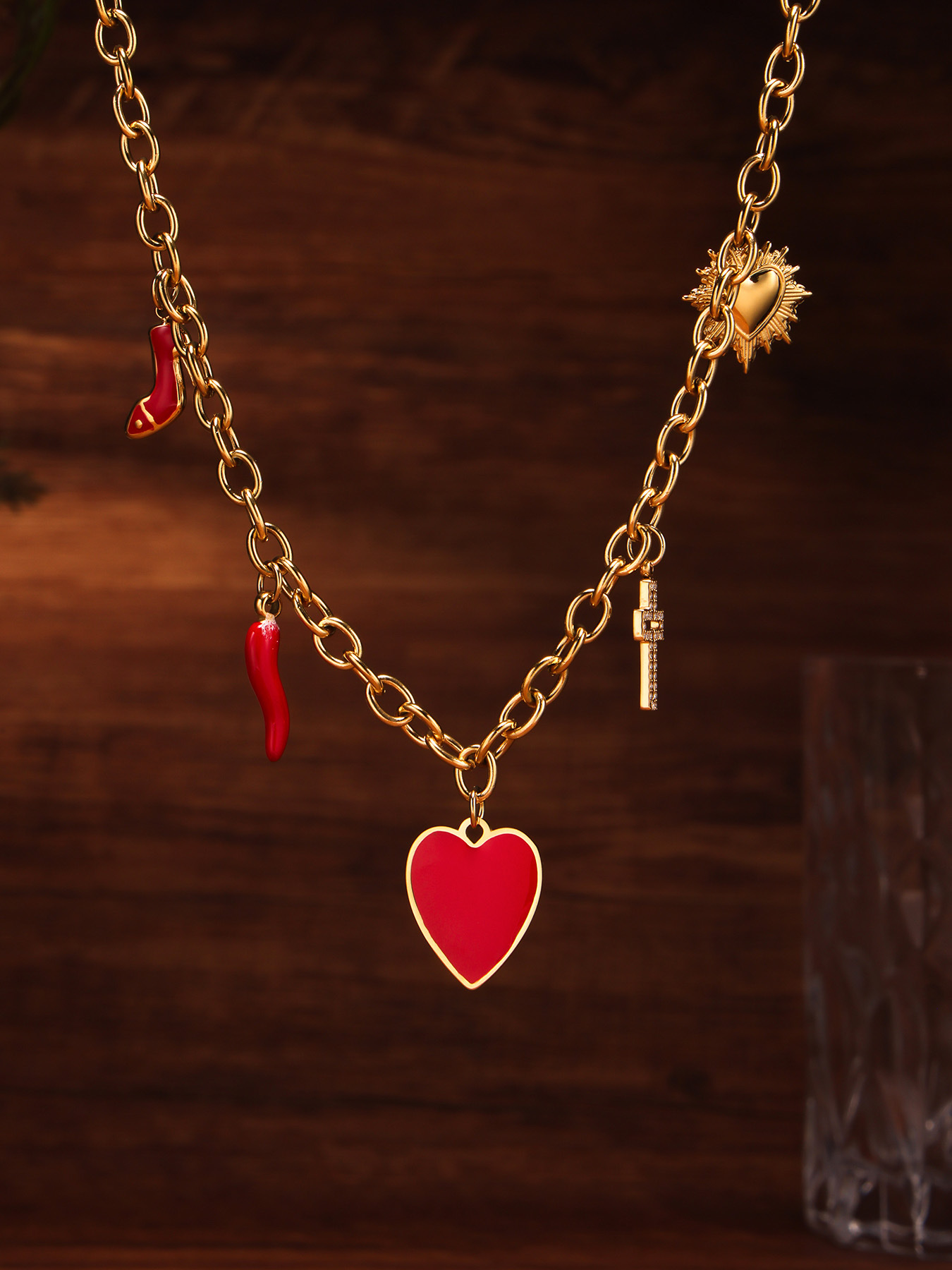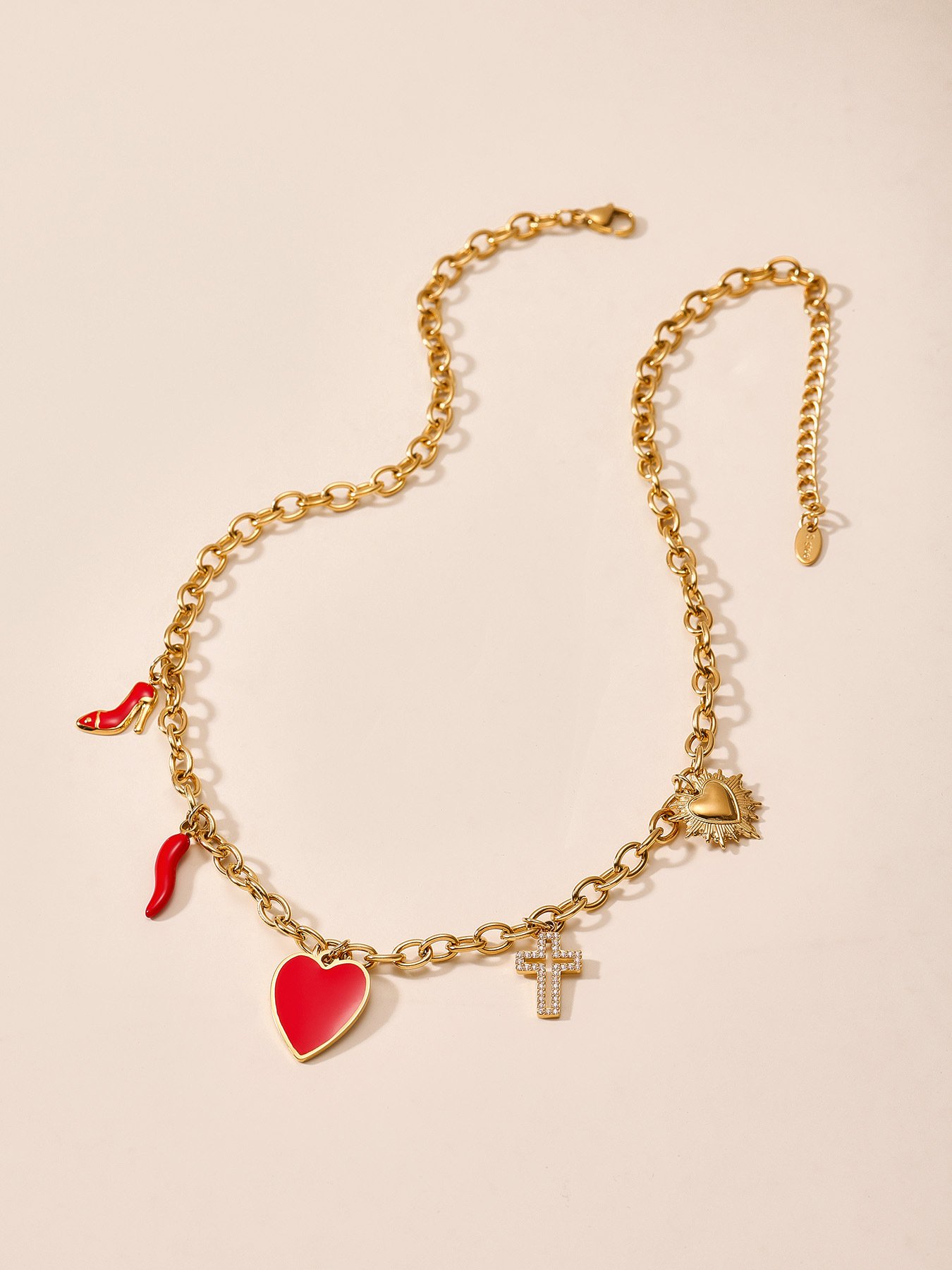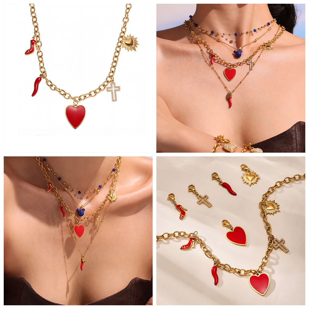 谜丽红色滴油多配件爱心高跟鞋十字架吊坠锁骨项链小众时尚流行款