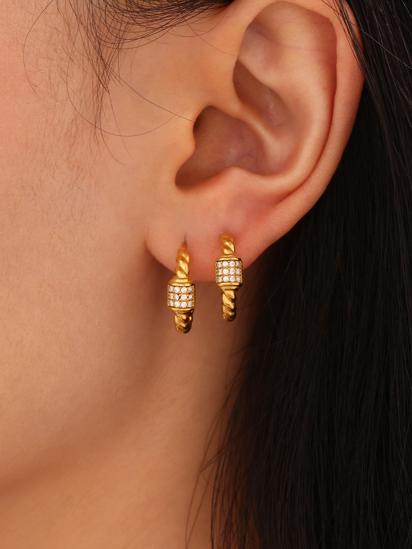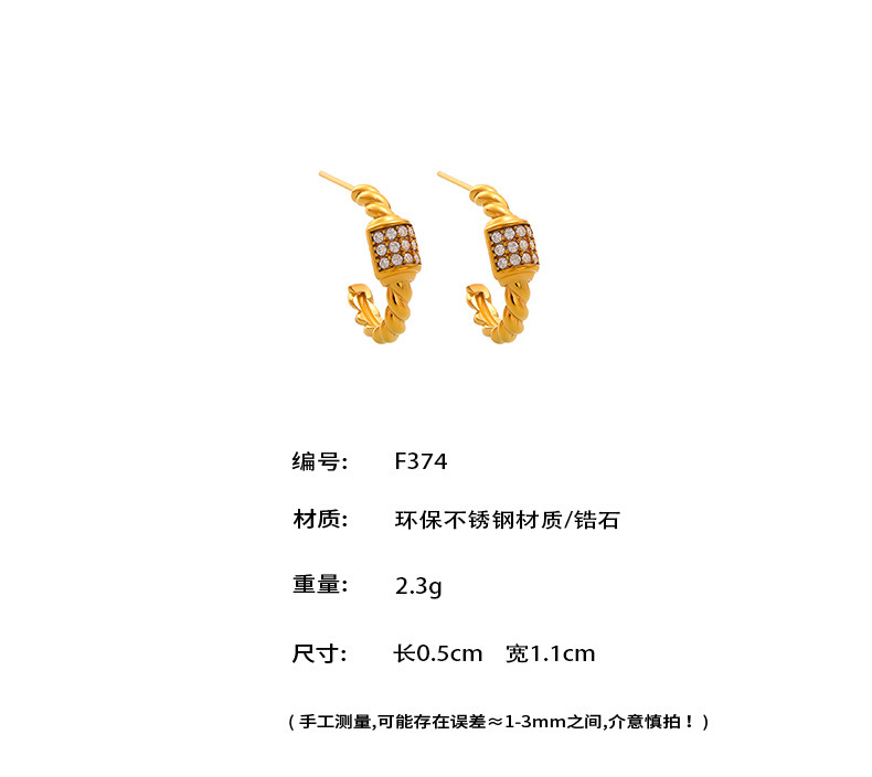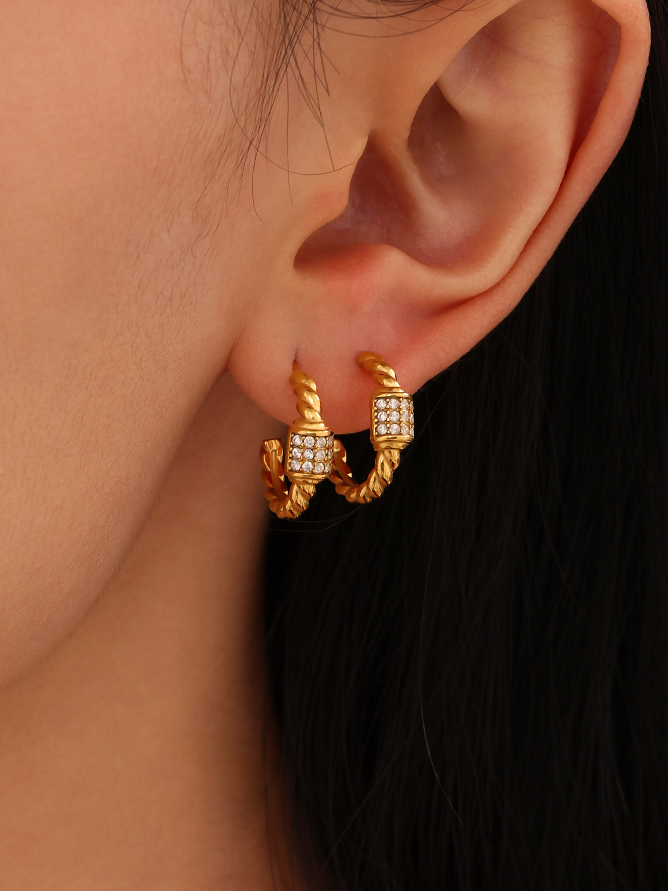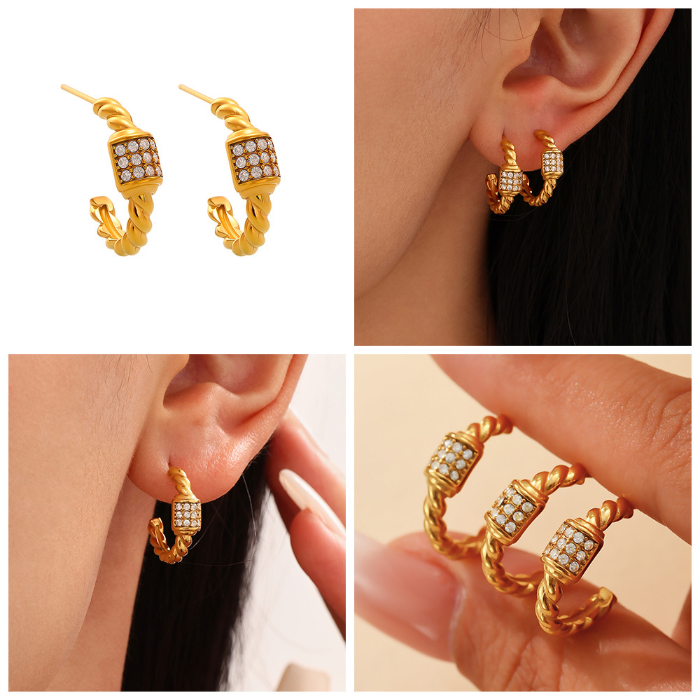 谜丽跨境轻奢C形麻花锆石耳环不锈钢18k金不掉色小众设计耳钉耳饰