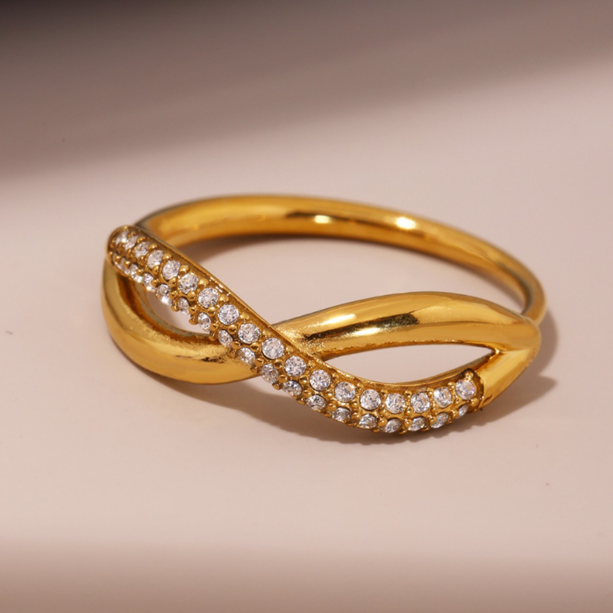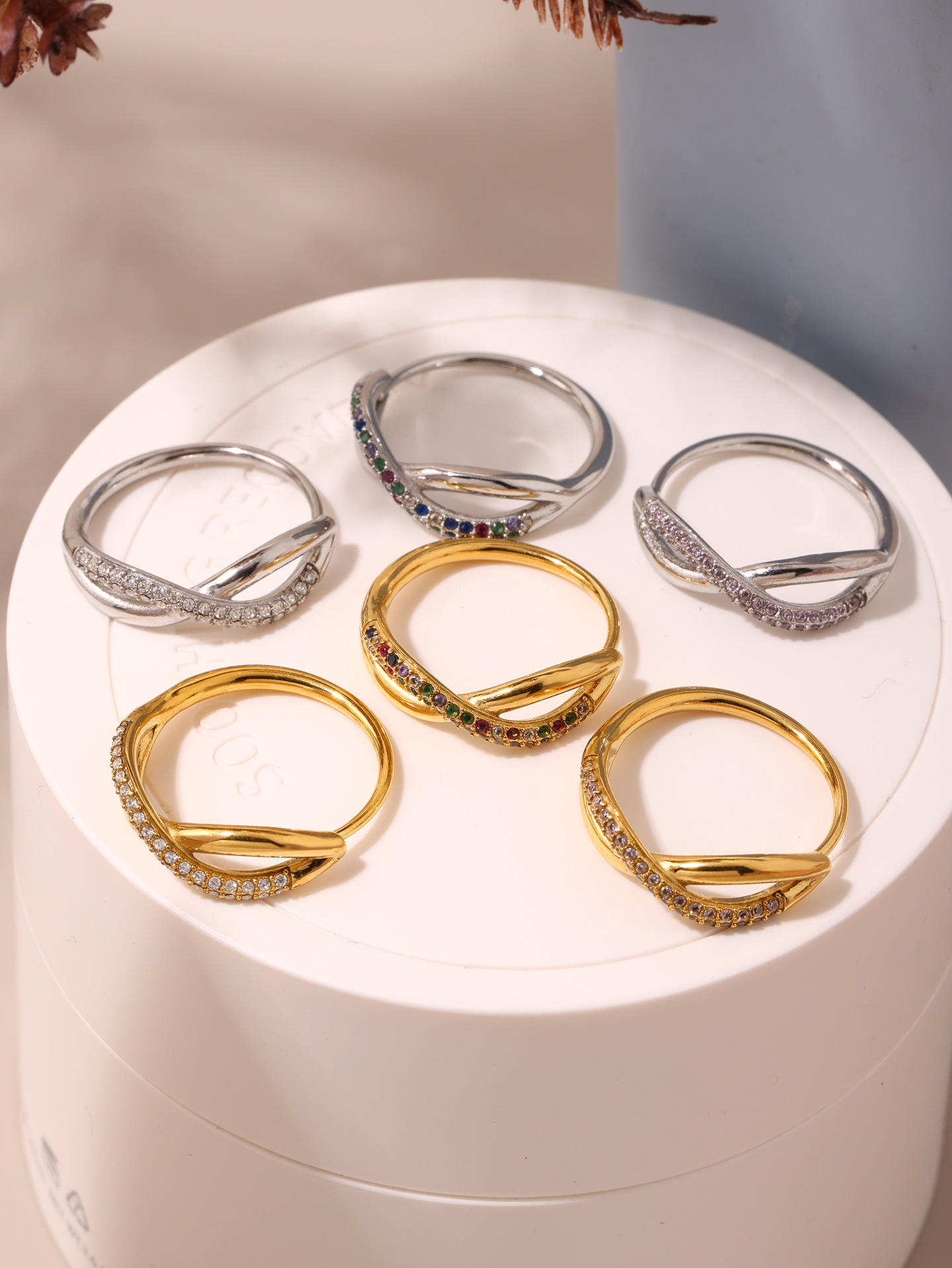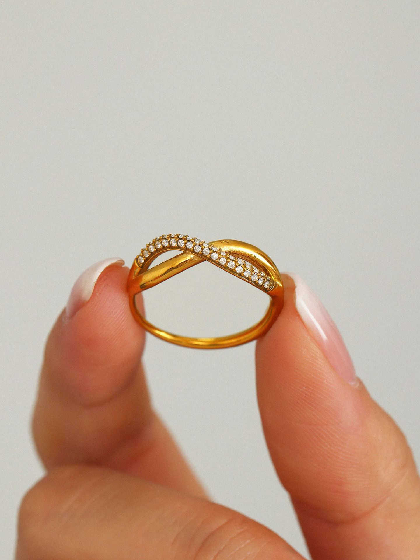 谜丽 新款彩色锆石交叉细麻花食指戒不锈钢镀18K真金小众通勤指环
